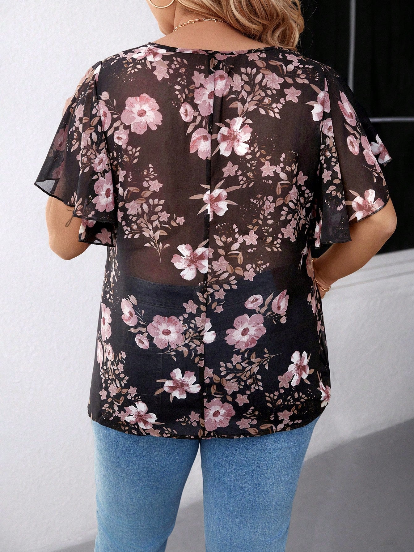 LUNE Elegant Commuter Casual Vacation Floral Pattern Fabric Round Neck Ruffle Sleeve Blouse, Fashion