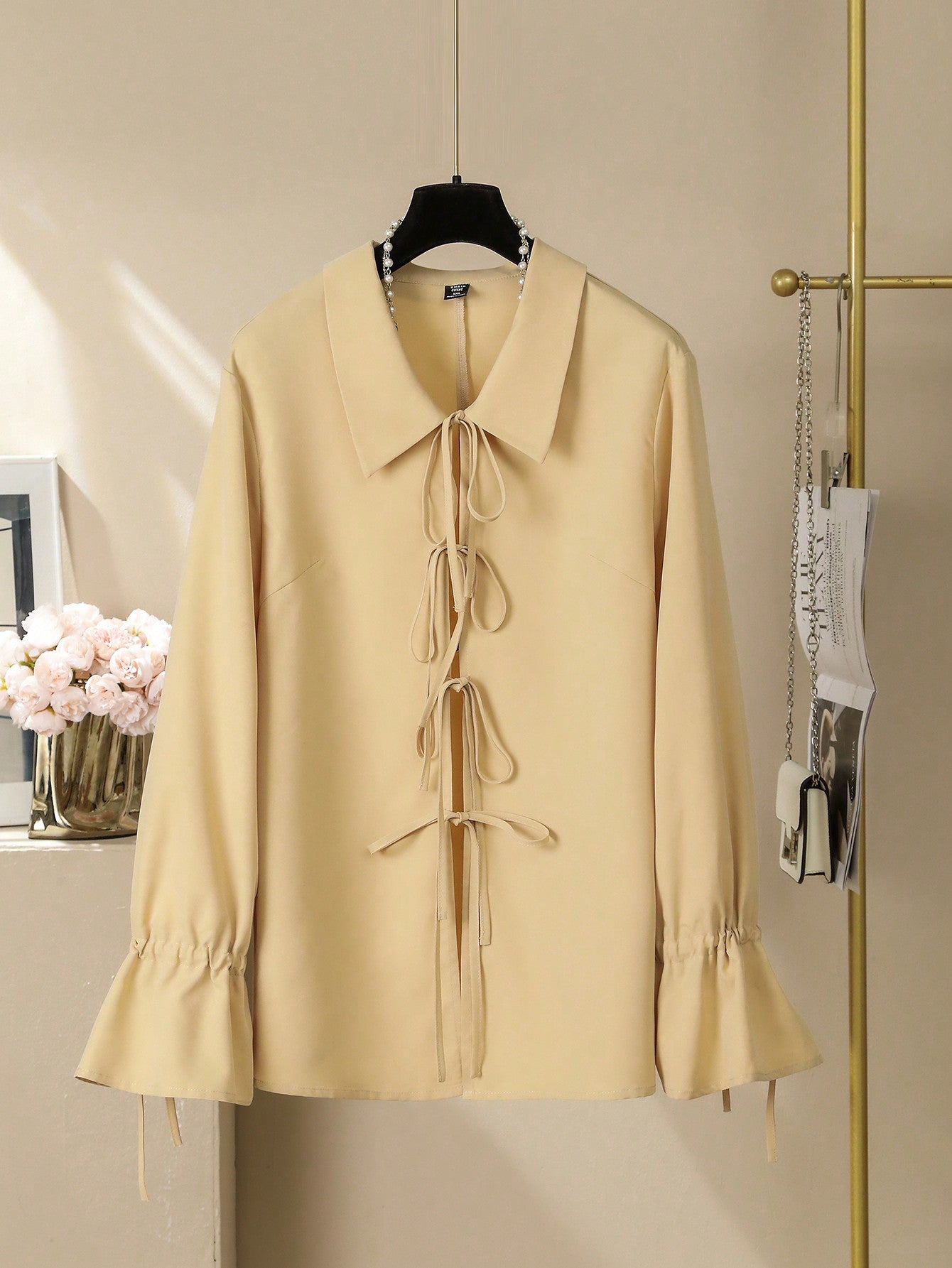 Mulvari Plus Size Long Sleeve Shirt With Bow Tie Belt, Casual Daily Going Out Top Shirt Blouses, For