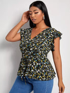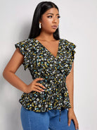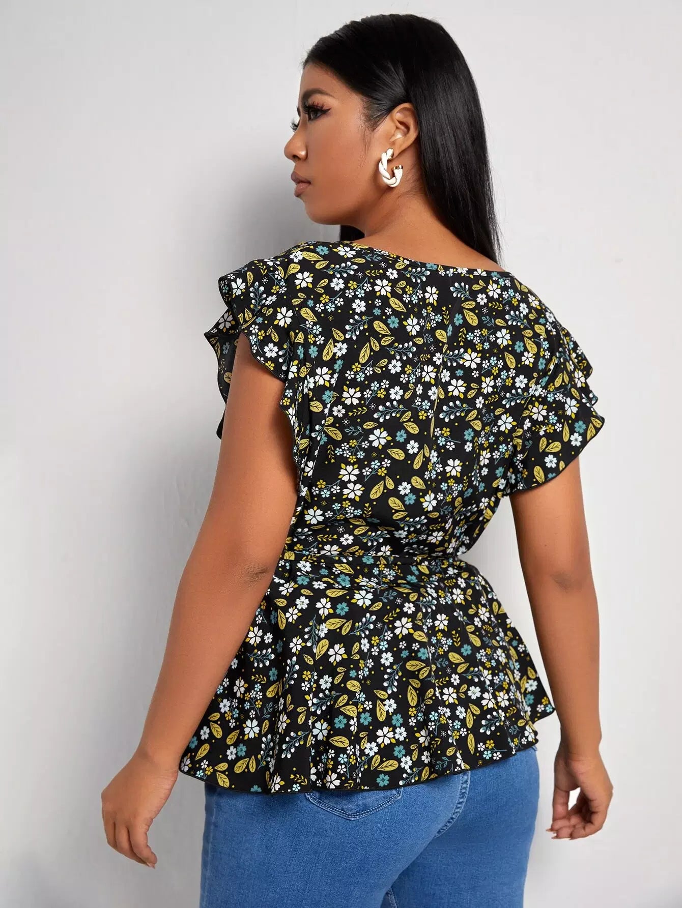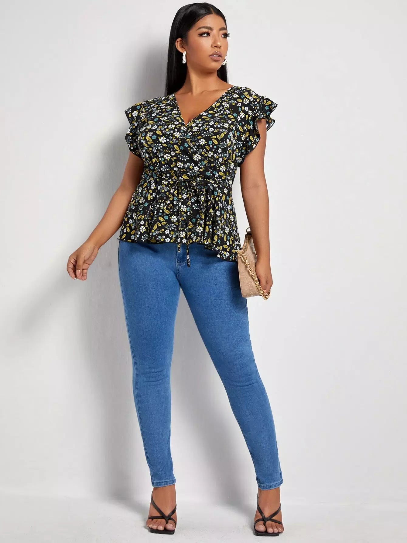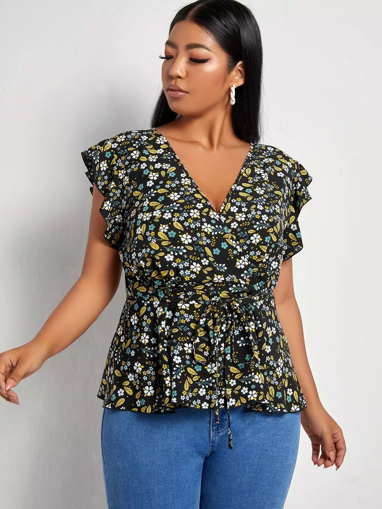 بالإضافة إلى بلوزة برقبة دائرية وطبعات زهور بدون حزام