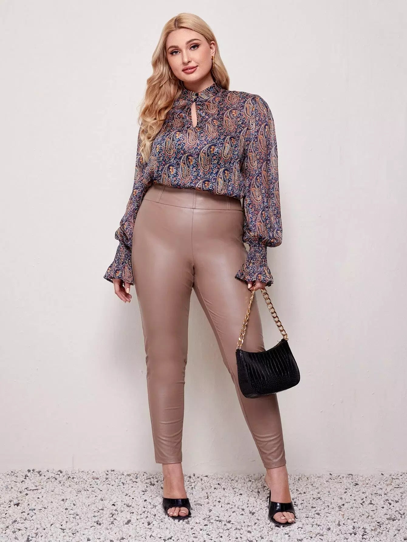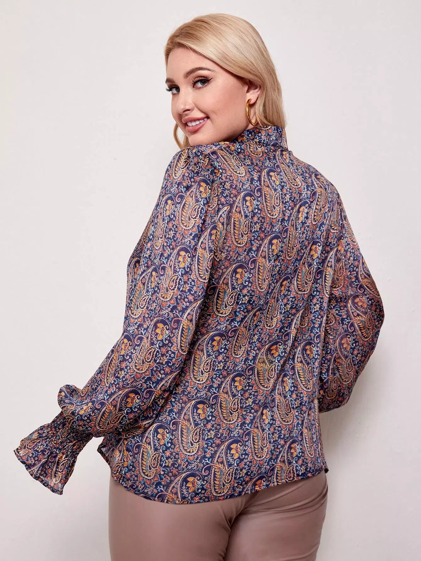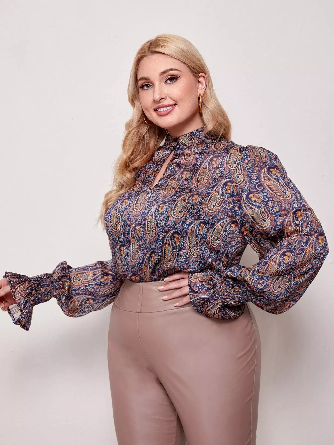 بلوزة بأكمام منفوشة بطبعة بيزلي بفتحة رقبة بفتحة رقبة زائد