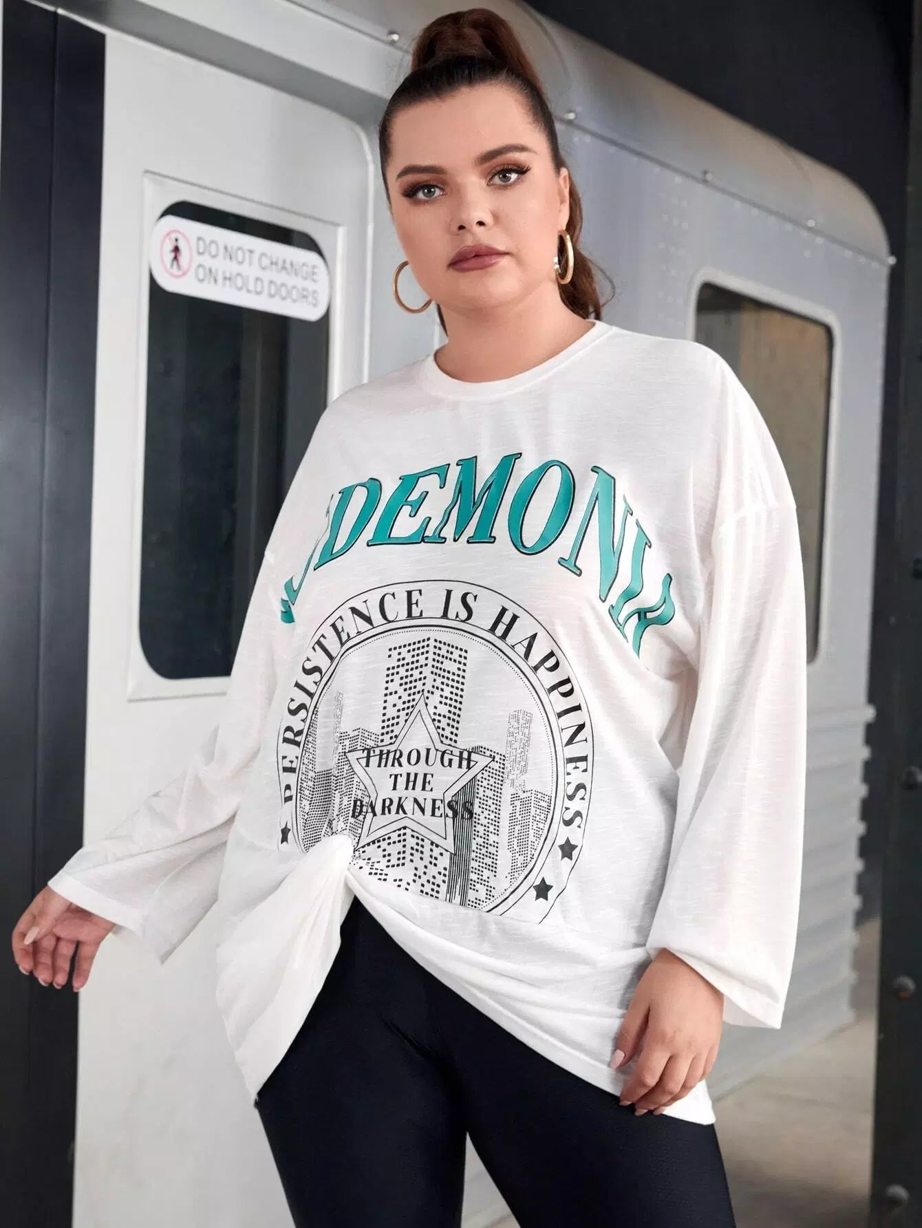 تي شيرت بقصّة ذات أكتاف منسدلة بحاشية ملتوية ذات تصميم وشعار زائد
