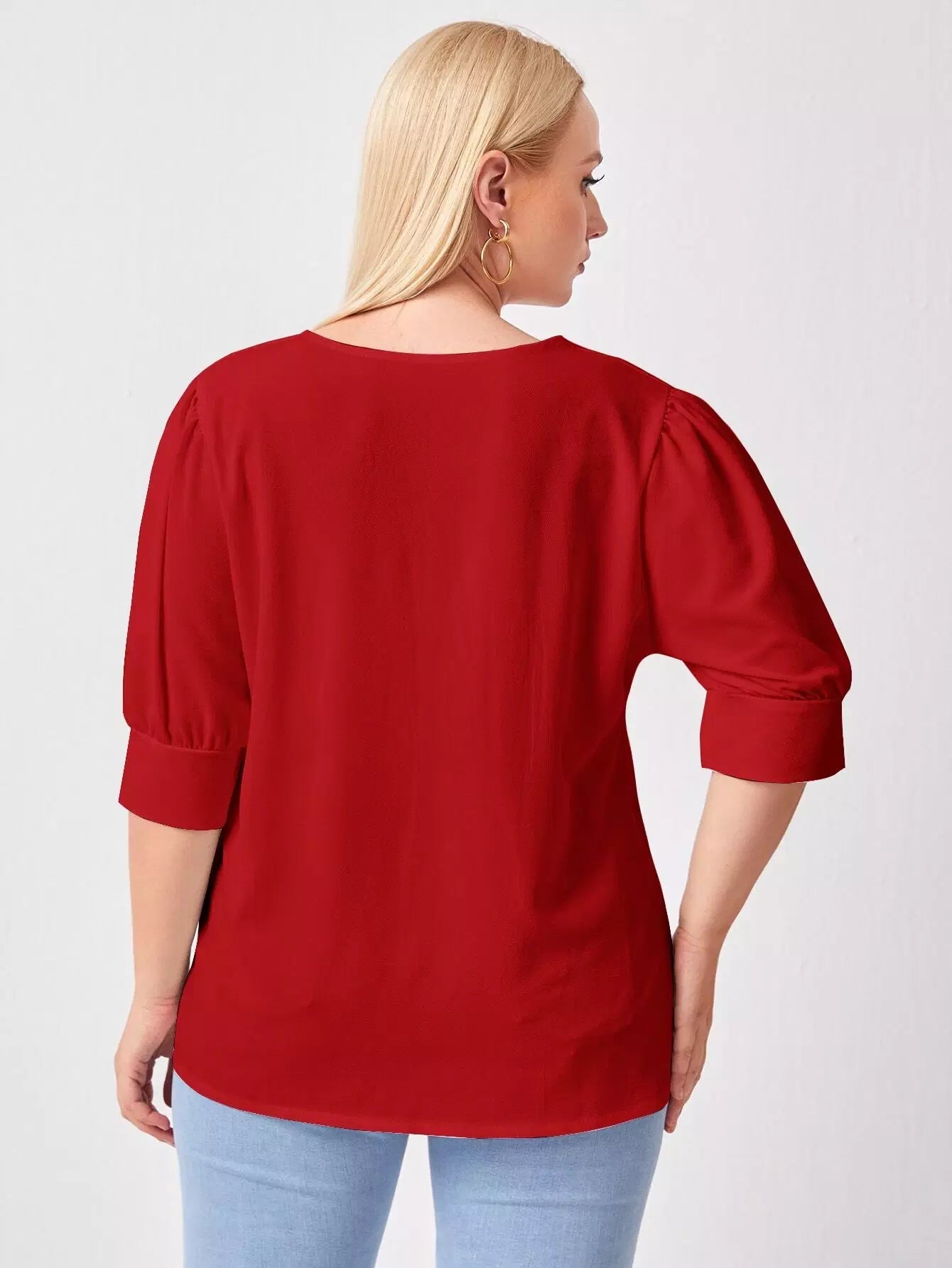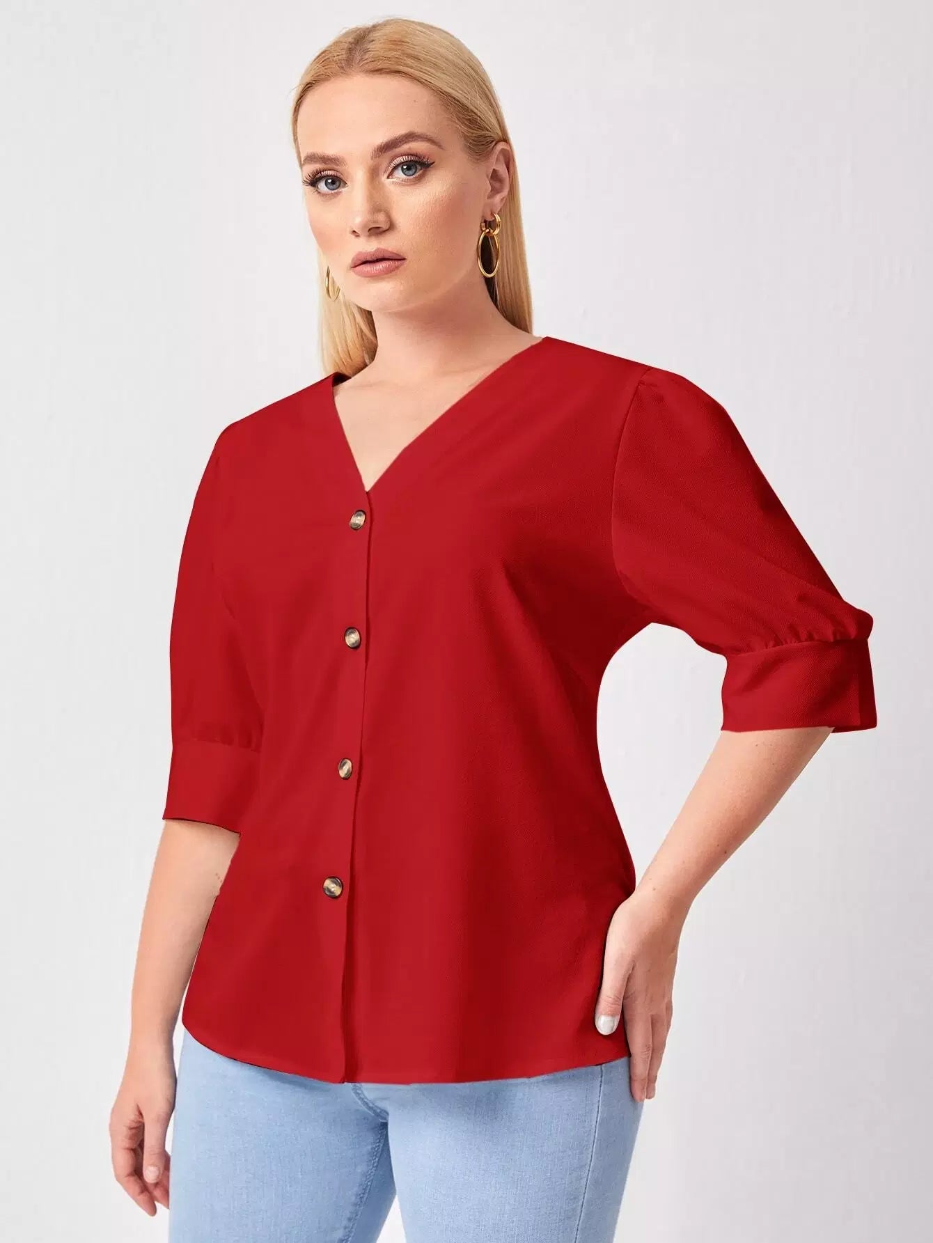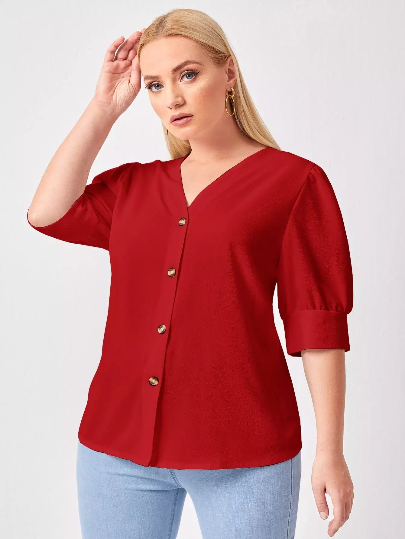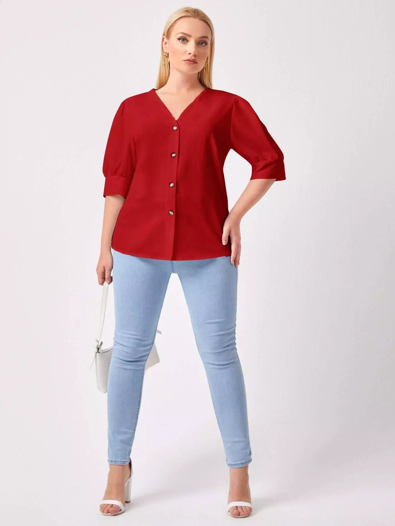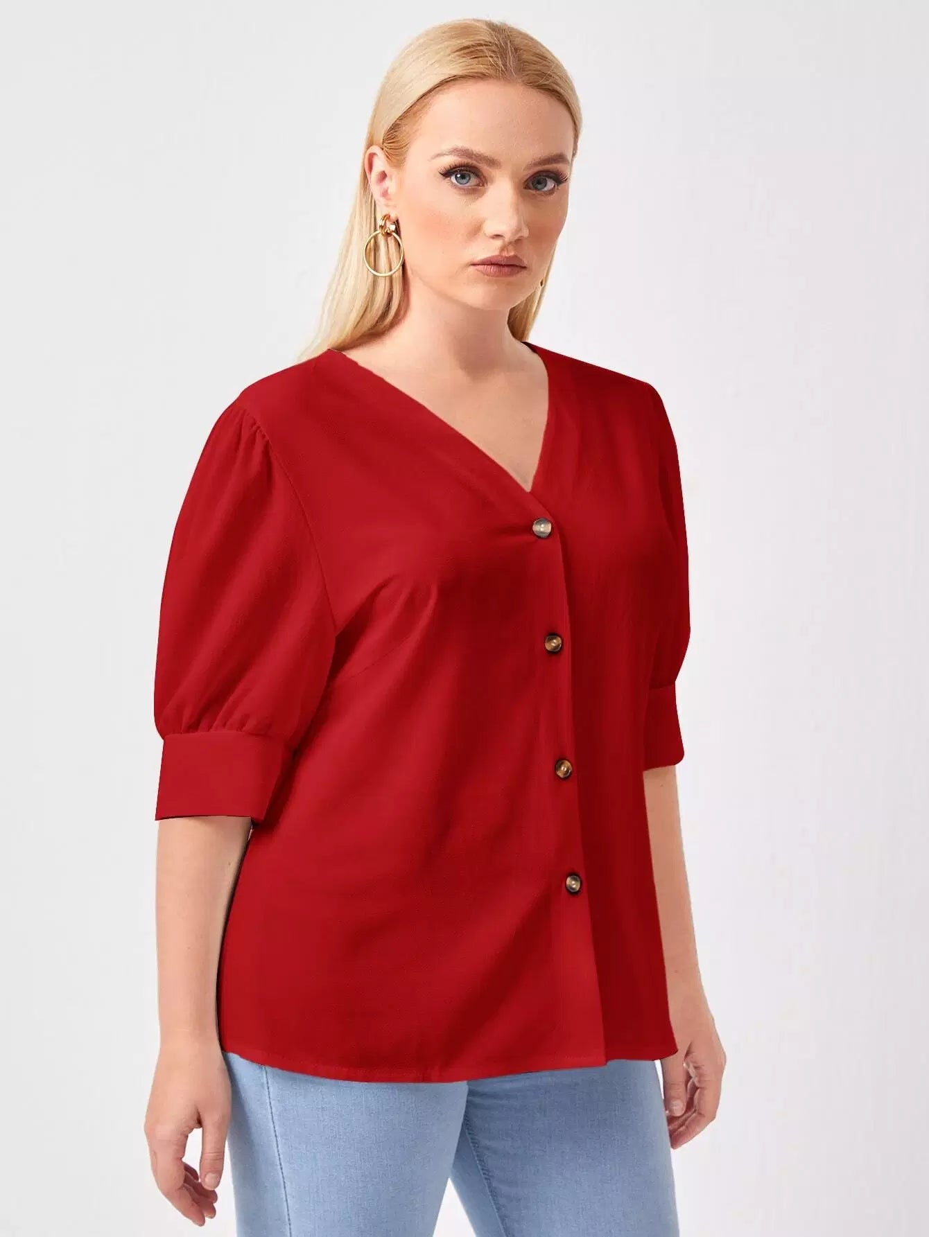 نحيف - مقاس كبير بلوزة بأكمام منتفخة وأزرار أمامية