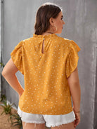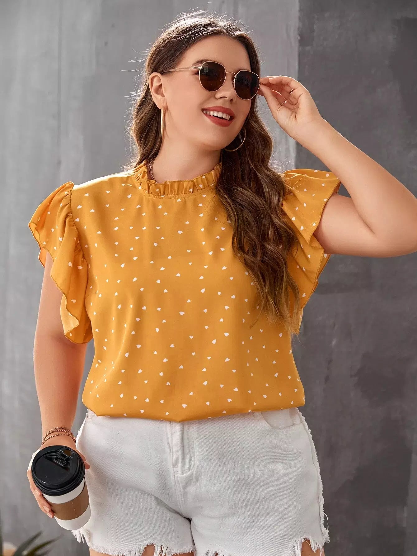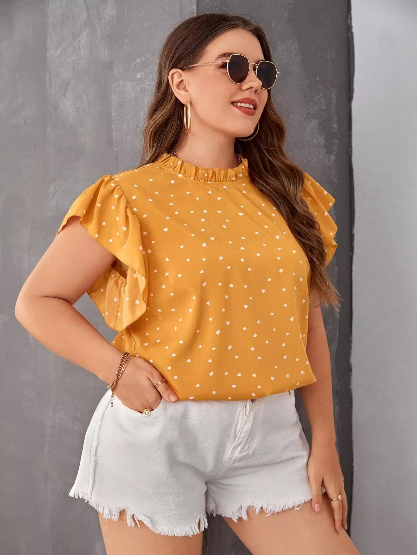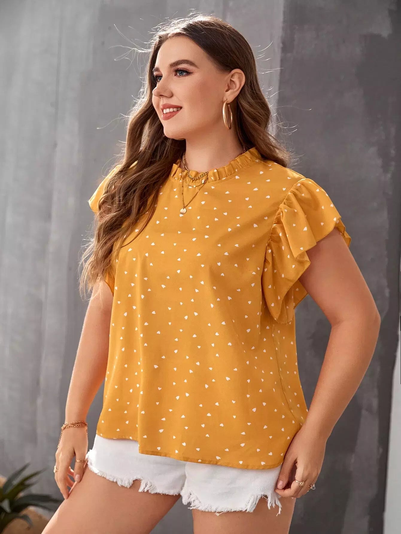 بلوزة بفتحة ذراع مكشكشة مطبوع عليها قلب مطبوع عليها كشكش بلس بلس