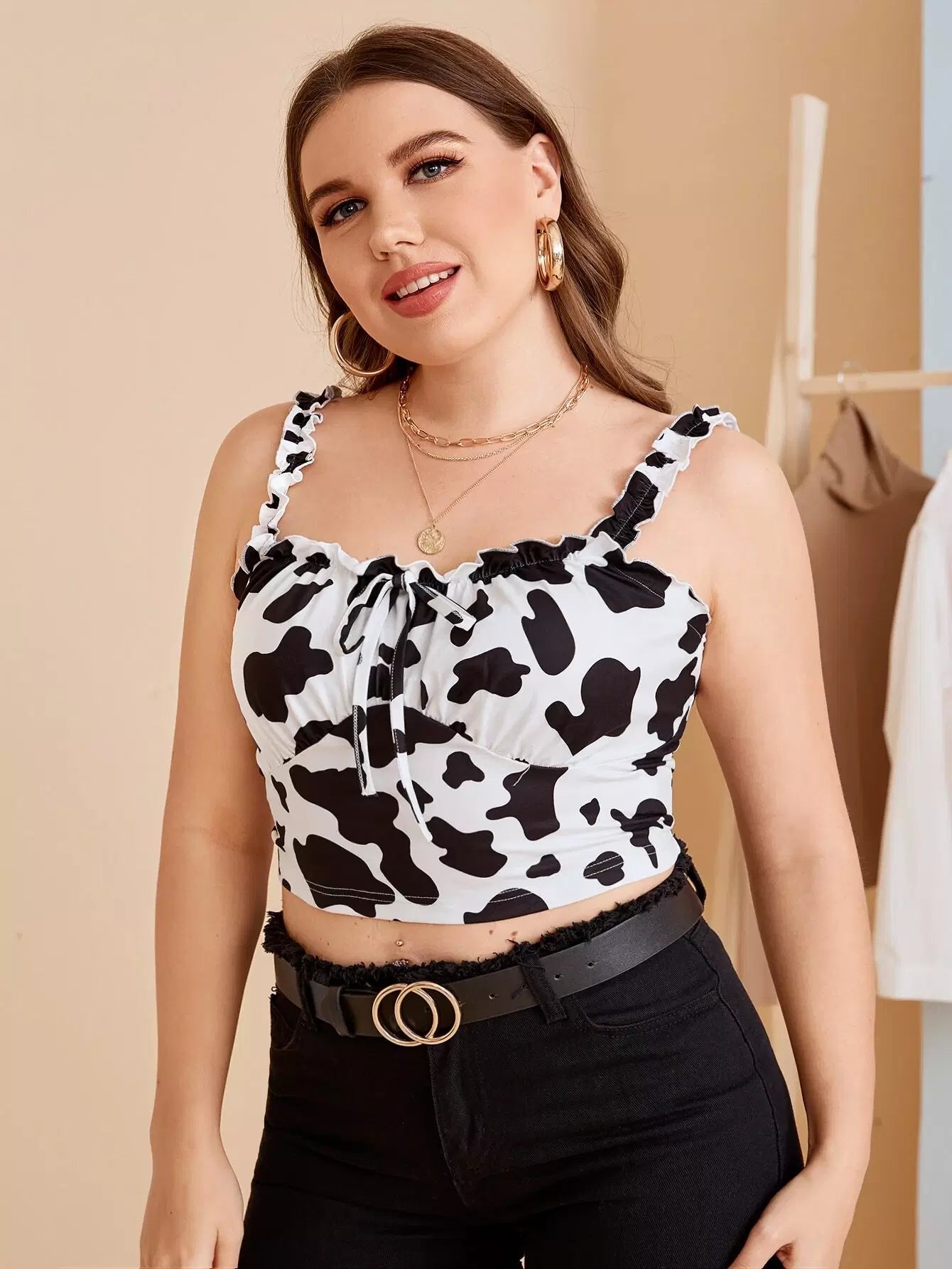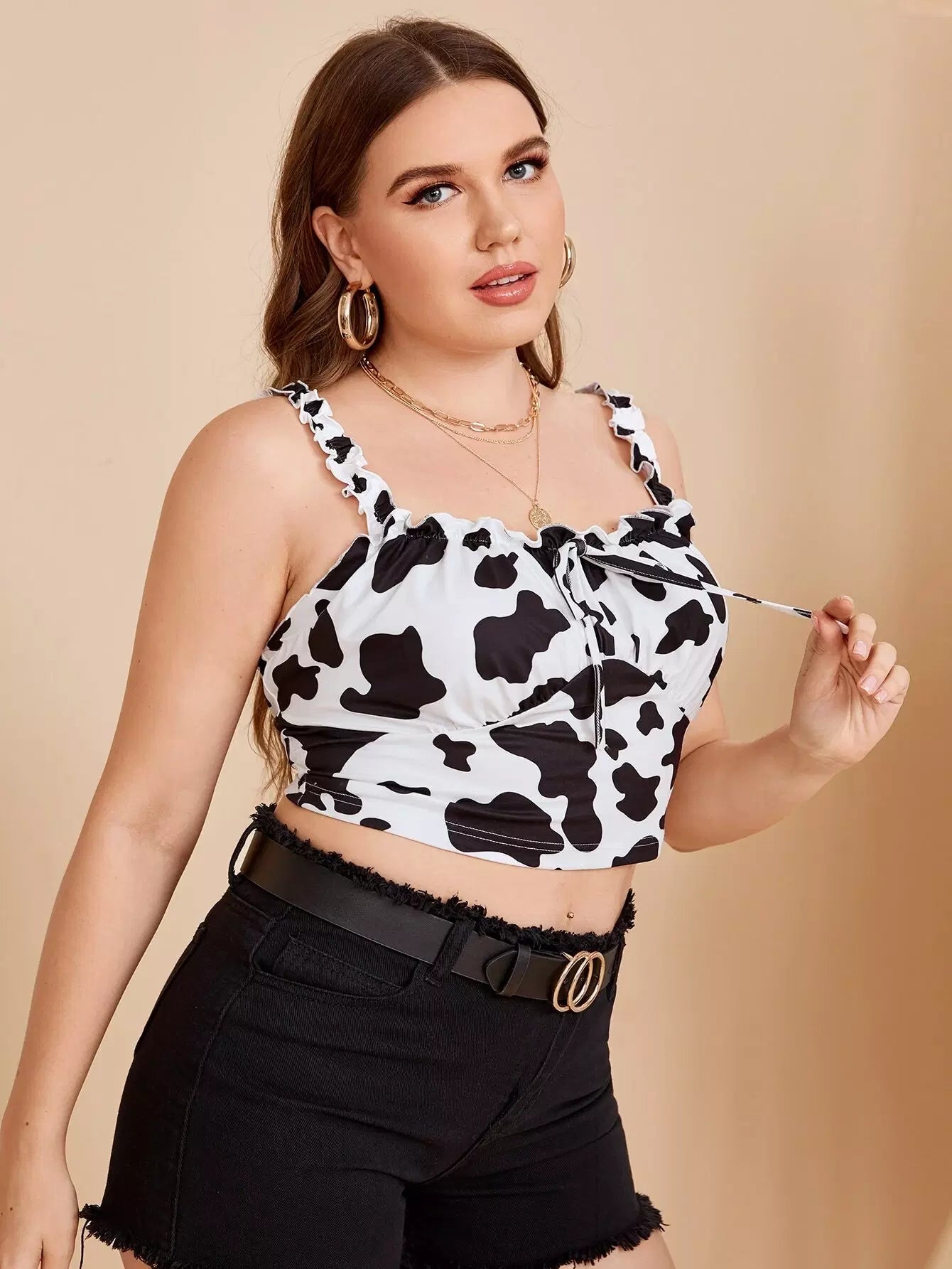 بلوزة مكشكشة بطبعة بقرة زائد بطبعة بقرة مكشكشة من الأمام بعقدة من الأمام