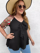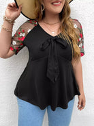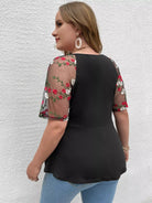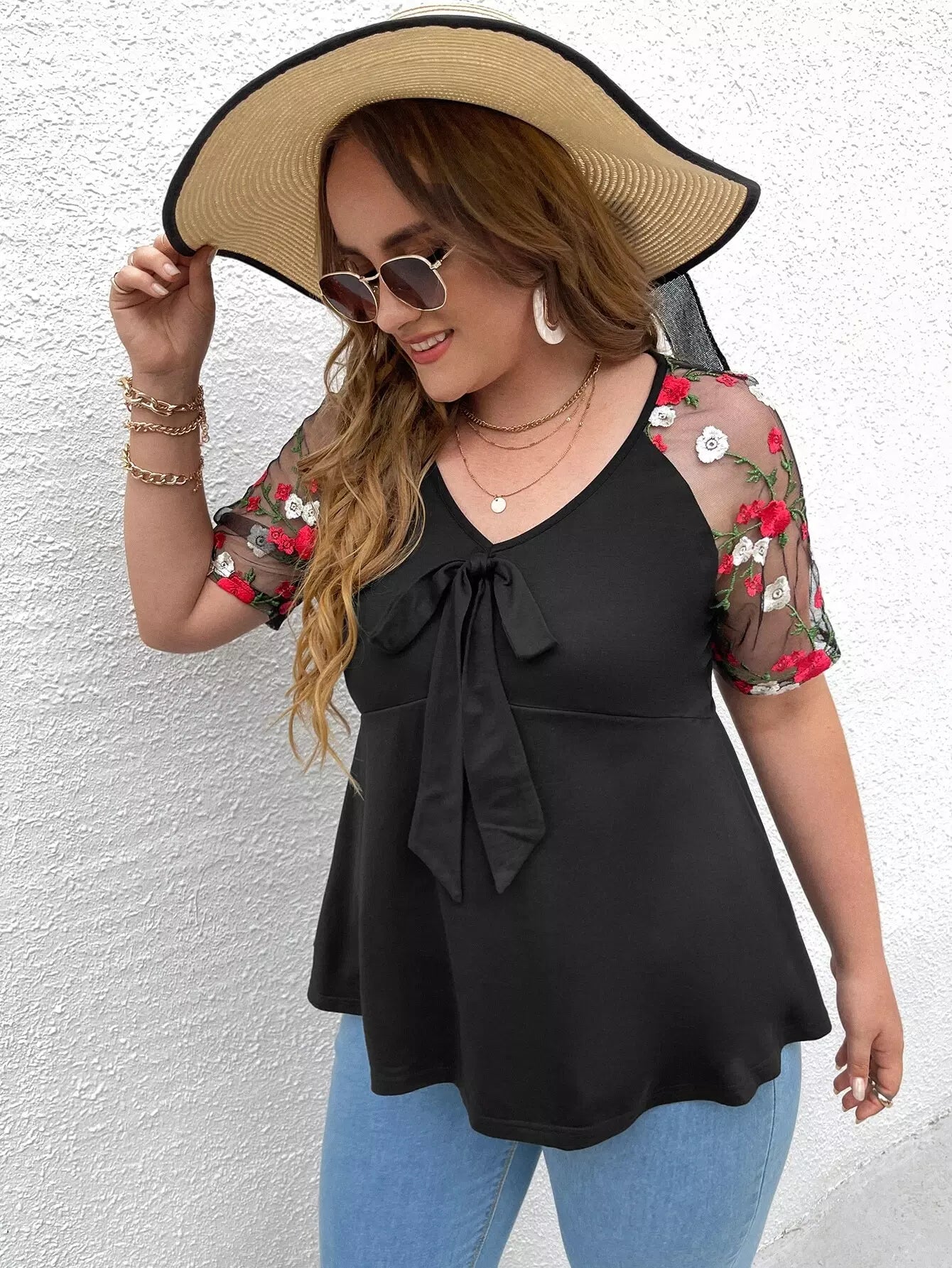 تي شيرت بأكمام شبكية بأكمام شبكية مطرزة بالزهور