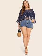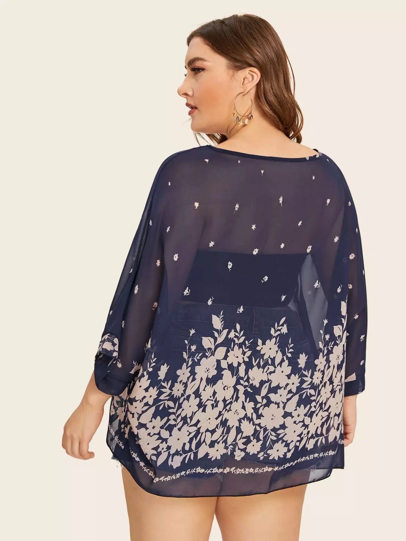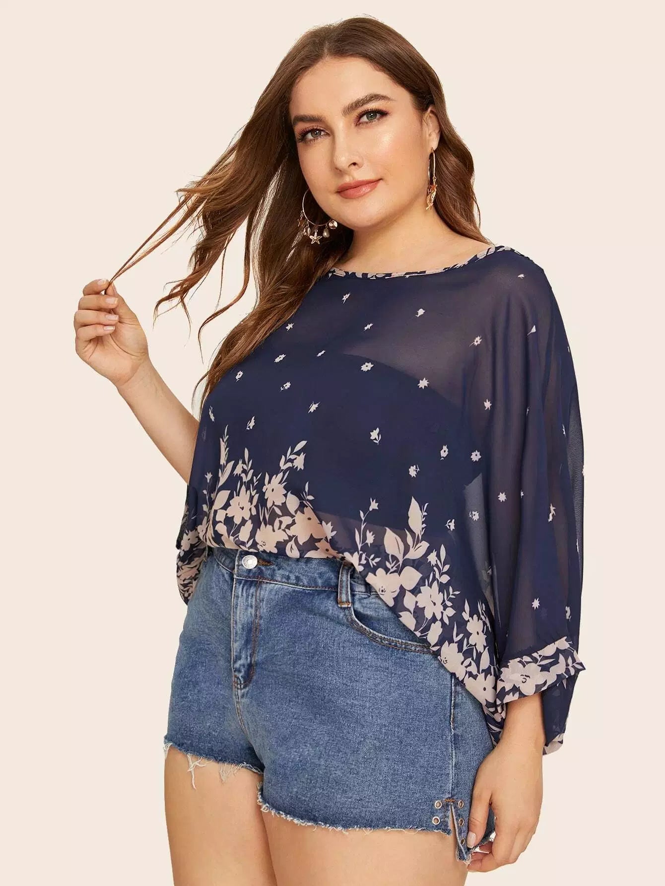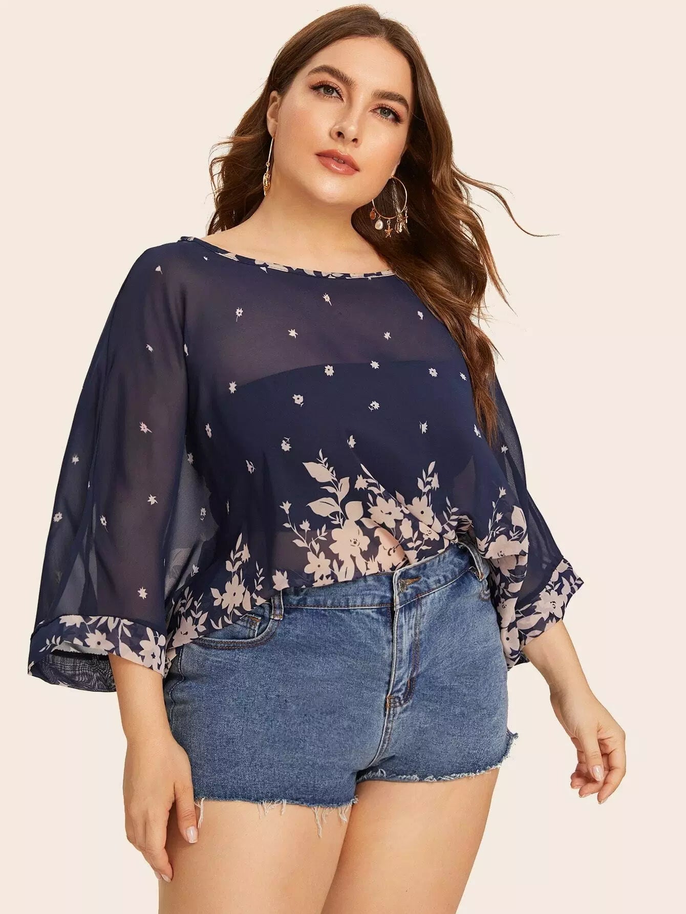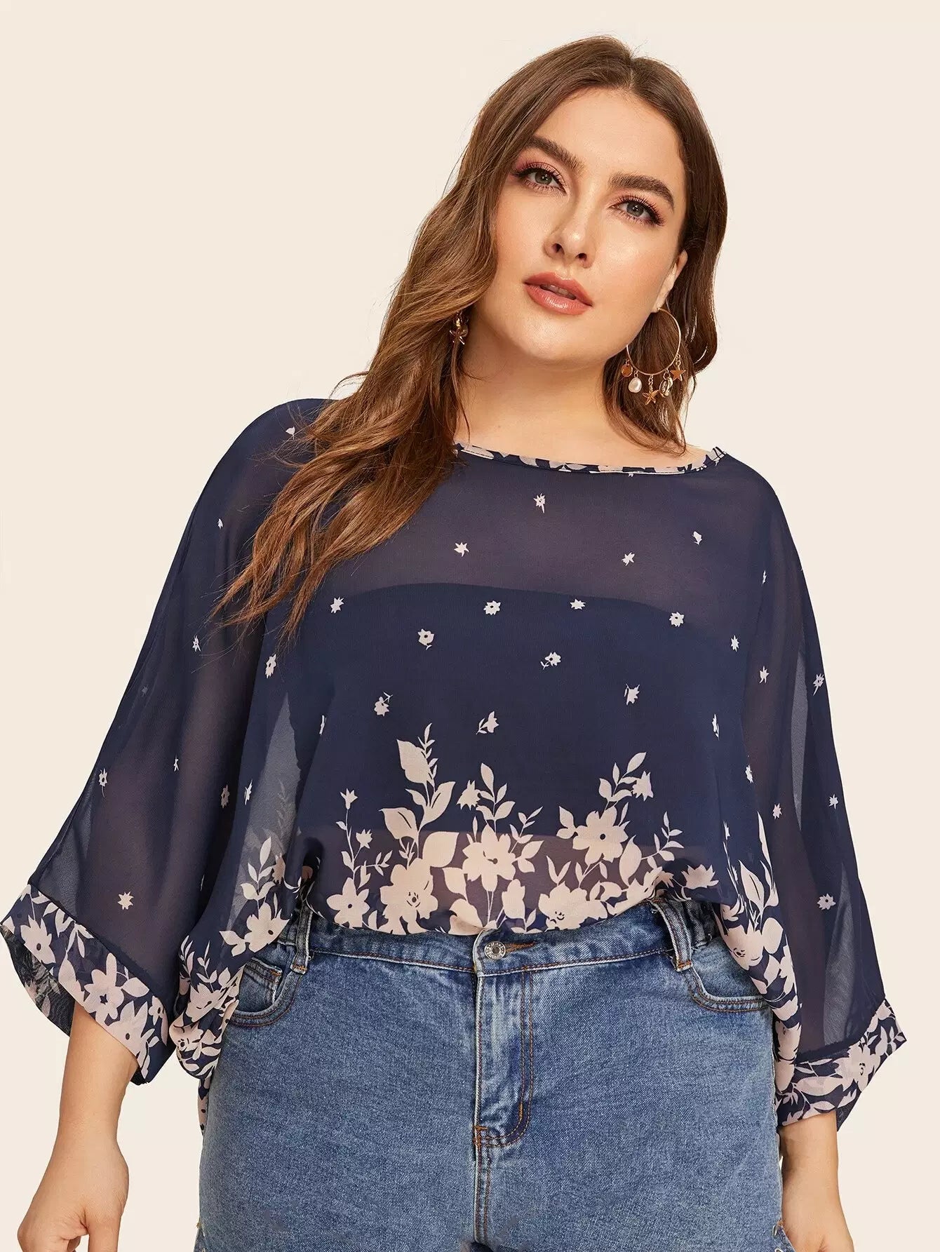بلوزة شفافة بأكمام شفافة، مطبوع عليها زهور بأكمام باتوينغ بلس