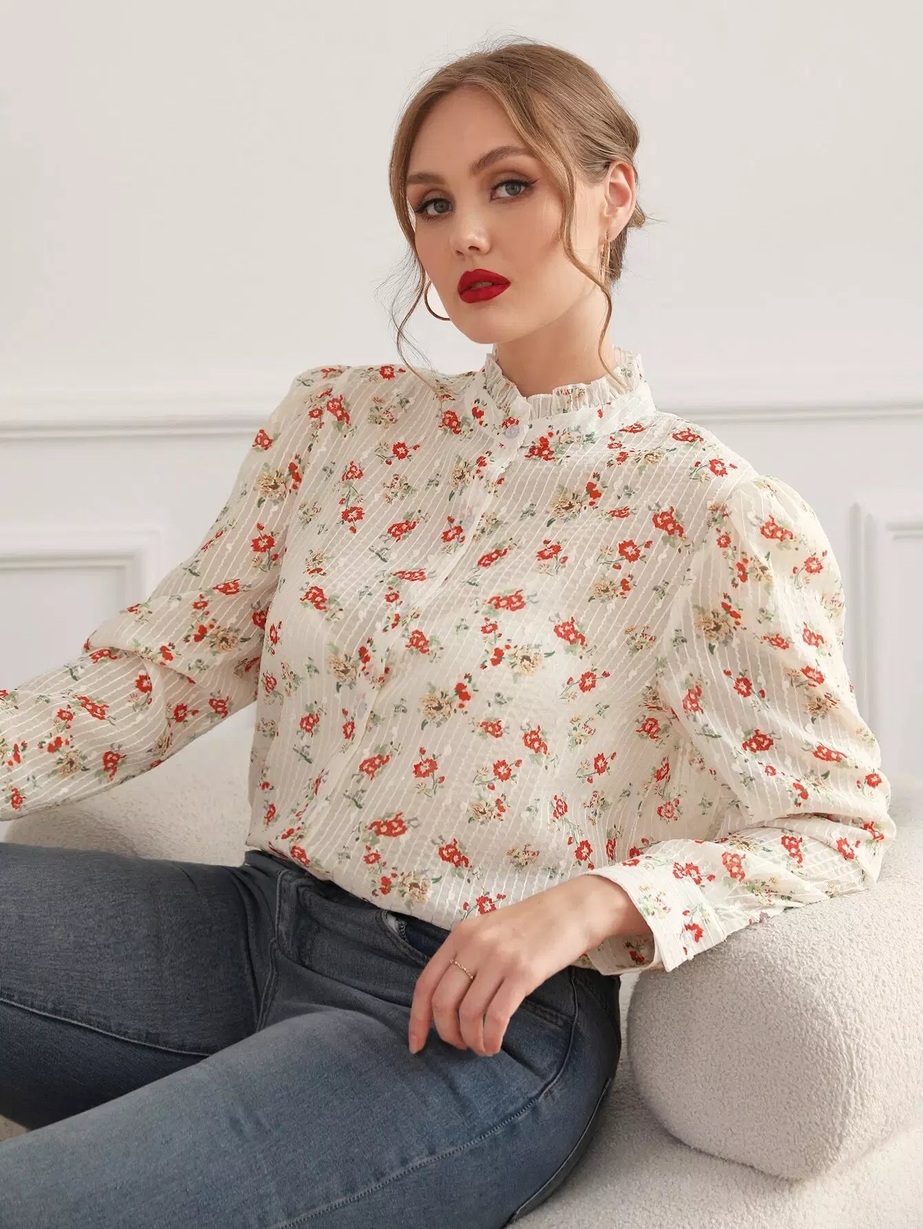 بلوزة برقبة مزركشة بطبعة زهور زائد بدون حمالة صدر