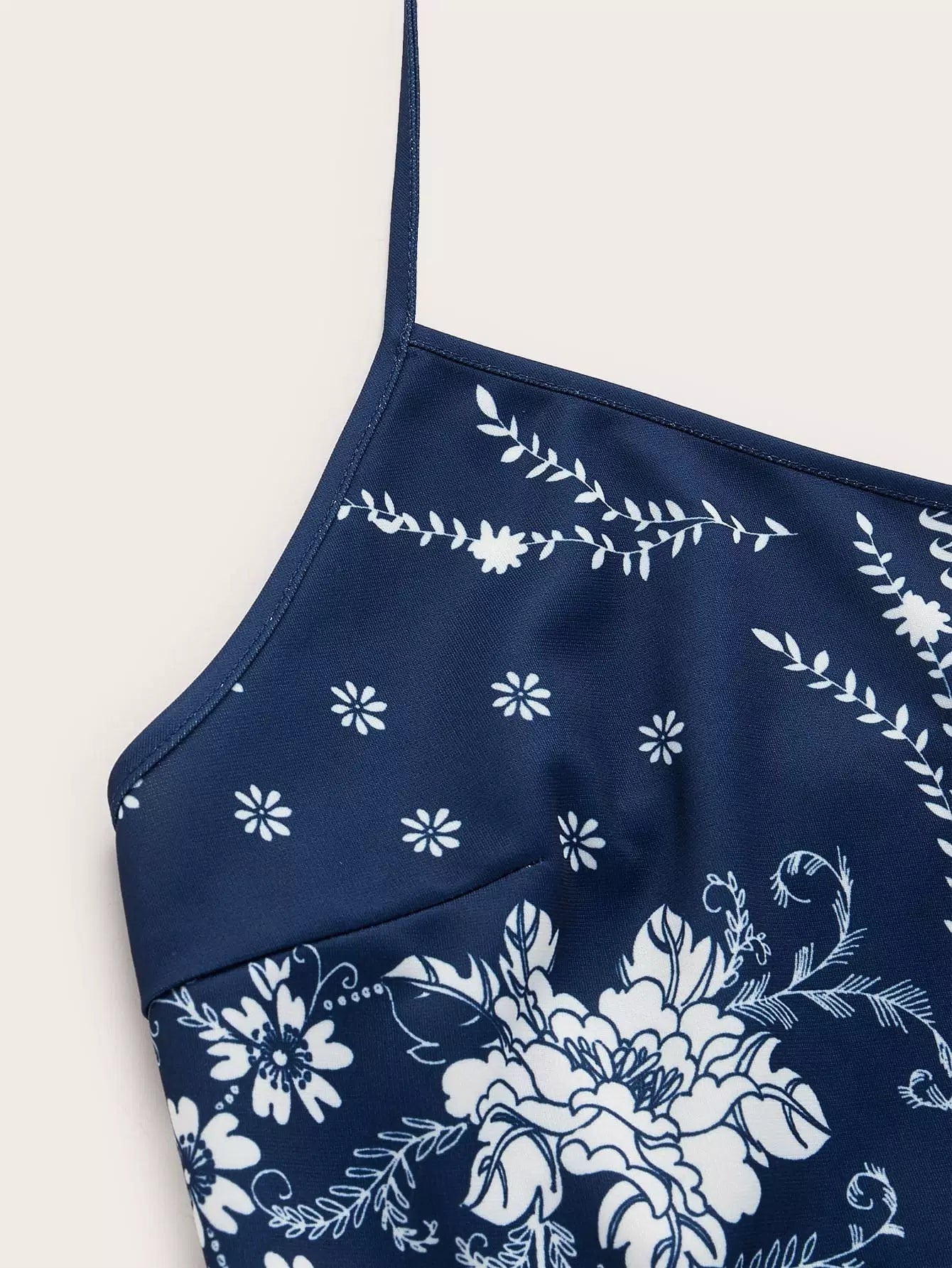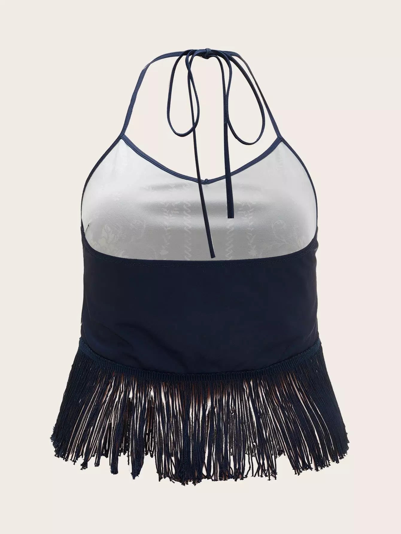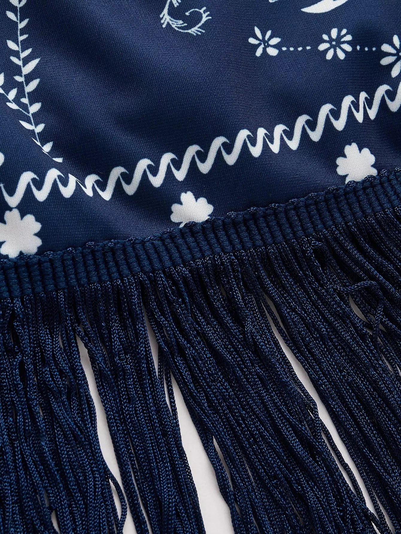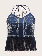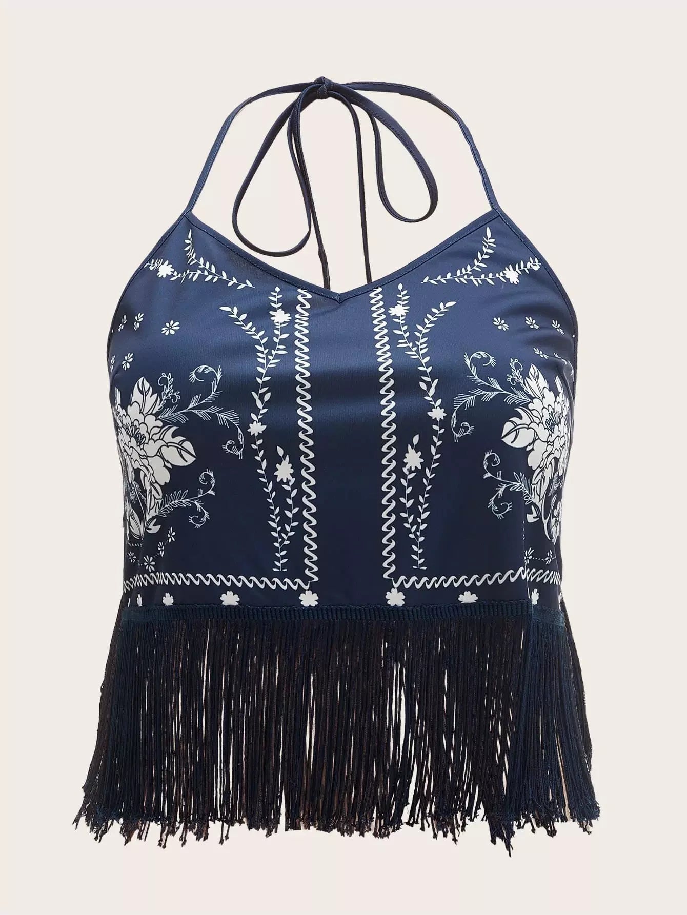 بلوزة بحافة رسن بطبعة زهور مطبوعة بأهداب زائد