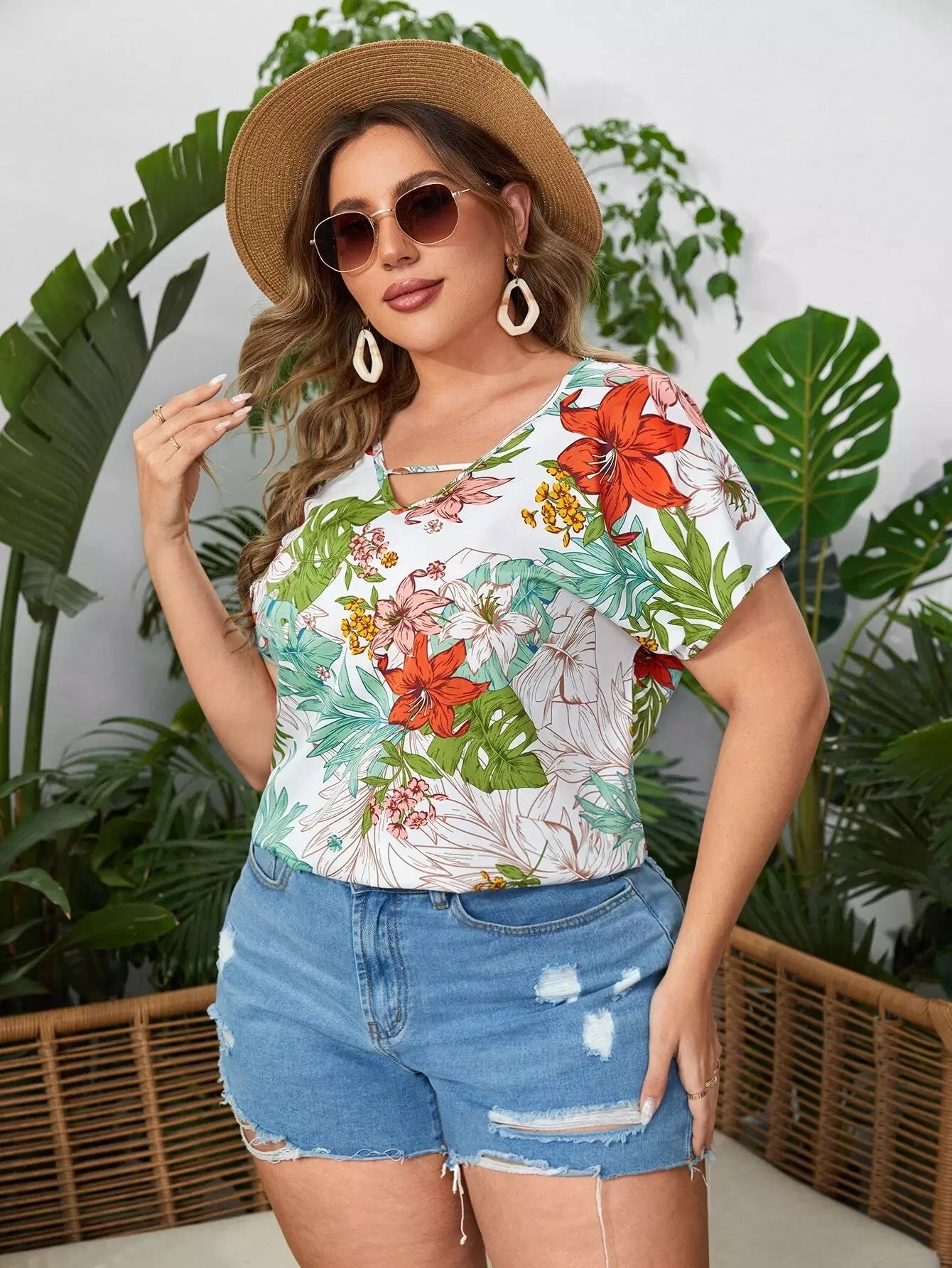 بلوزة بفتحة رقبة بفتحة رقبة بطبعة زهور زائد