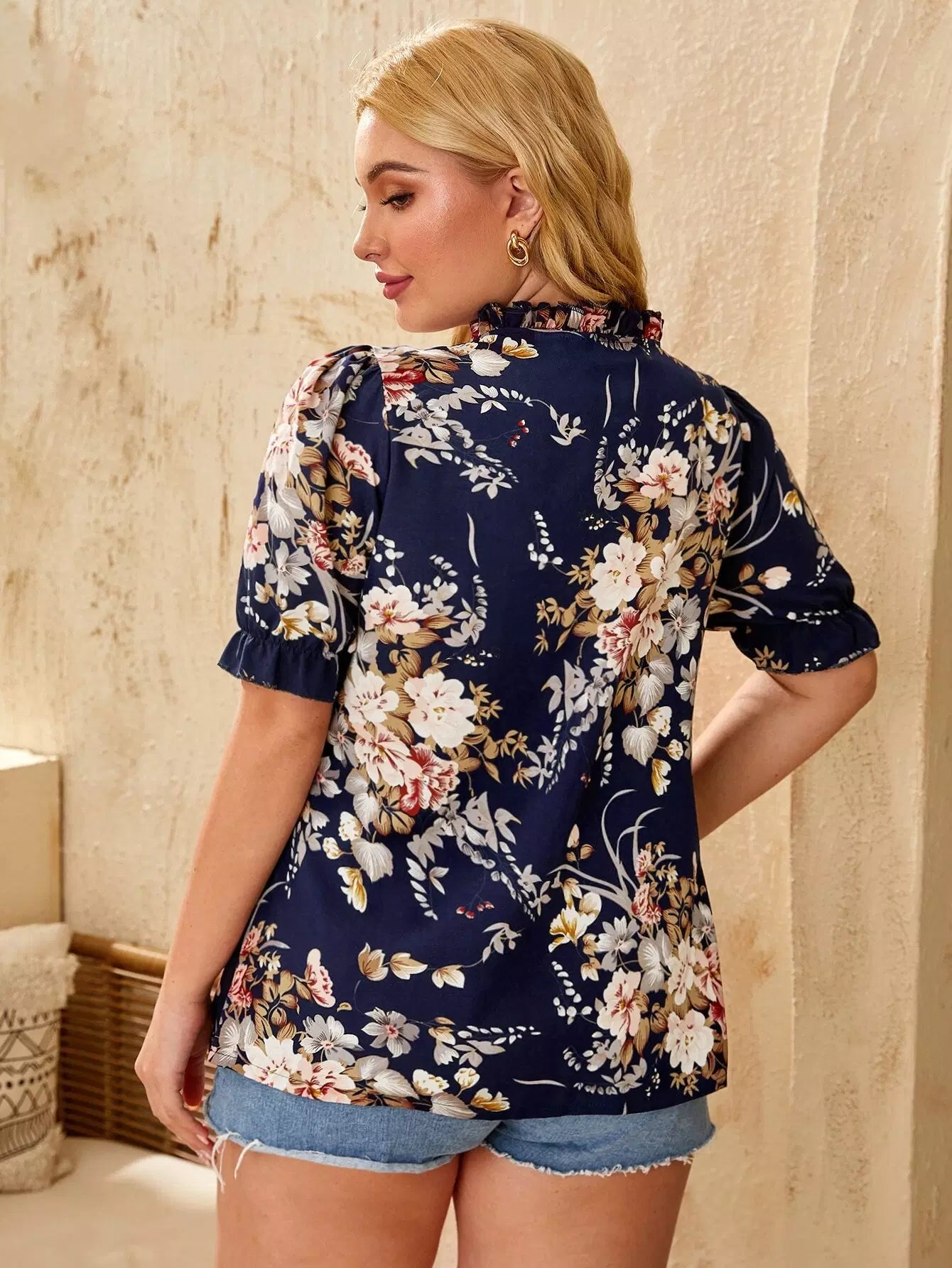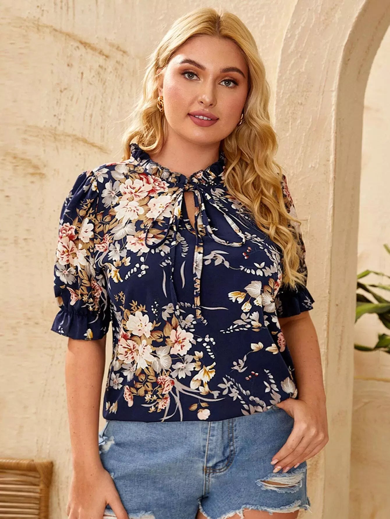 بلوزة بطبعة زهور مطبوعة على شكل ربطة عنق زائد