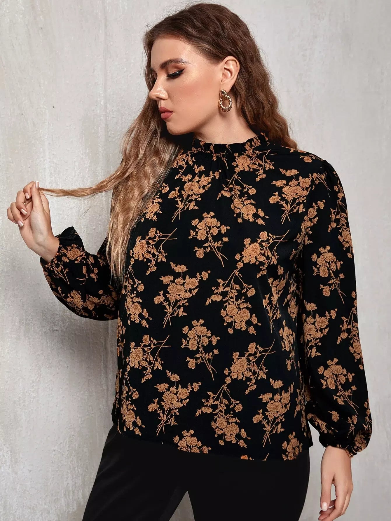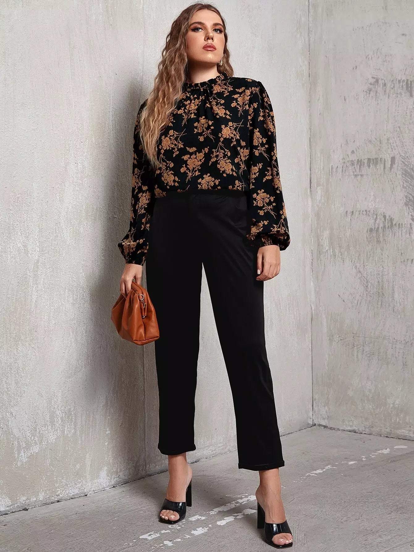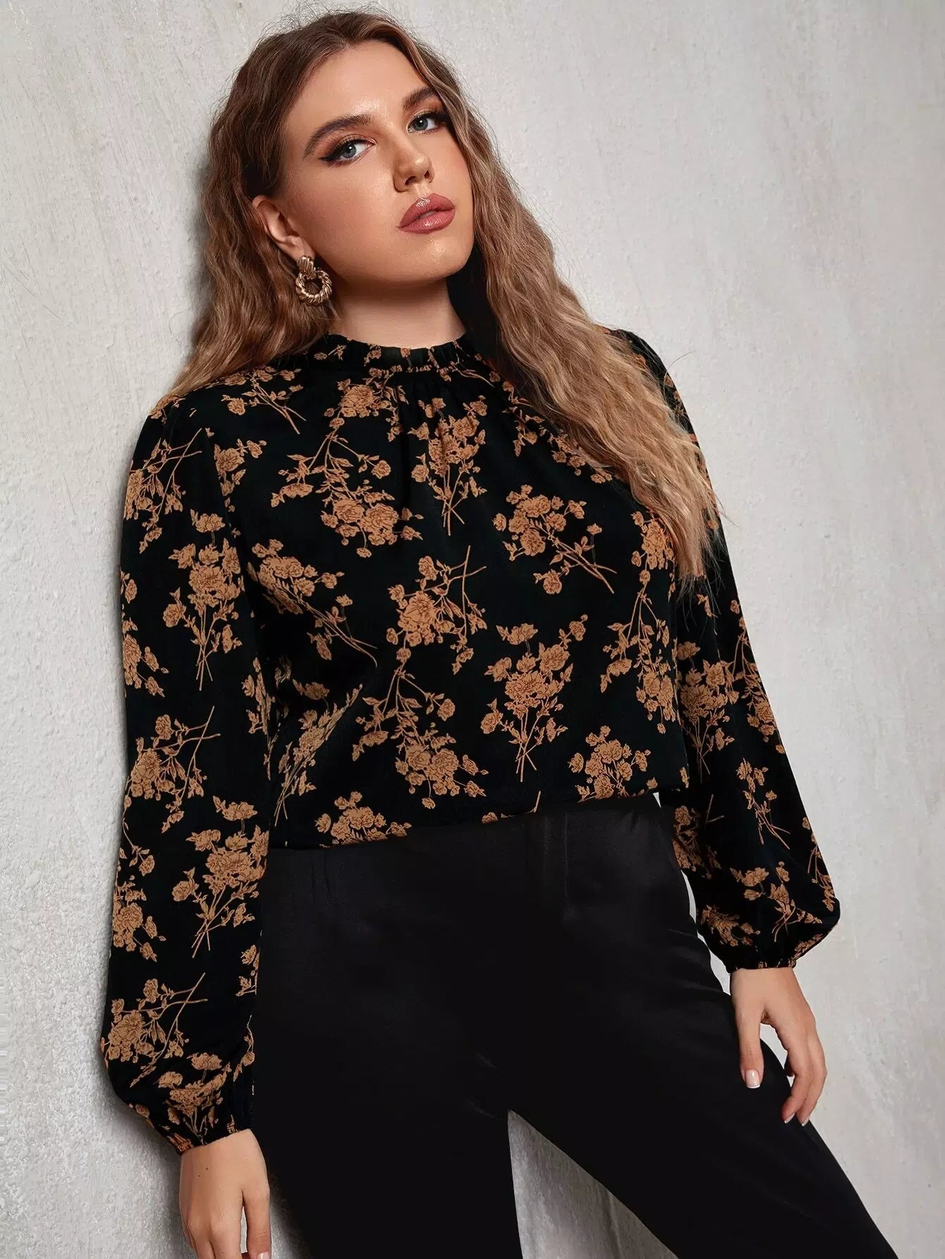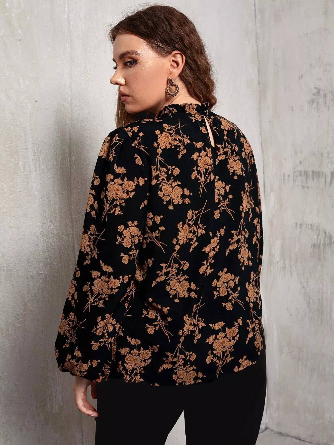 بلوزة برقبة مزركشة بأكمام زهرية بفتحة رقبة زائدة وأكمام فانوسية