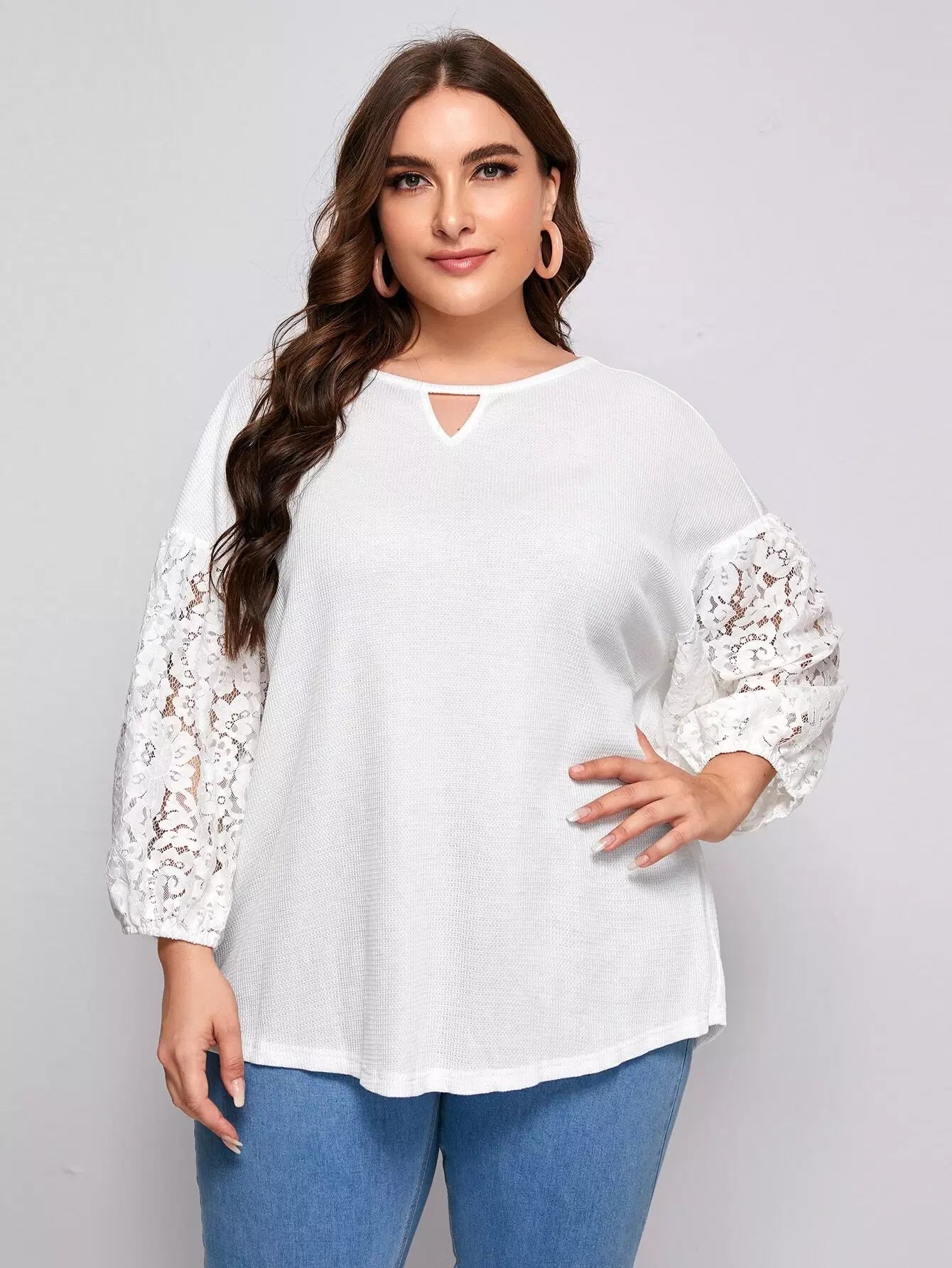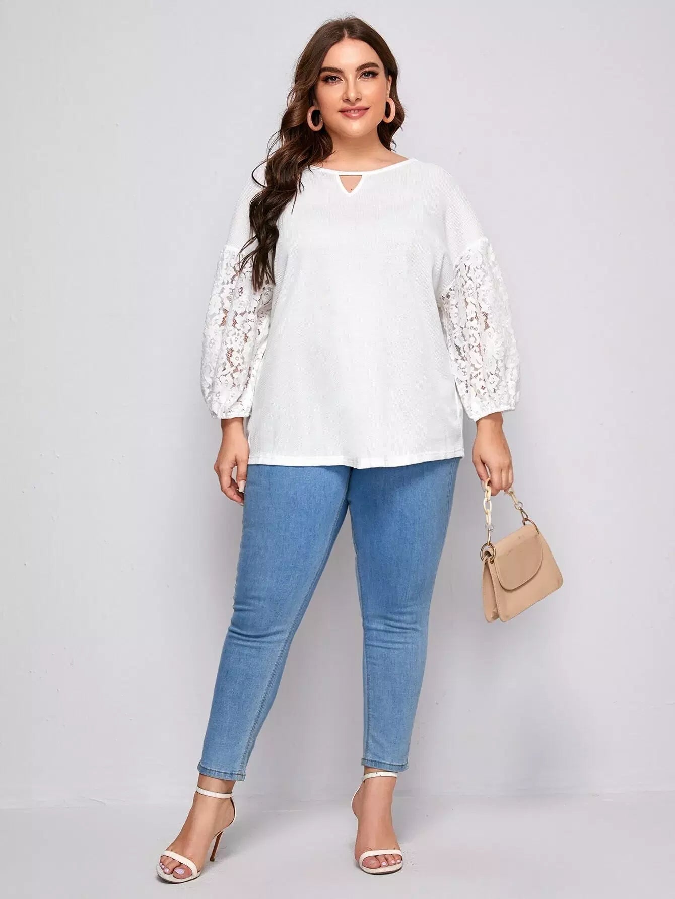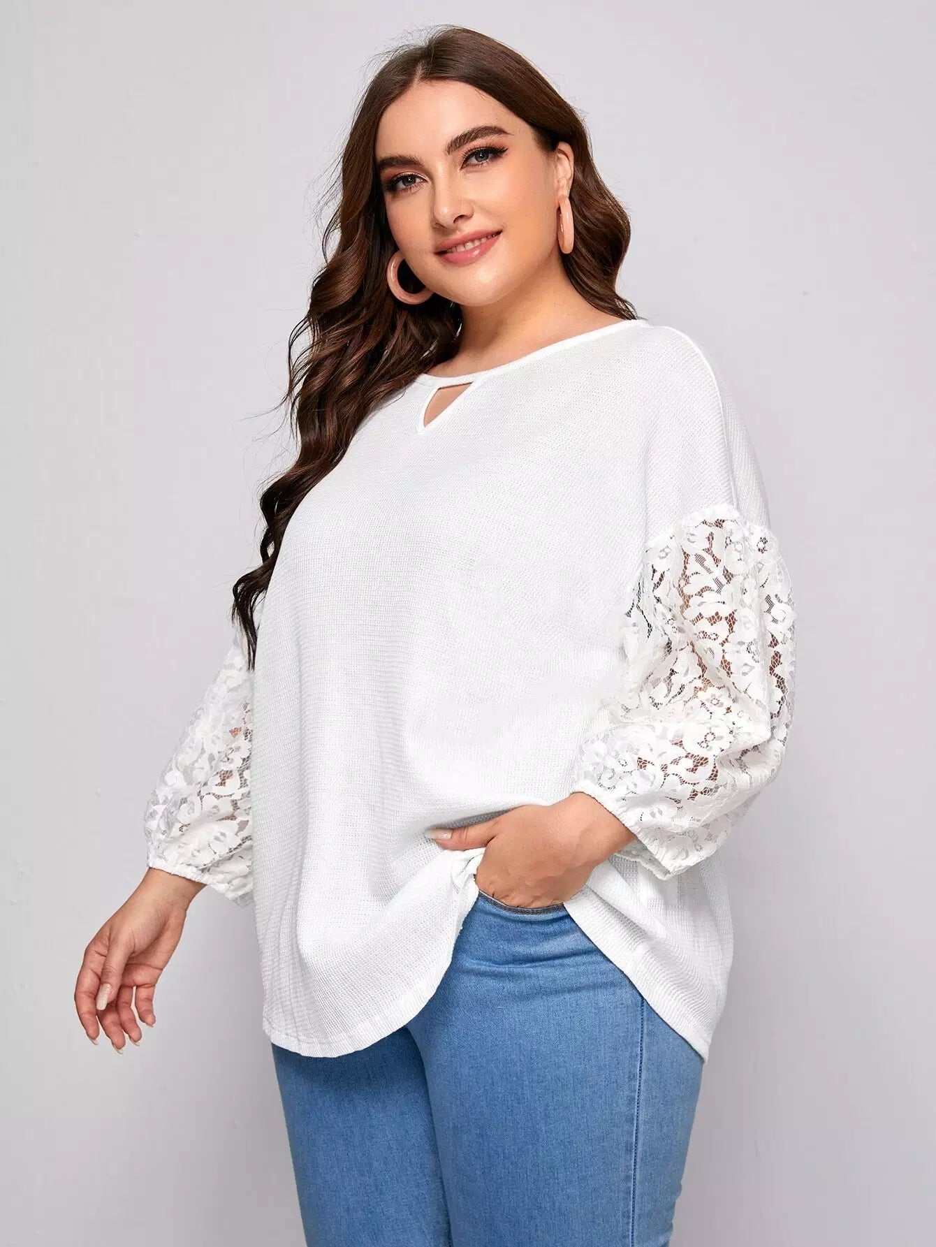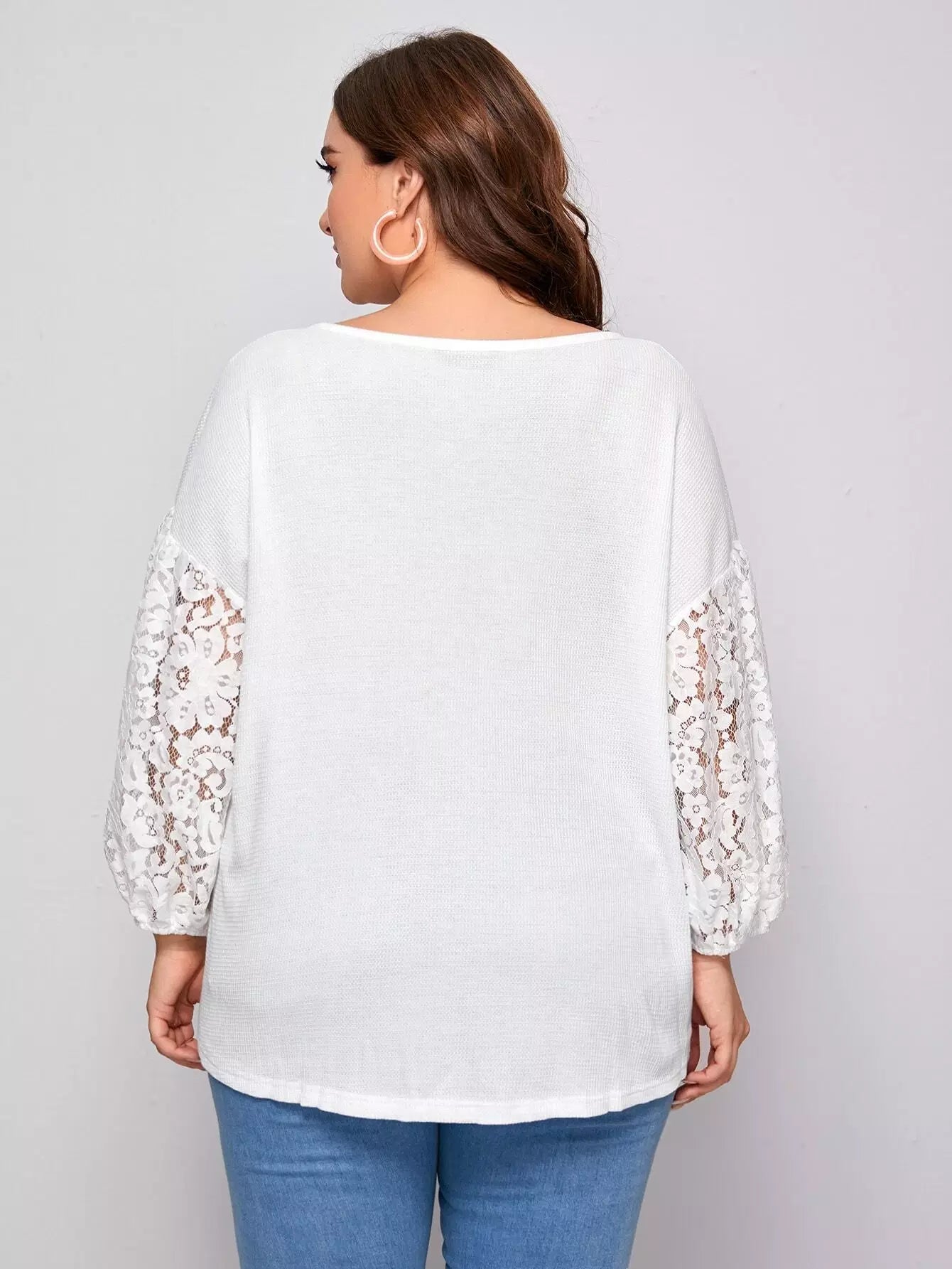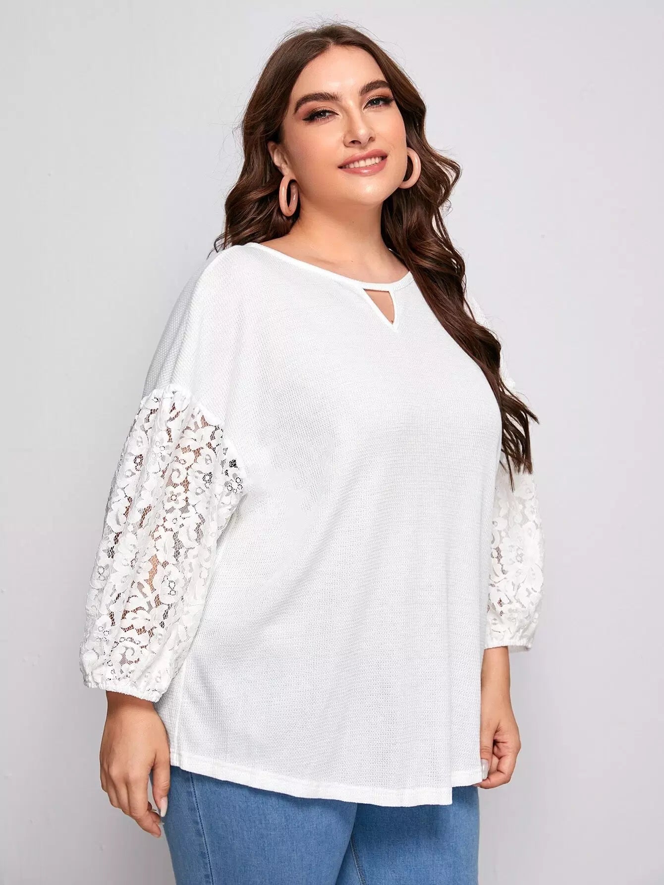 تي شيرت بقصّة منسدلة الأكتاف من الدانتيل المخرّم المخرّم