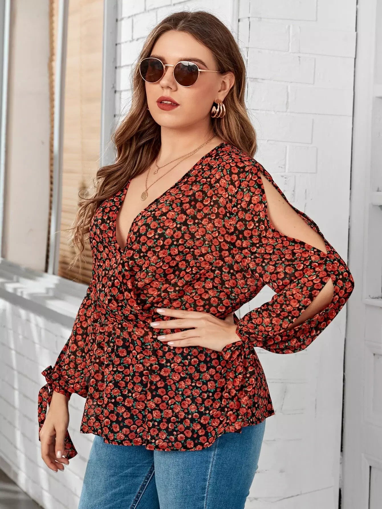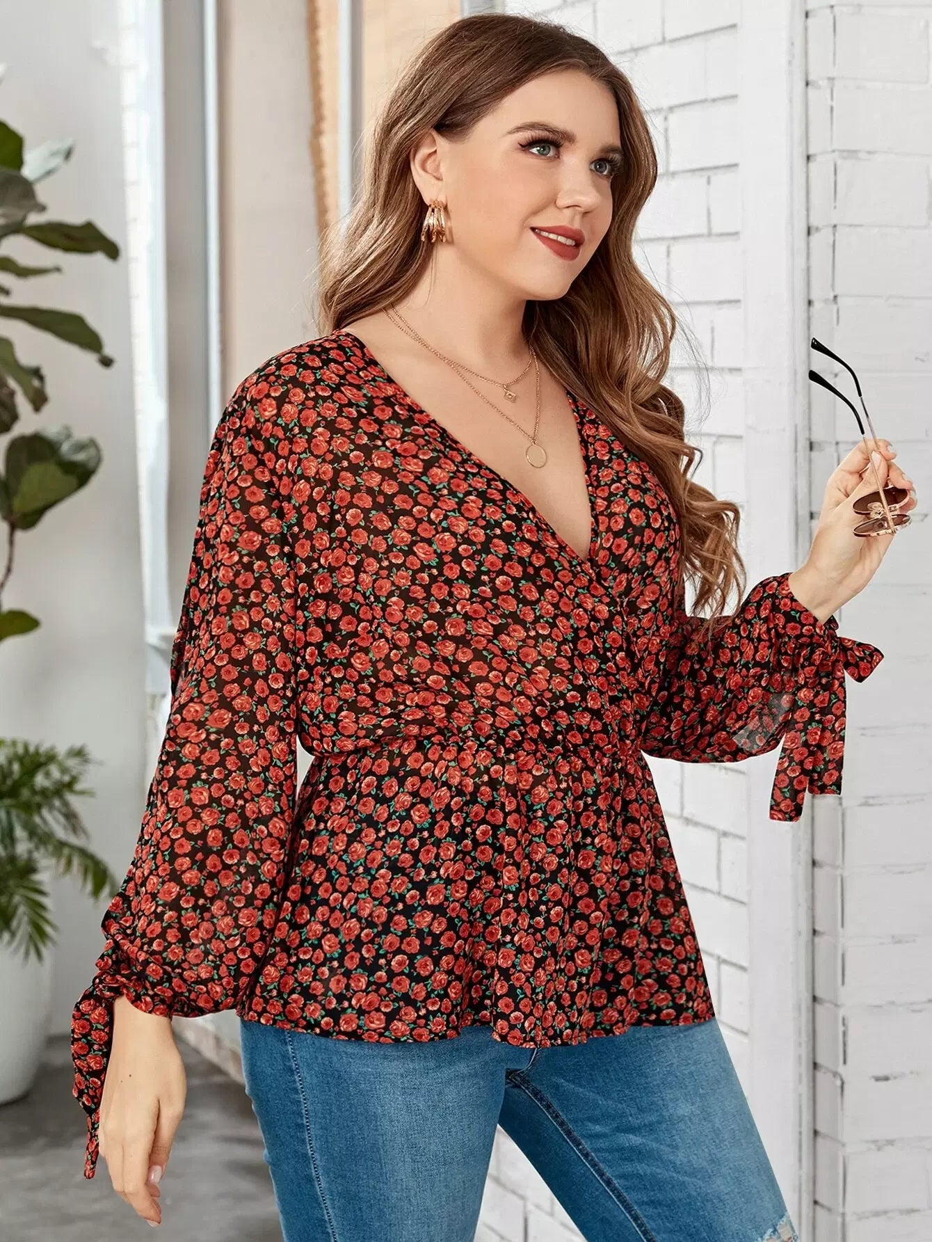 بلوزة ديتسي ذات أكمام بفتحة زهرية ذات عقدة بلس بلس