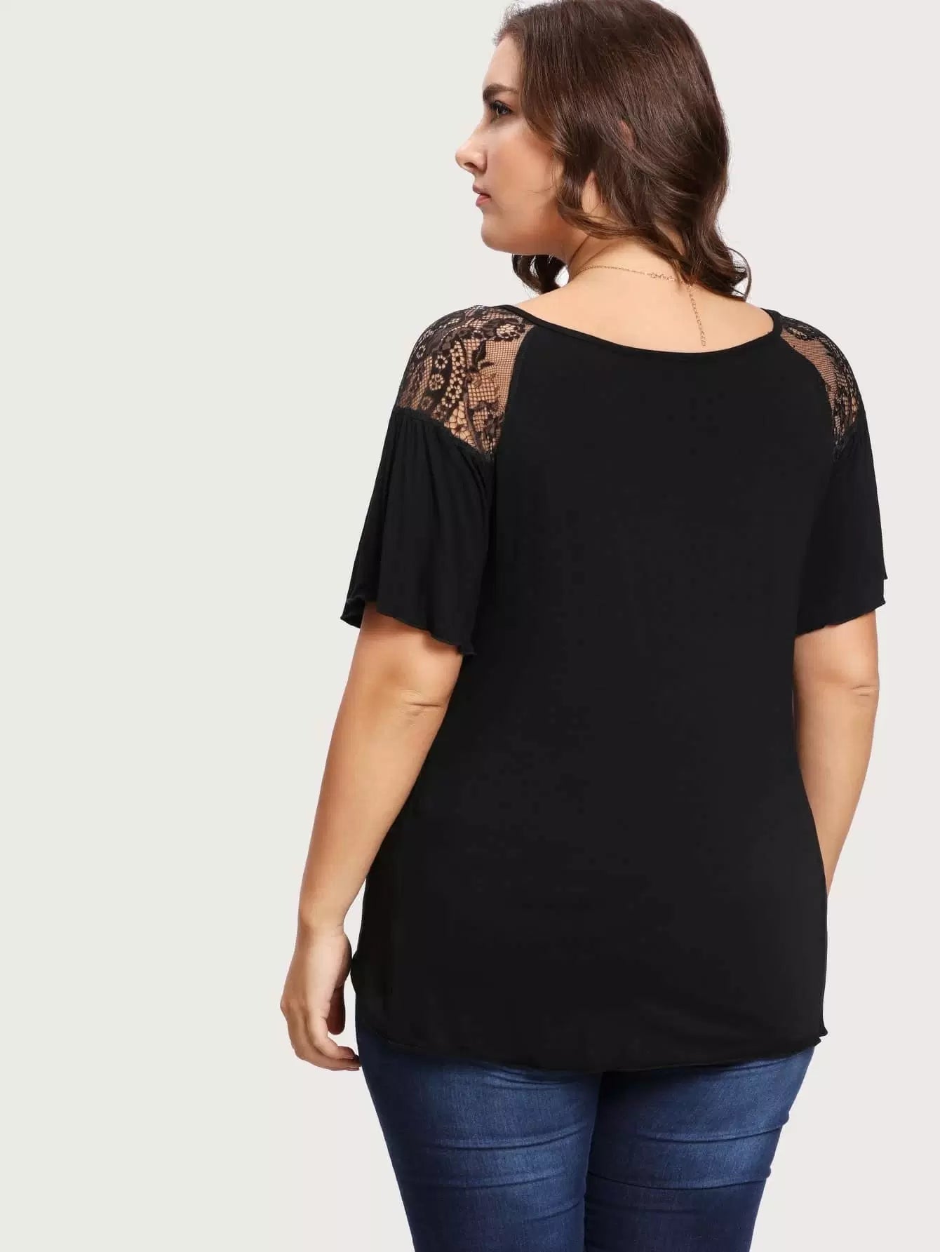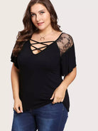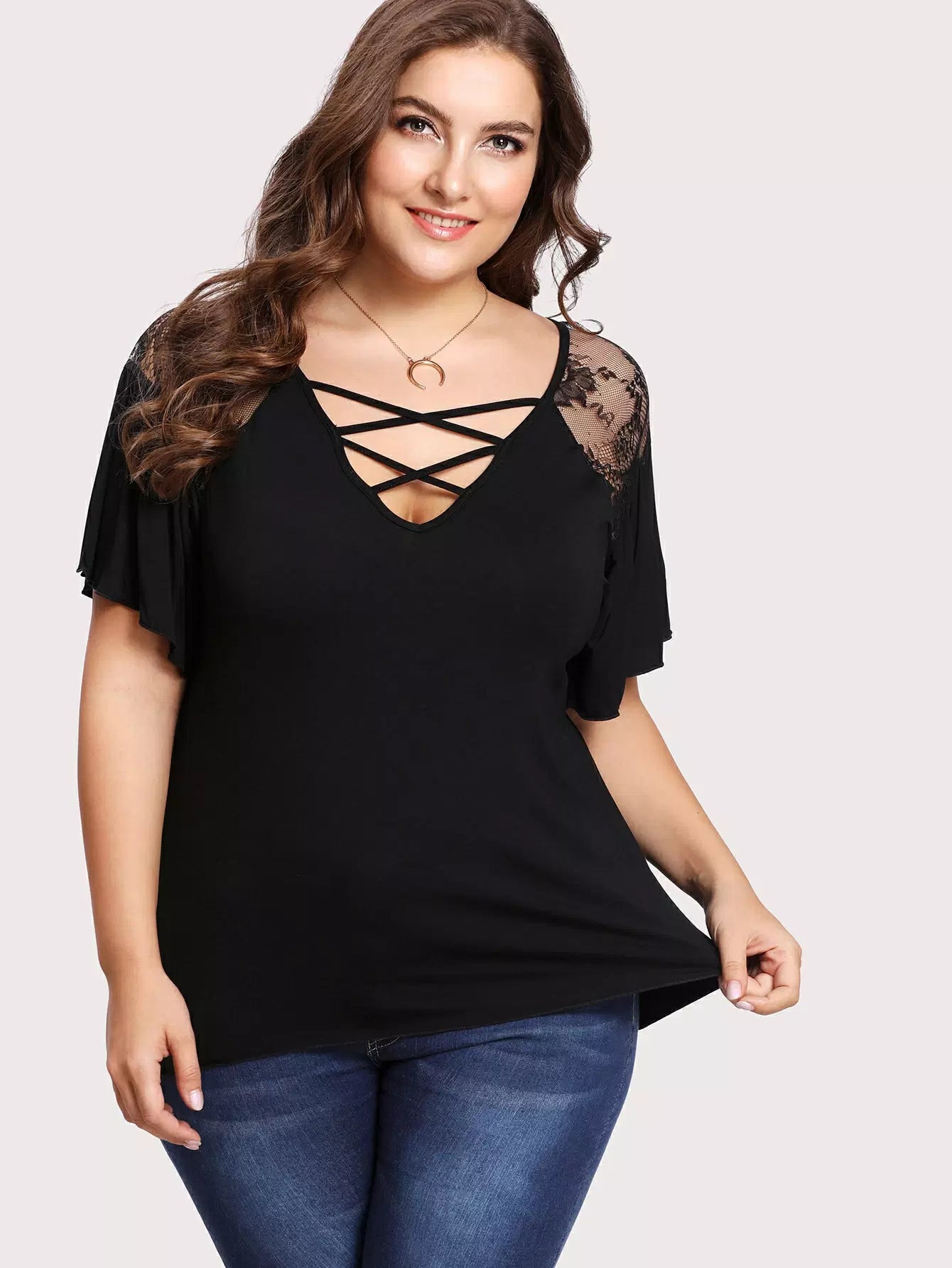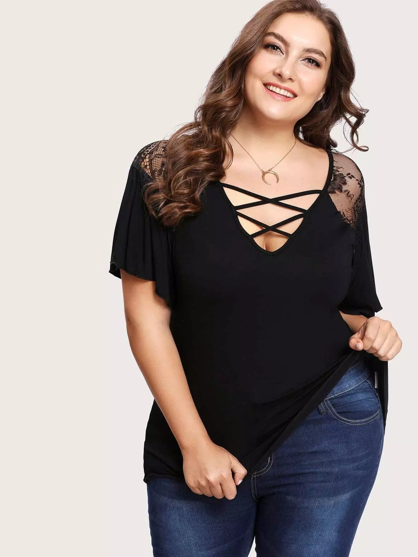 نحيف - مقاس كبير تي شيرت برقبة متقاطعة وأكتاف من الدانتيل