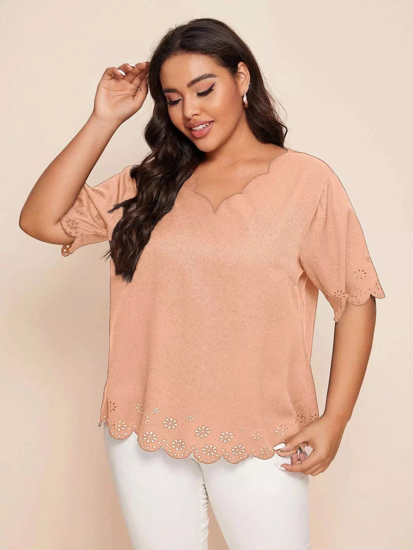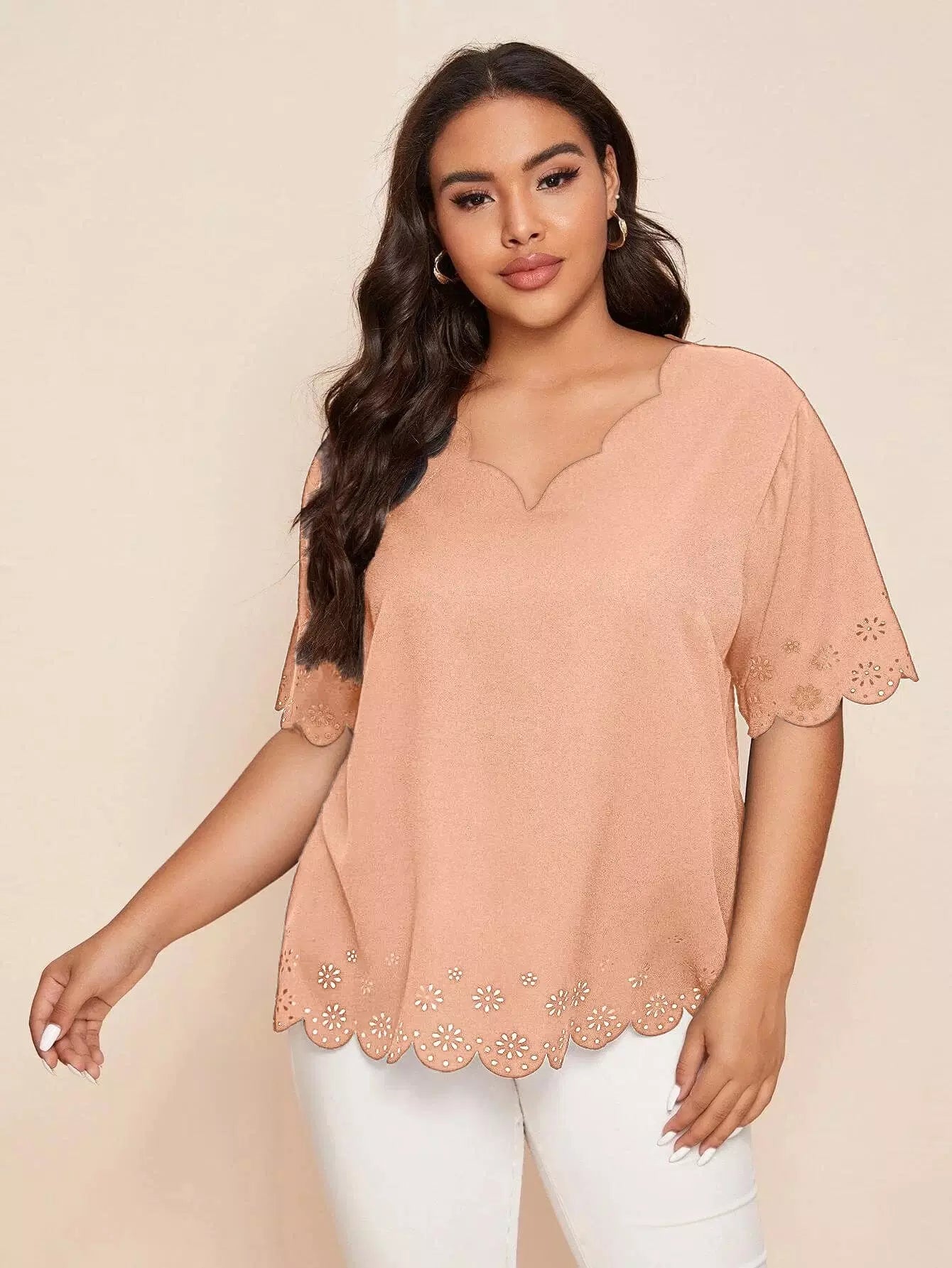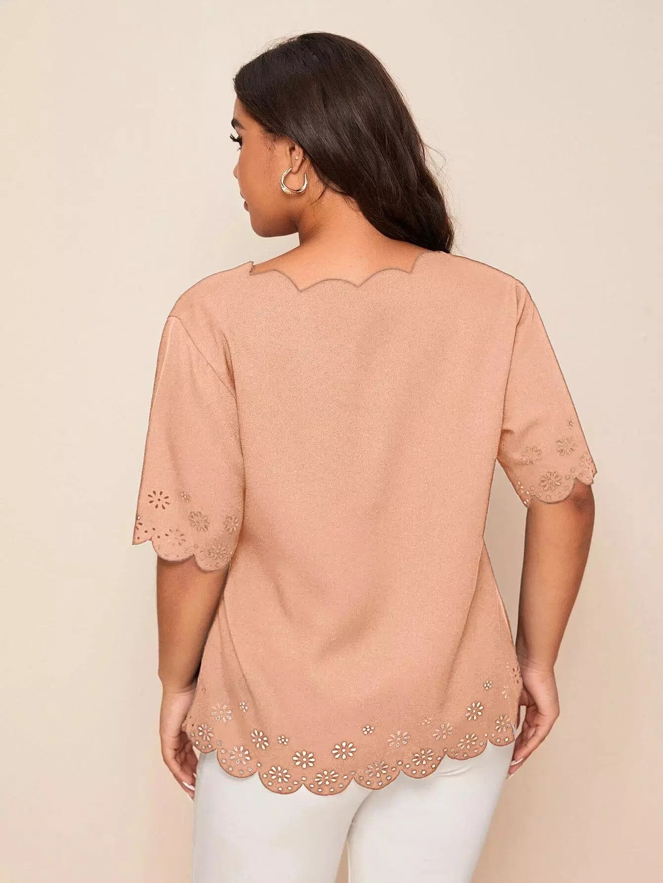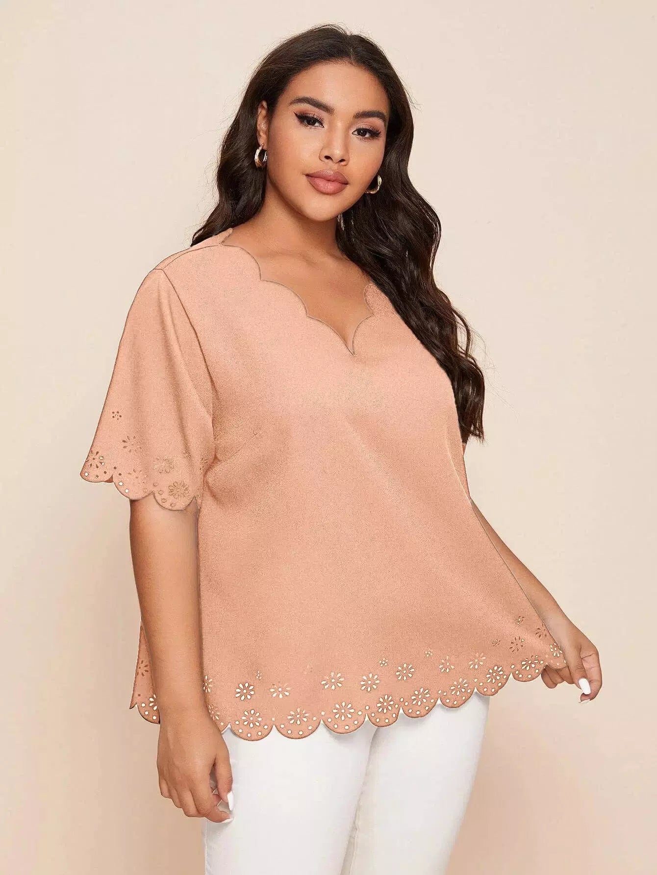نحيف - مقاس كبير بلوزة بأطراف صدفية مقطوعة بالليزر