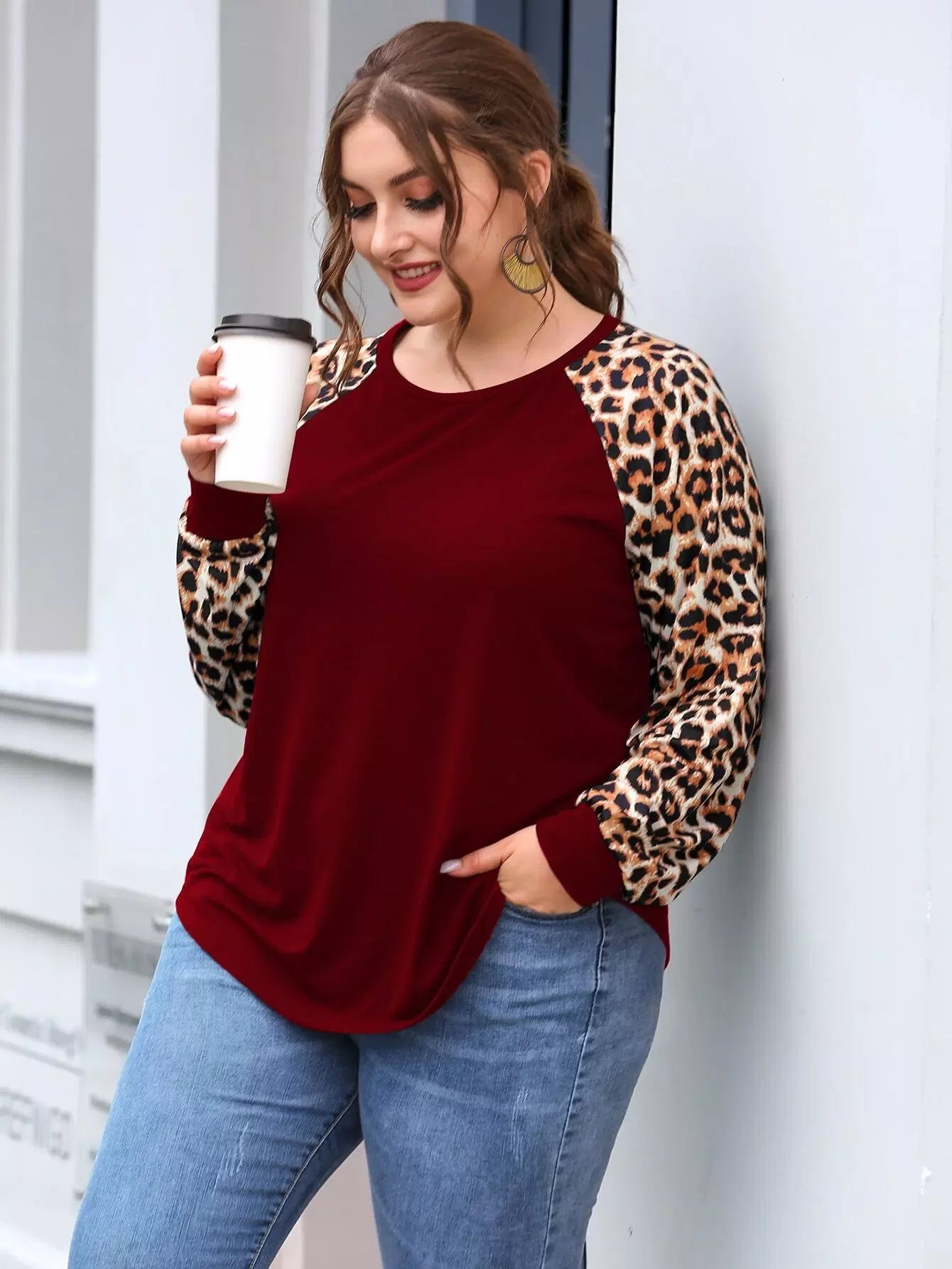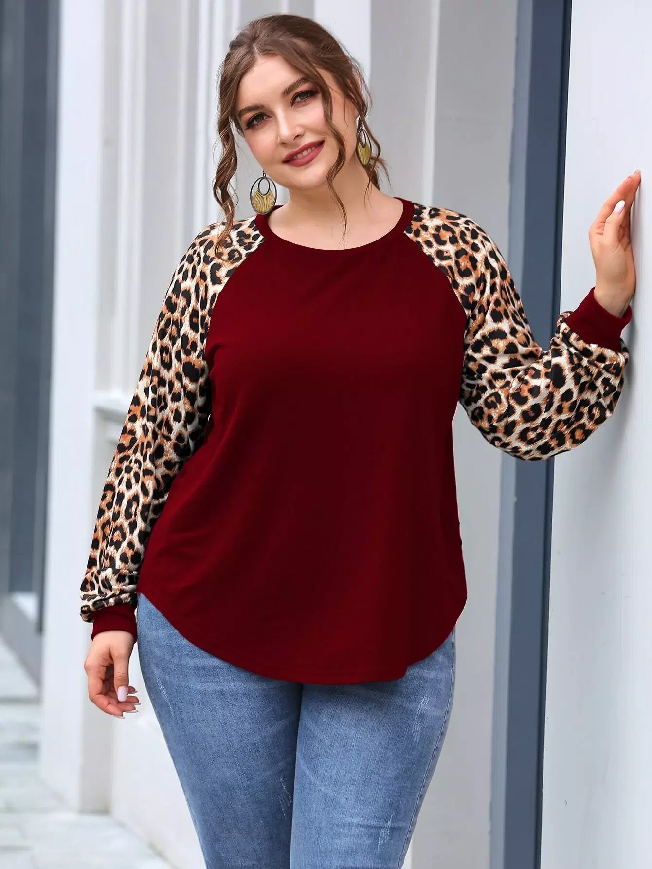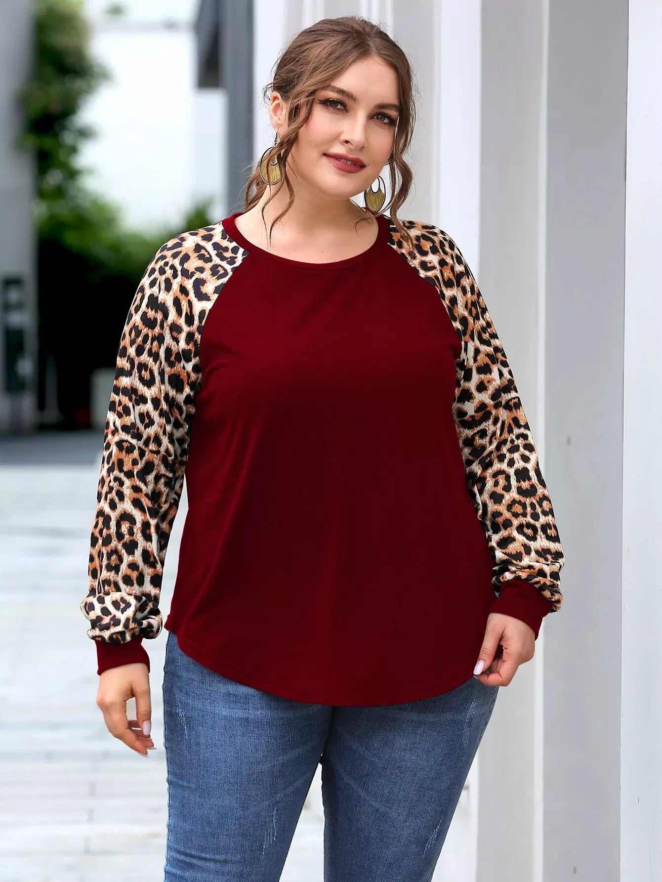 تي شيرت بأكمام راجلان بأطراف منحنية بنقشة جلد الفهد