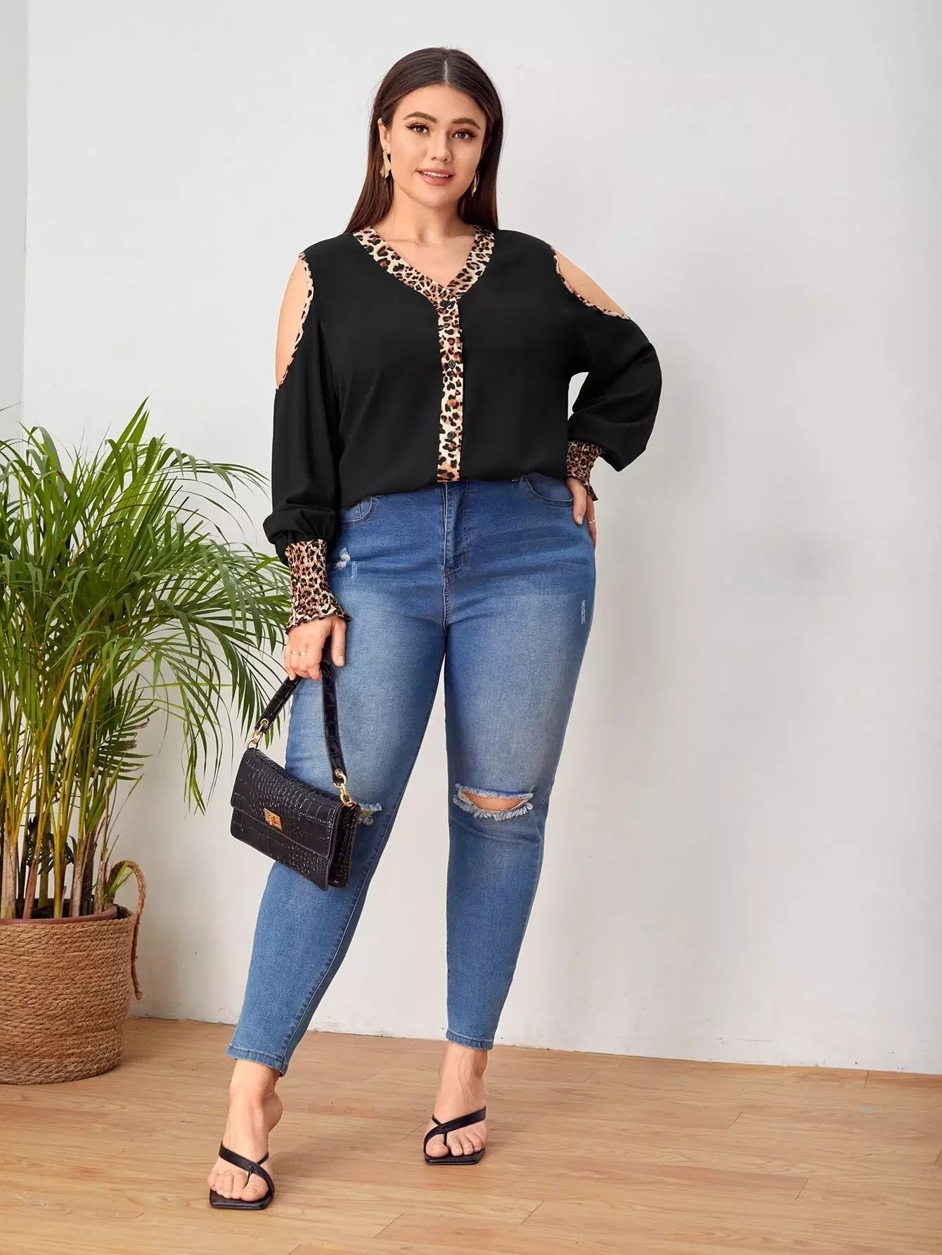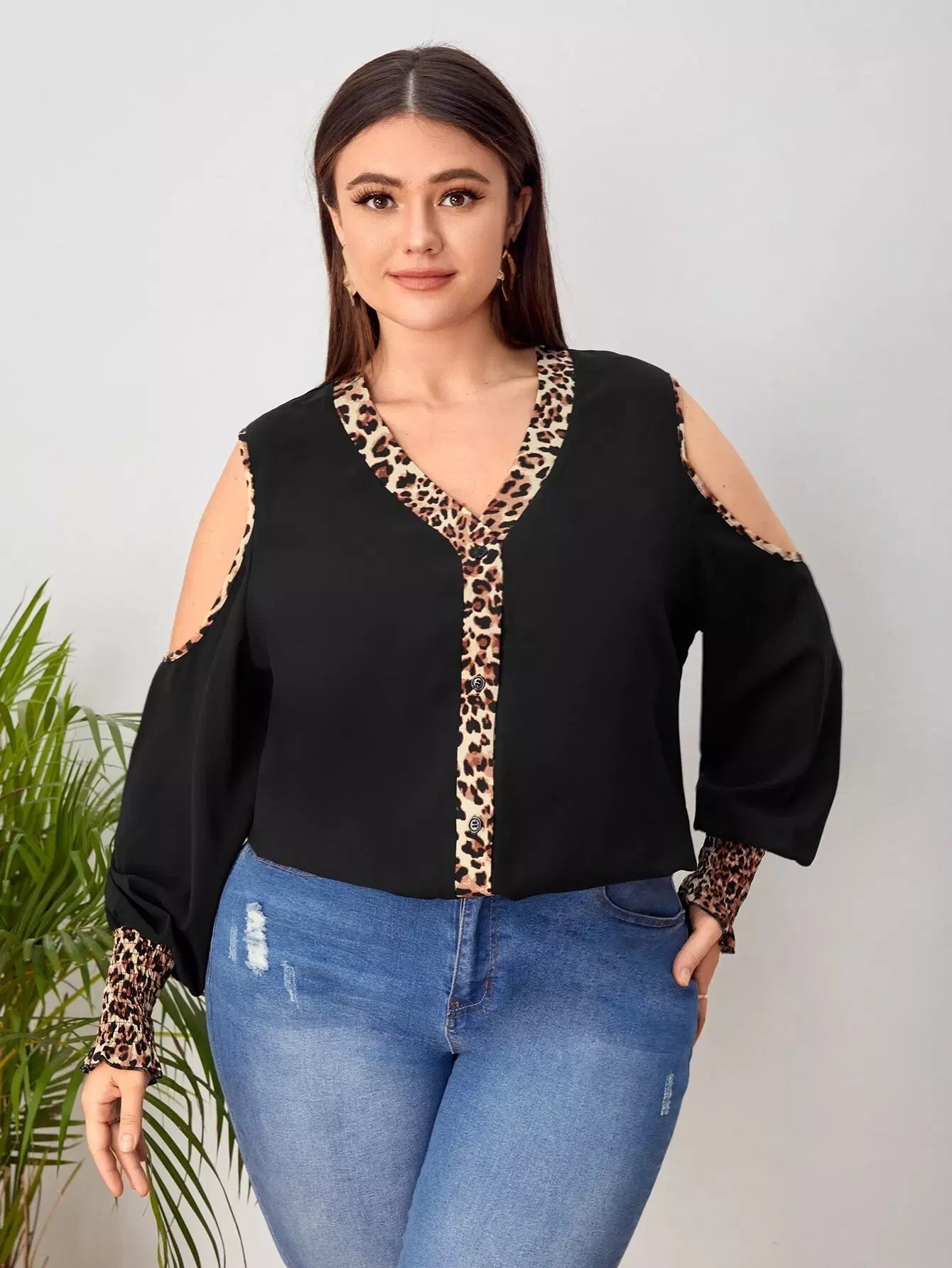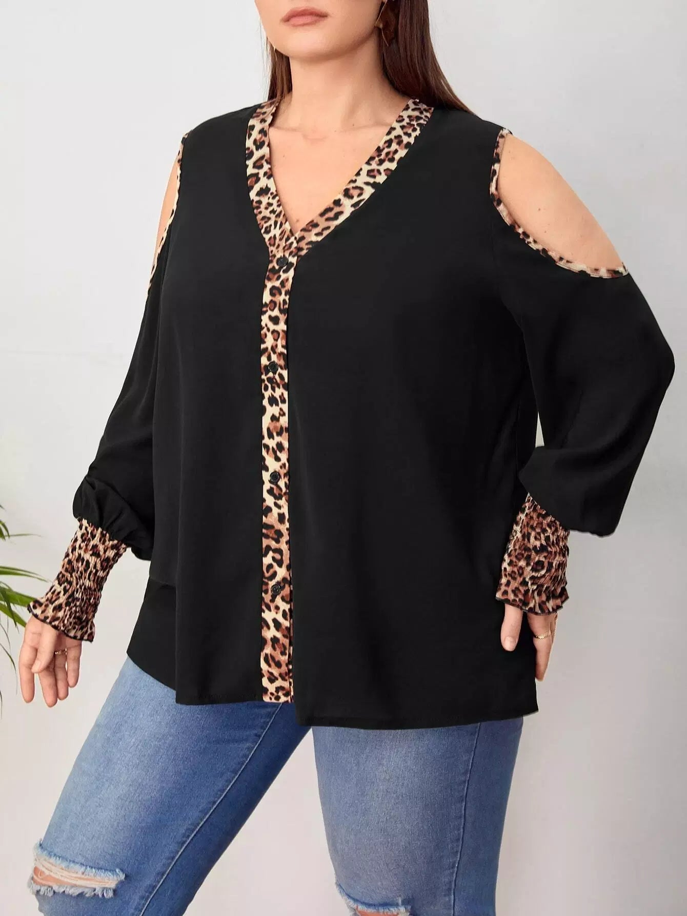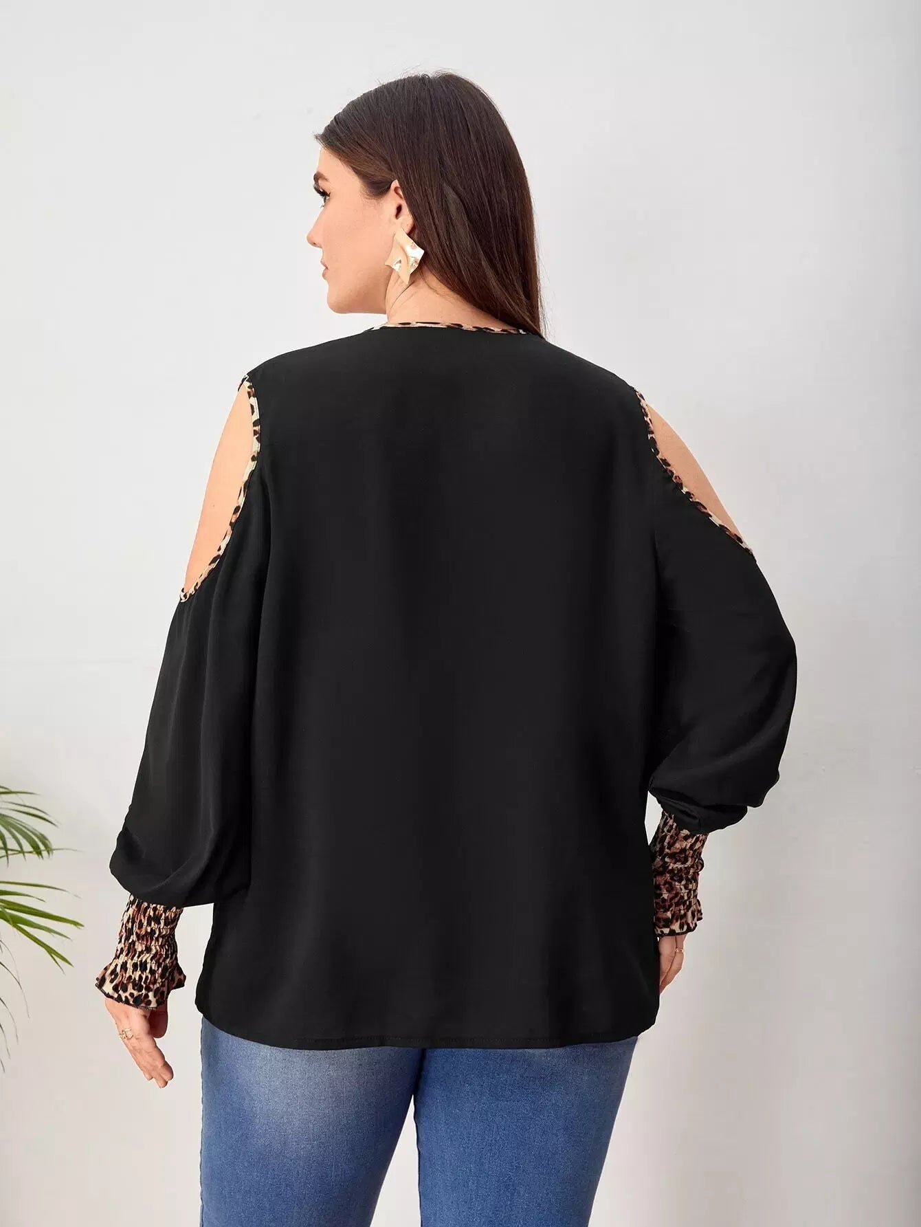 بلوزة ذات أكمام بأكتاف باردة بأكمام شيرد فانوسية مزينة بحواف من جلد النمر