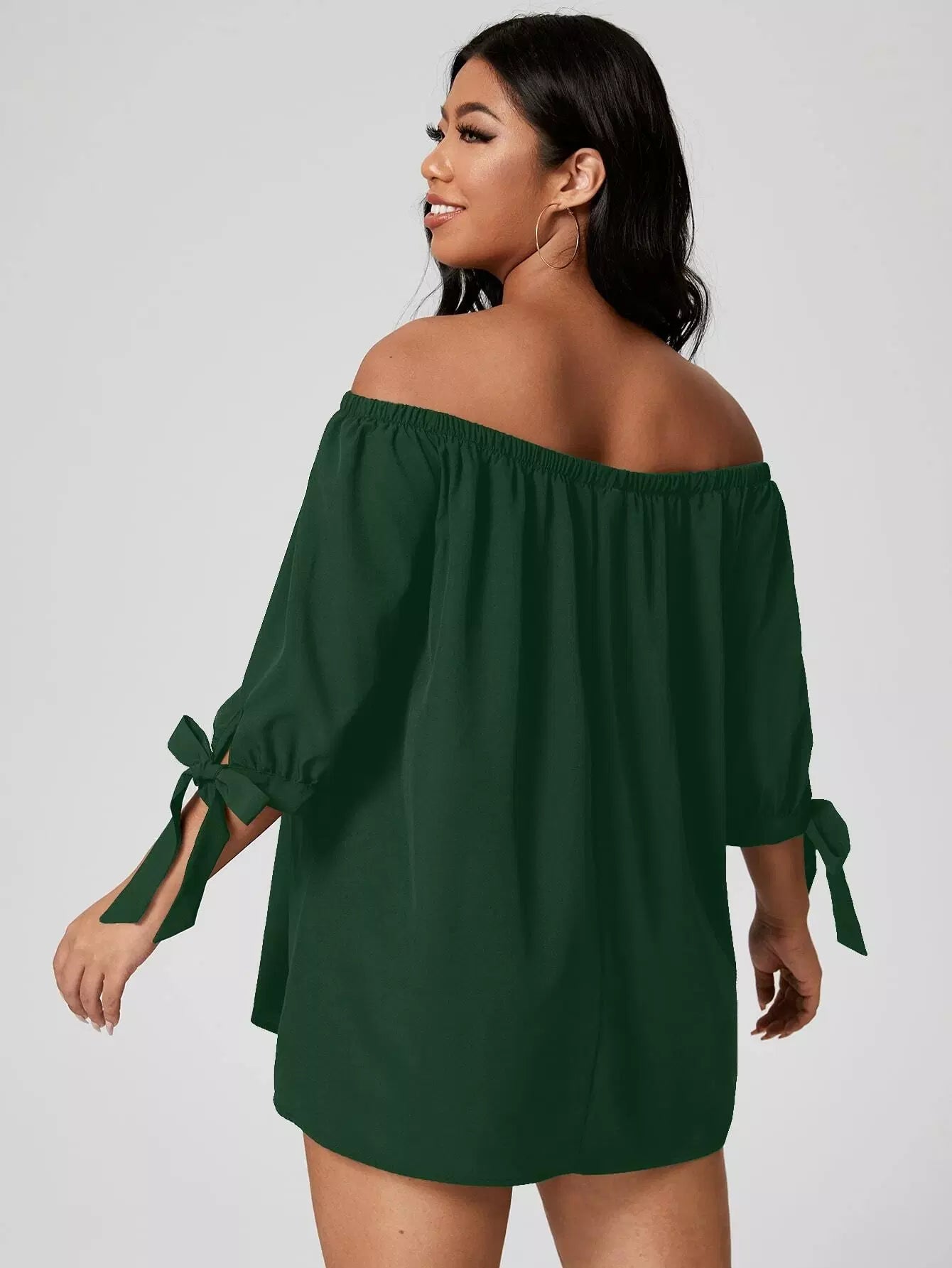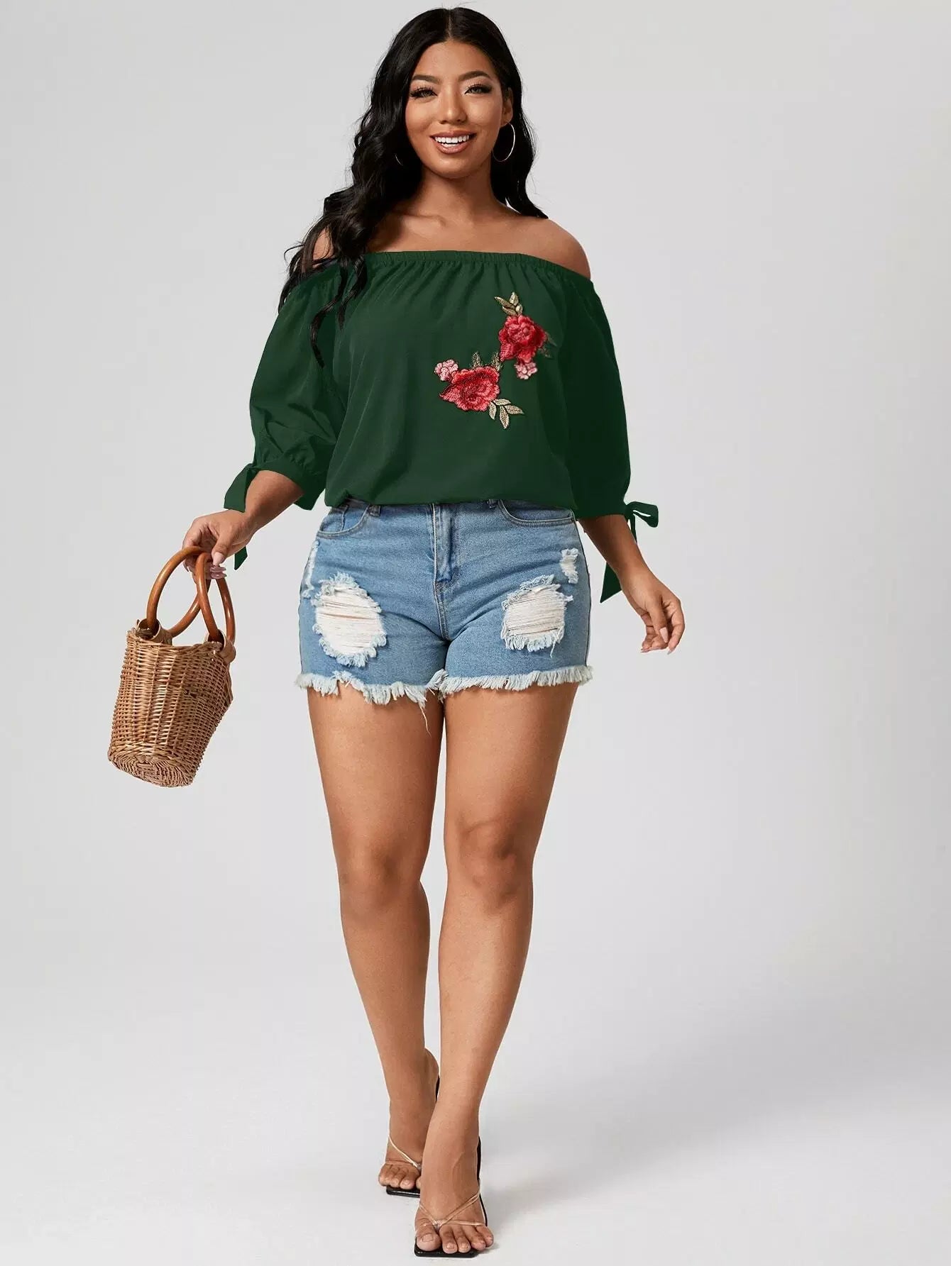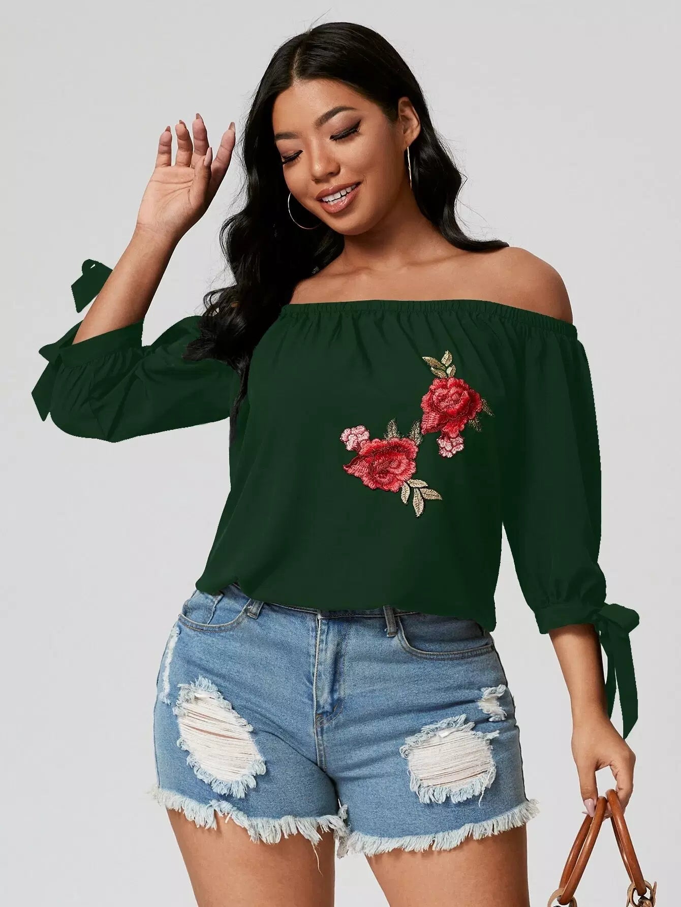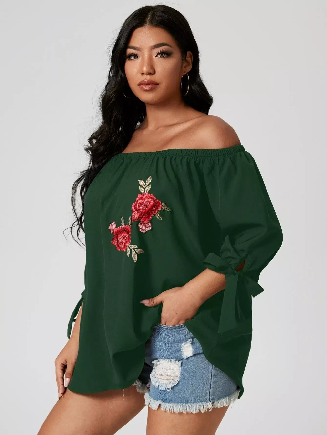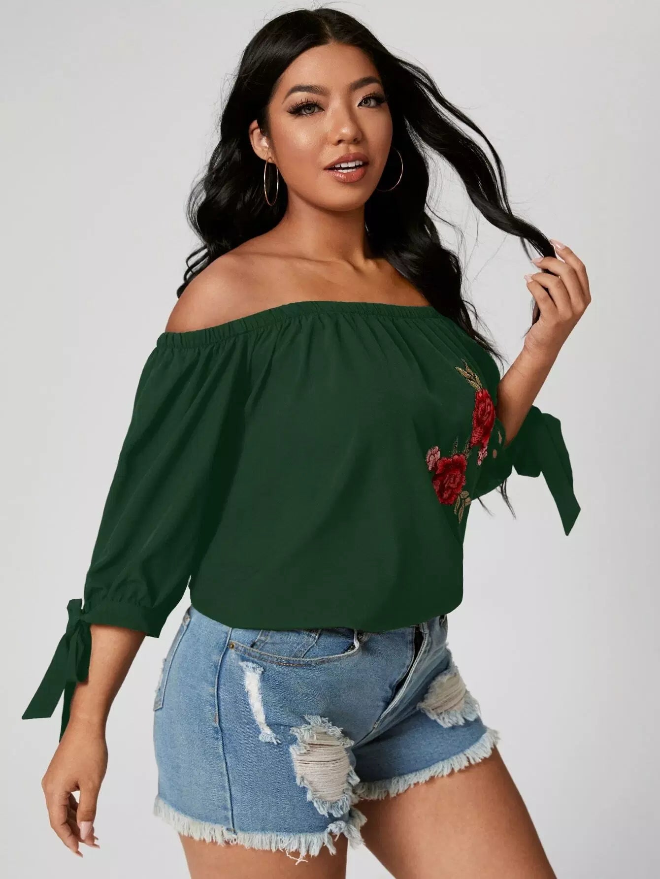 بلوزة مطرزة بالورود ومزينة بعقدة على الأكتاف بدون أكتاف