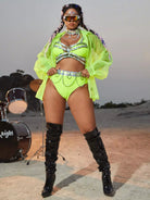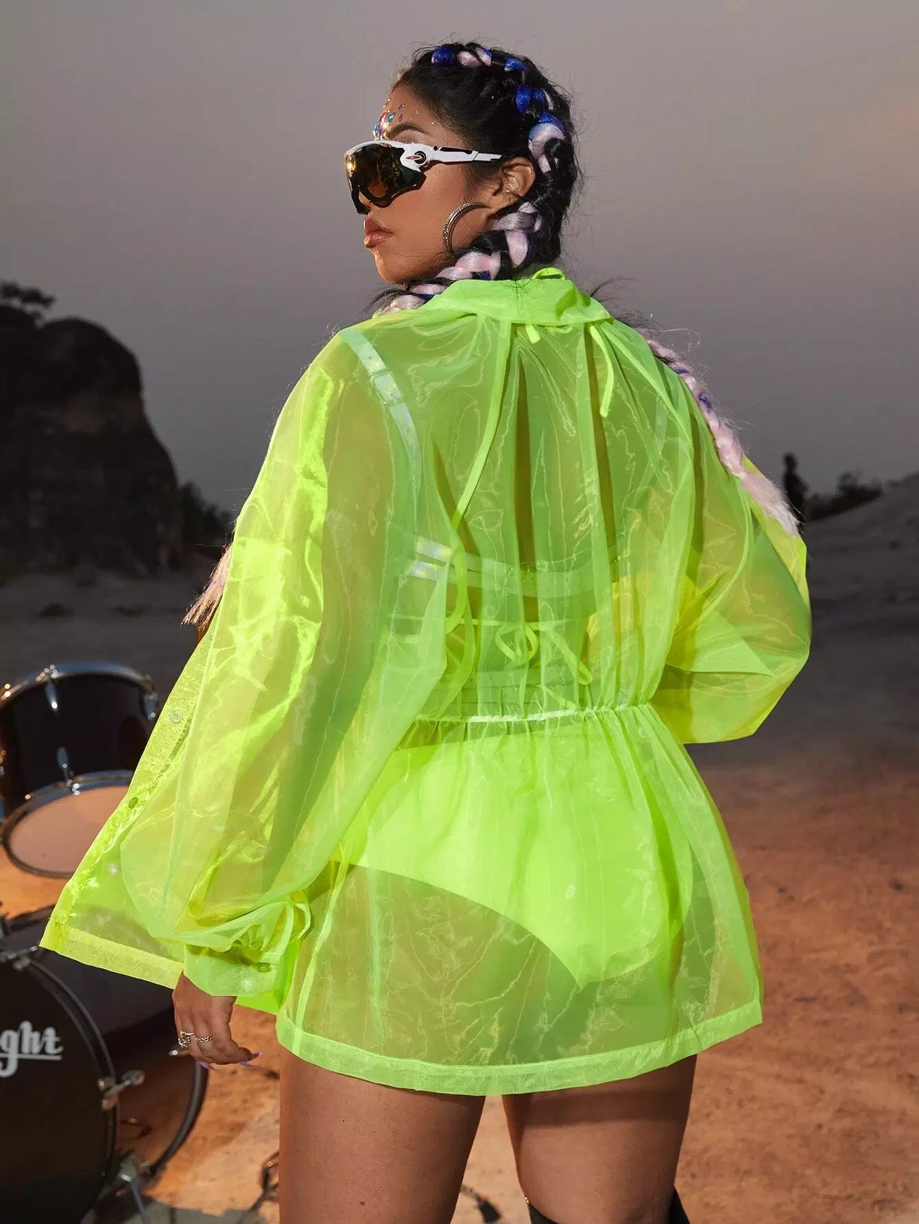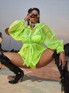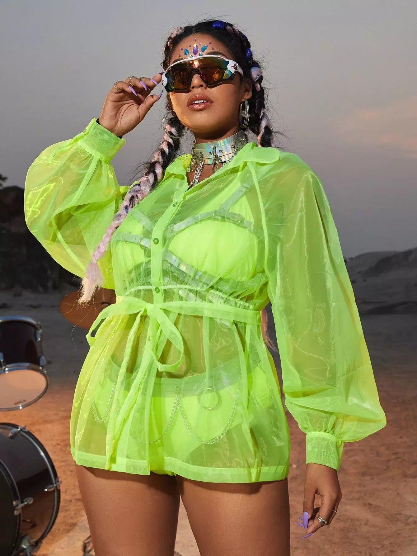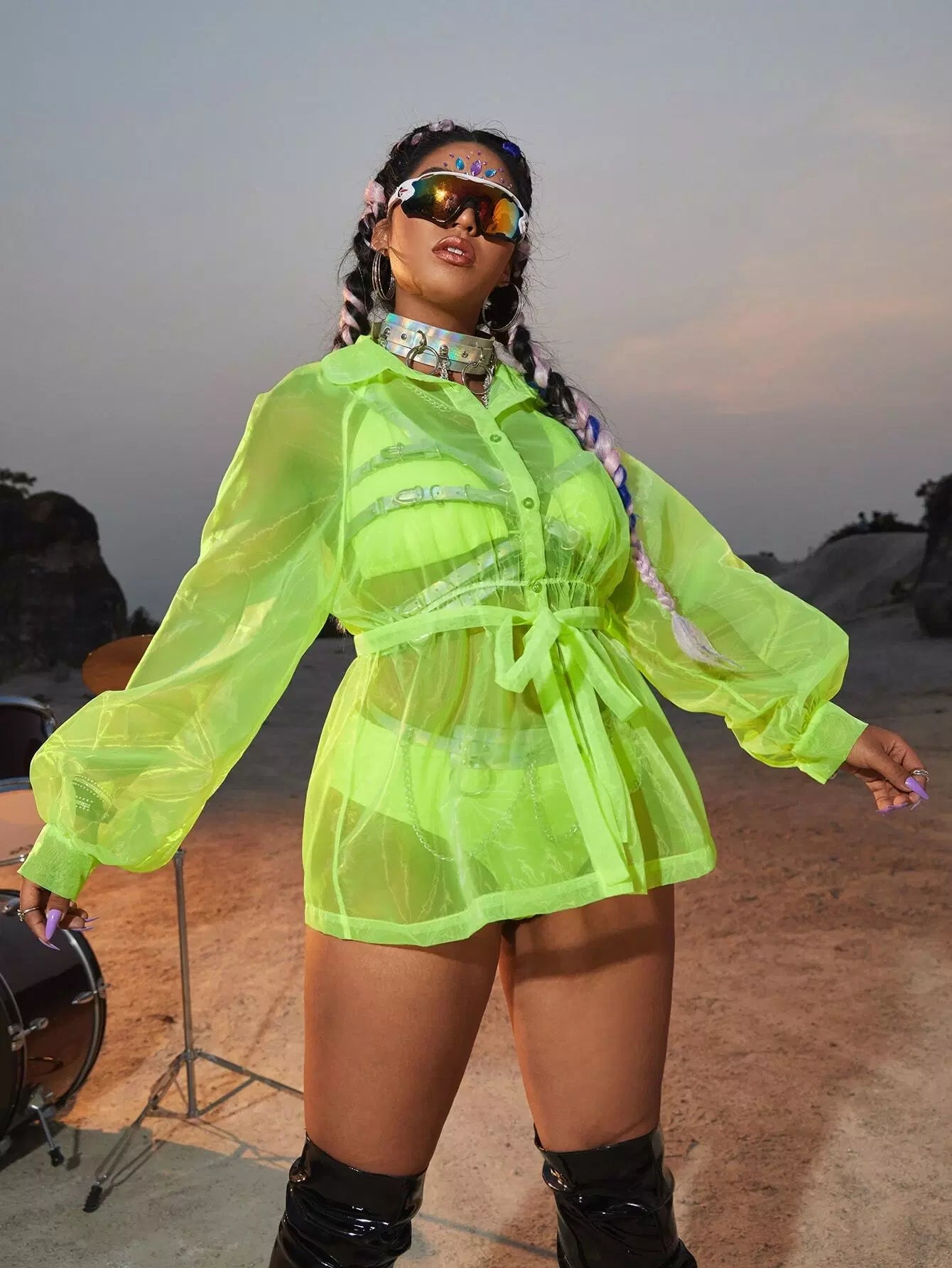 بلوزة بلاس أورجانزا شفافة ذات ربطة عنق شفافة بدون ملابس داخلية