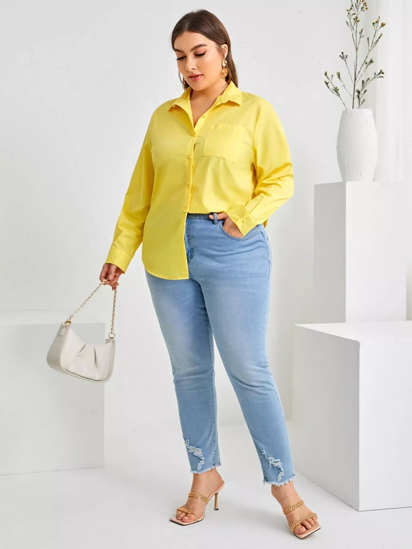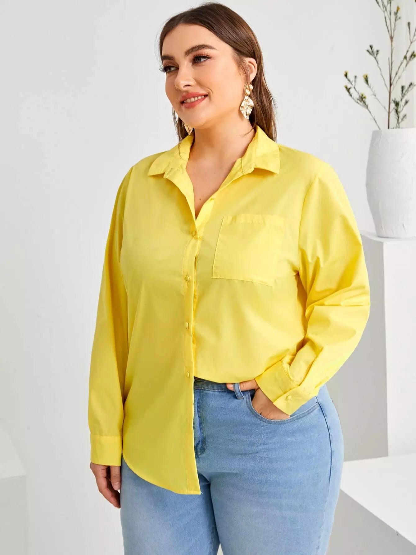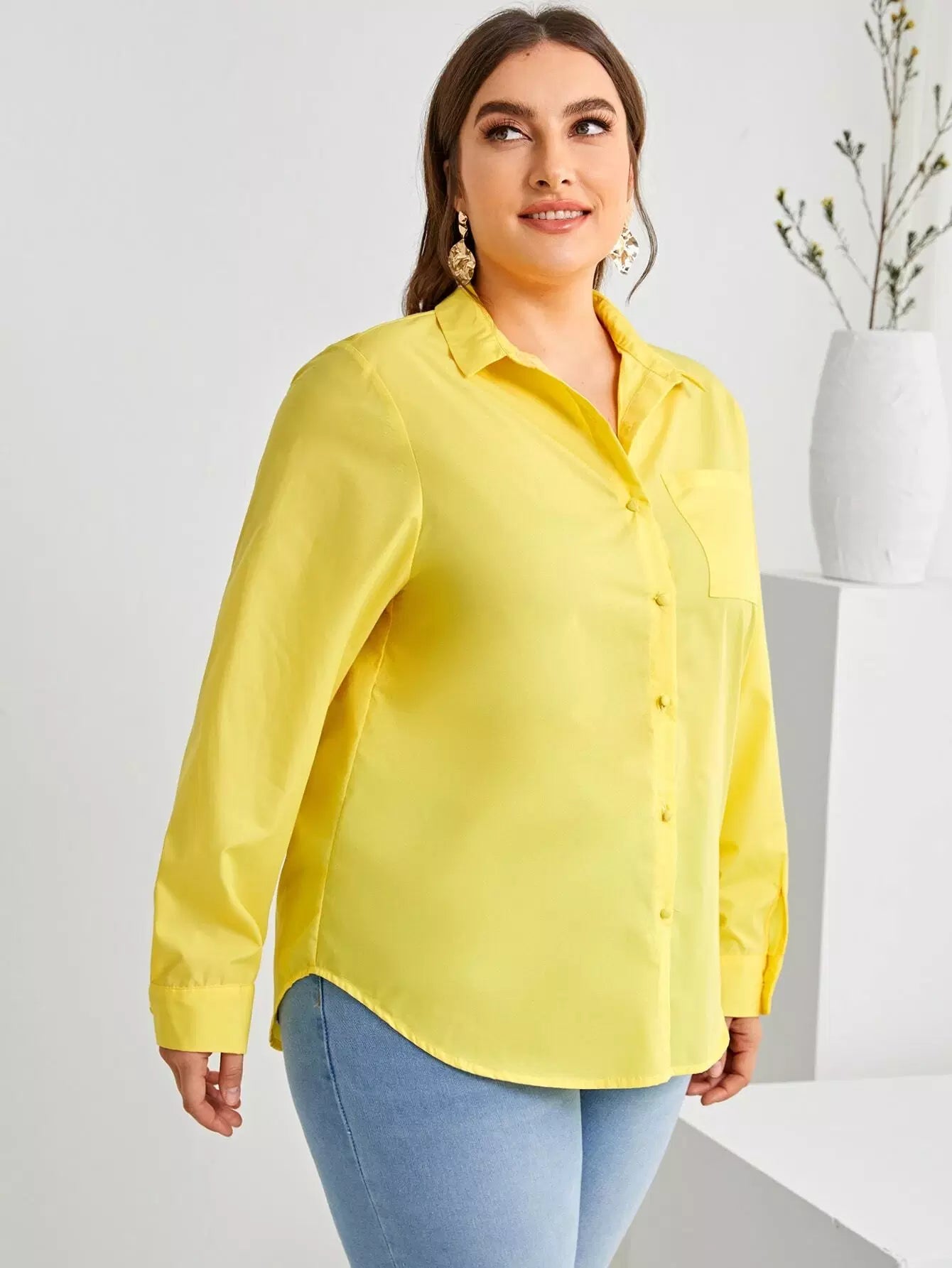 بلوزة سادة بحاشية منحنية ذات جيبين منحنية بلاس بلوزة سادة