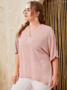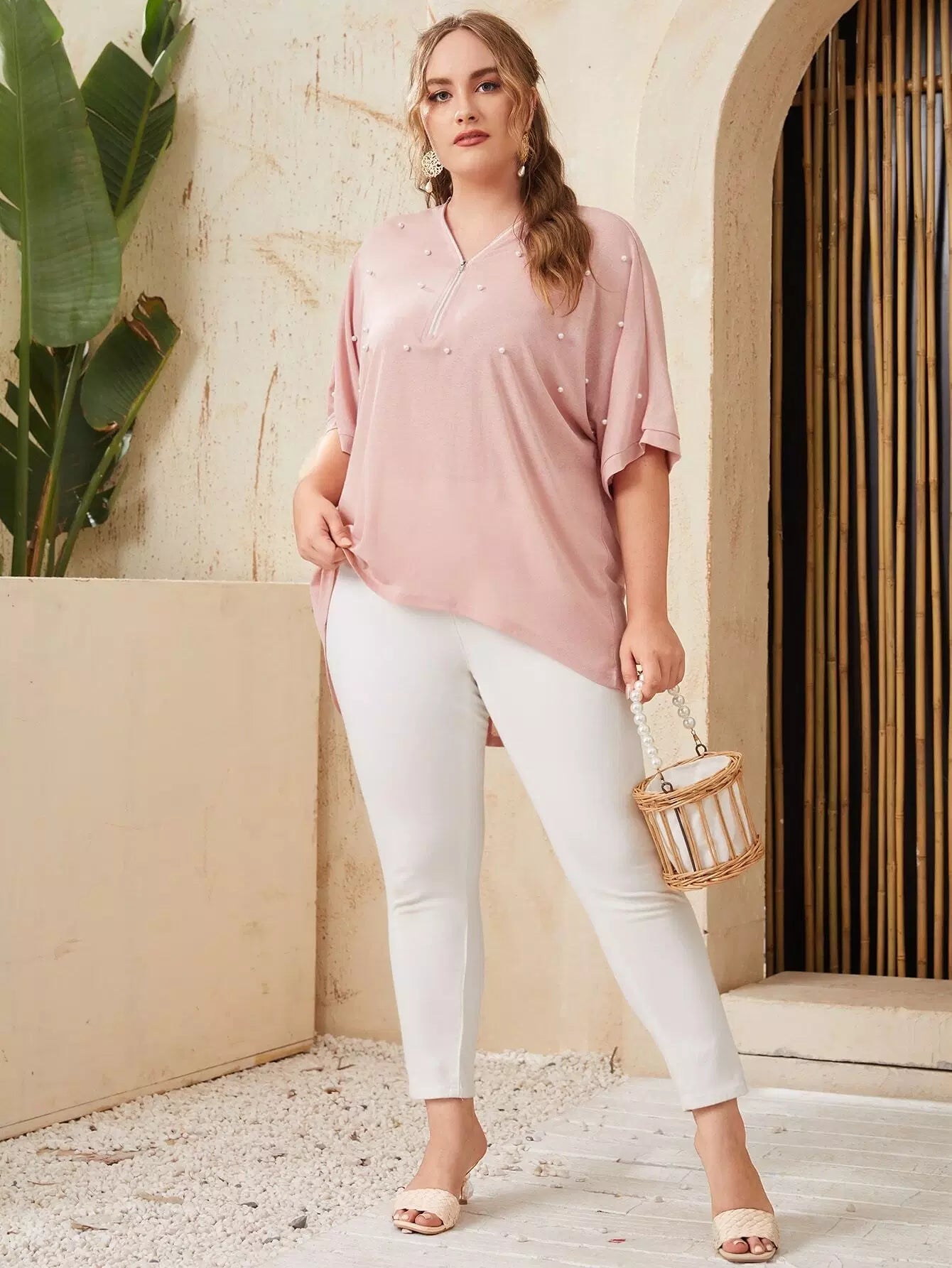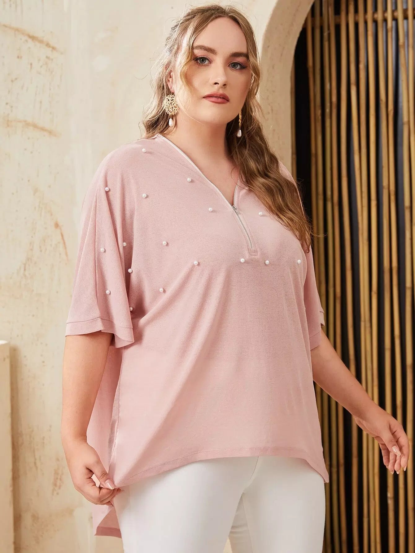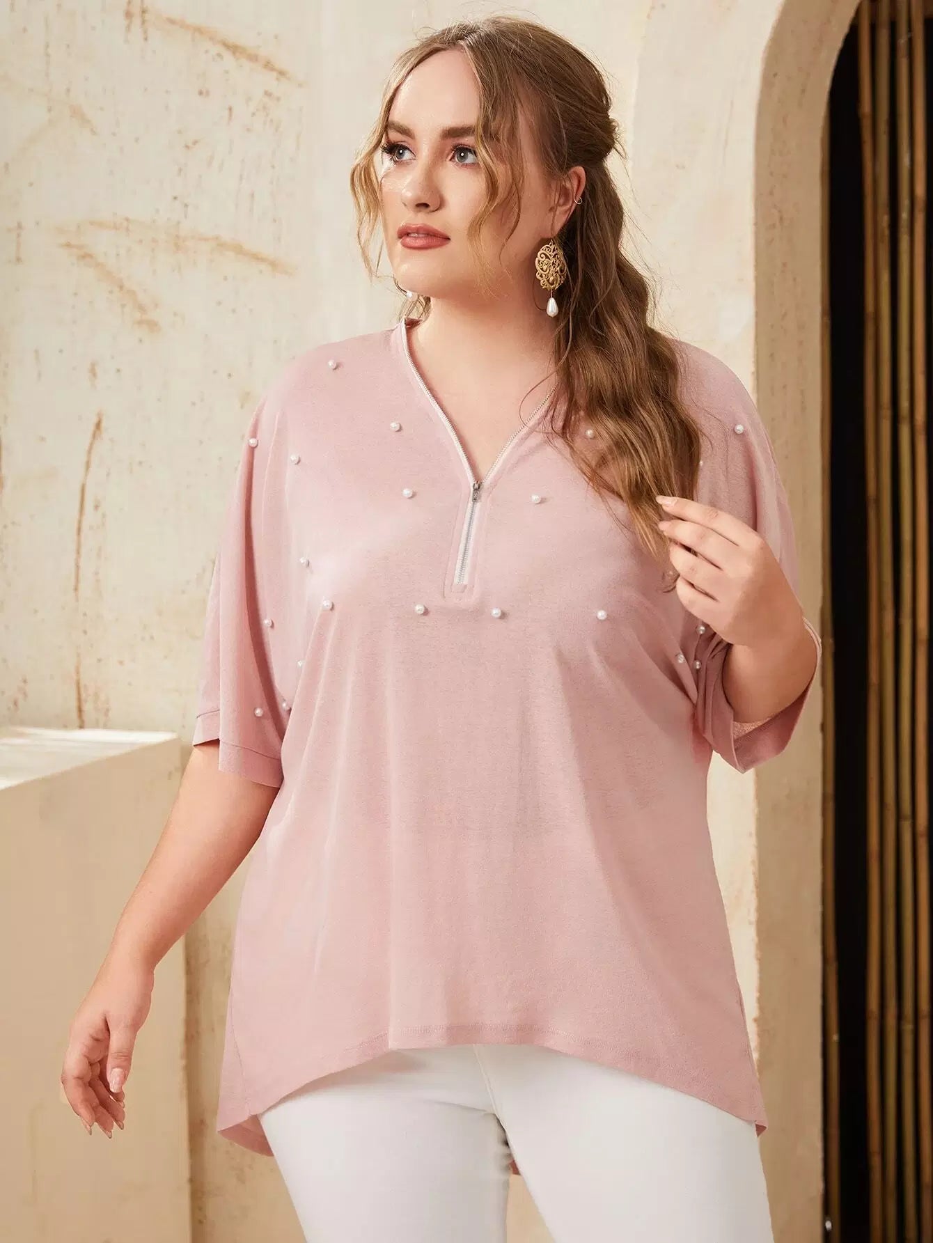 بلوزة بحافة مرتفعة منخفضة عالية الحواف مطرزة بالخرز واللؤلؤ