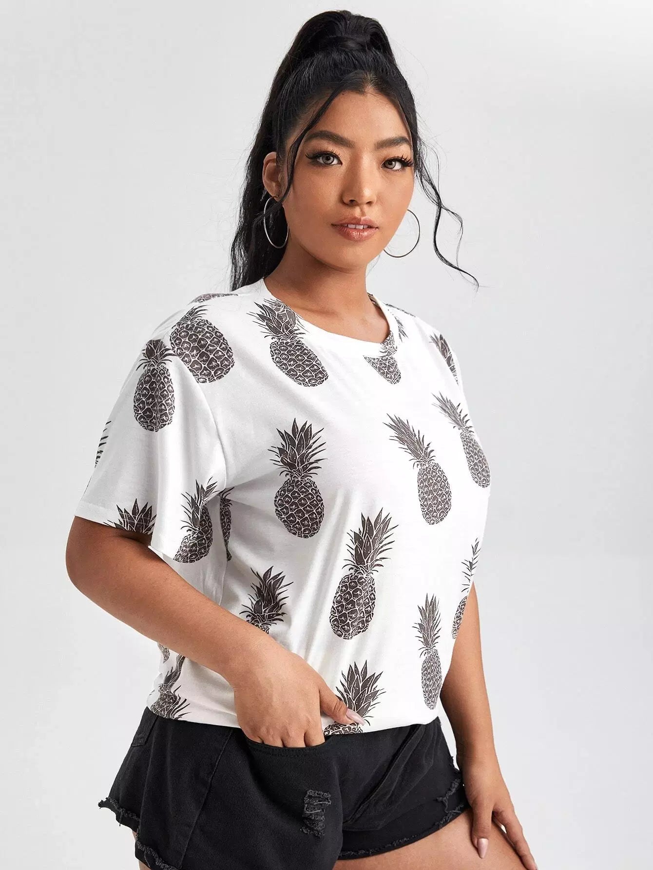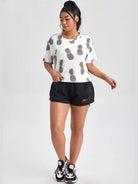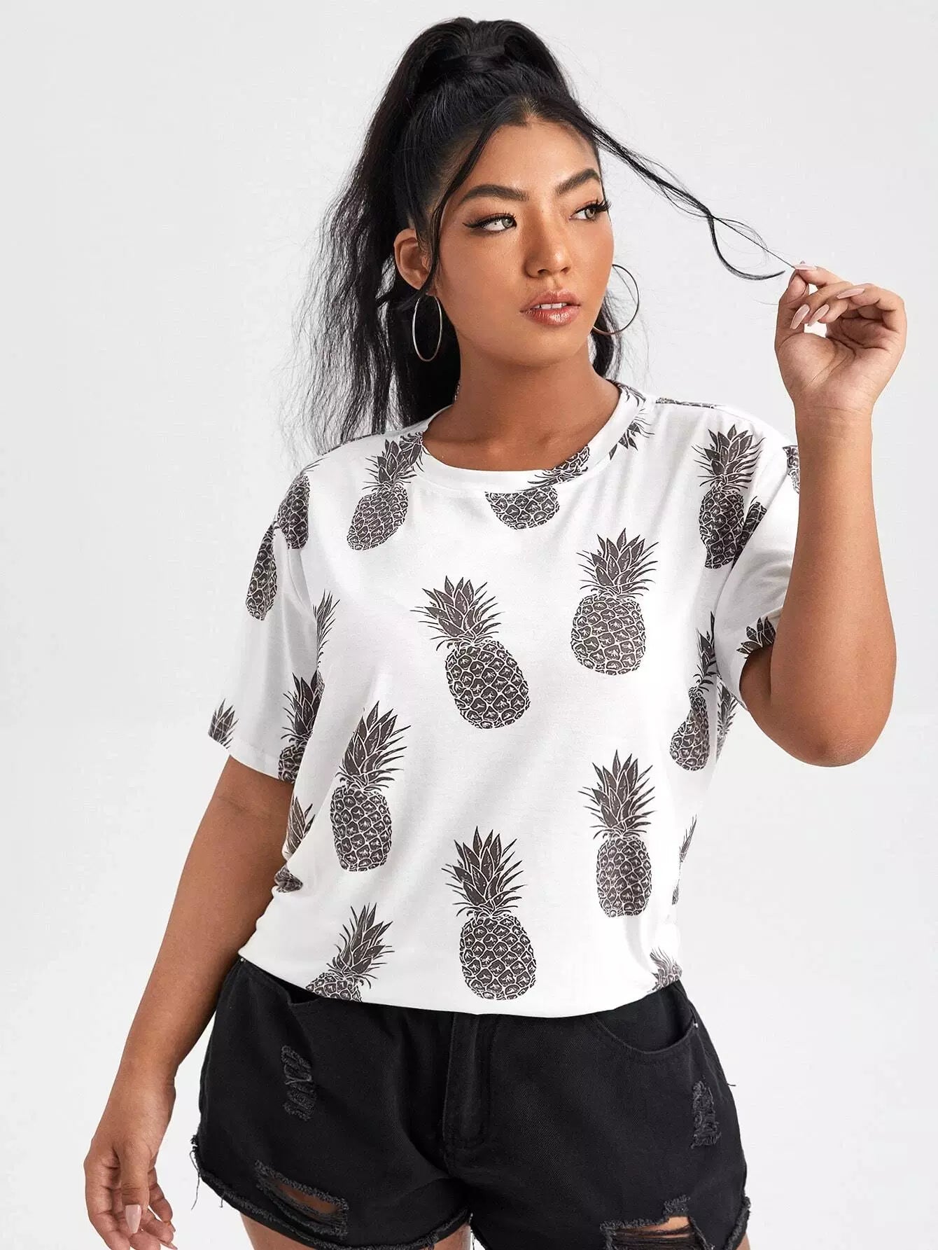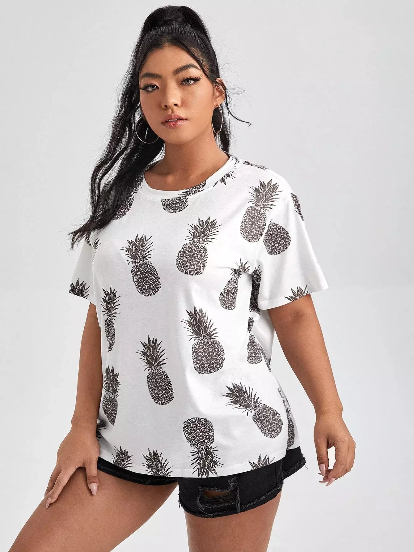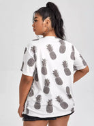 تي شيرت بكتف منسدل مطبوع عليه طبعة أناناس بلس
