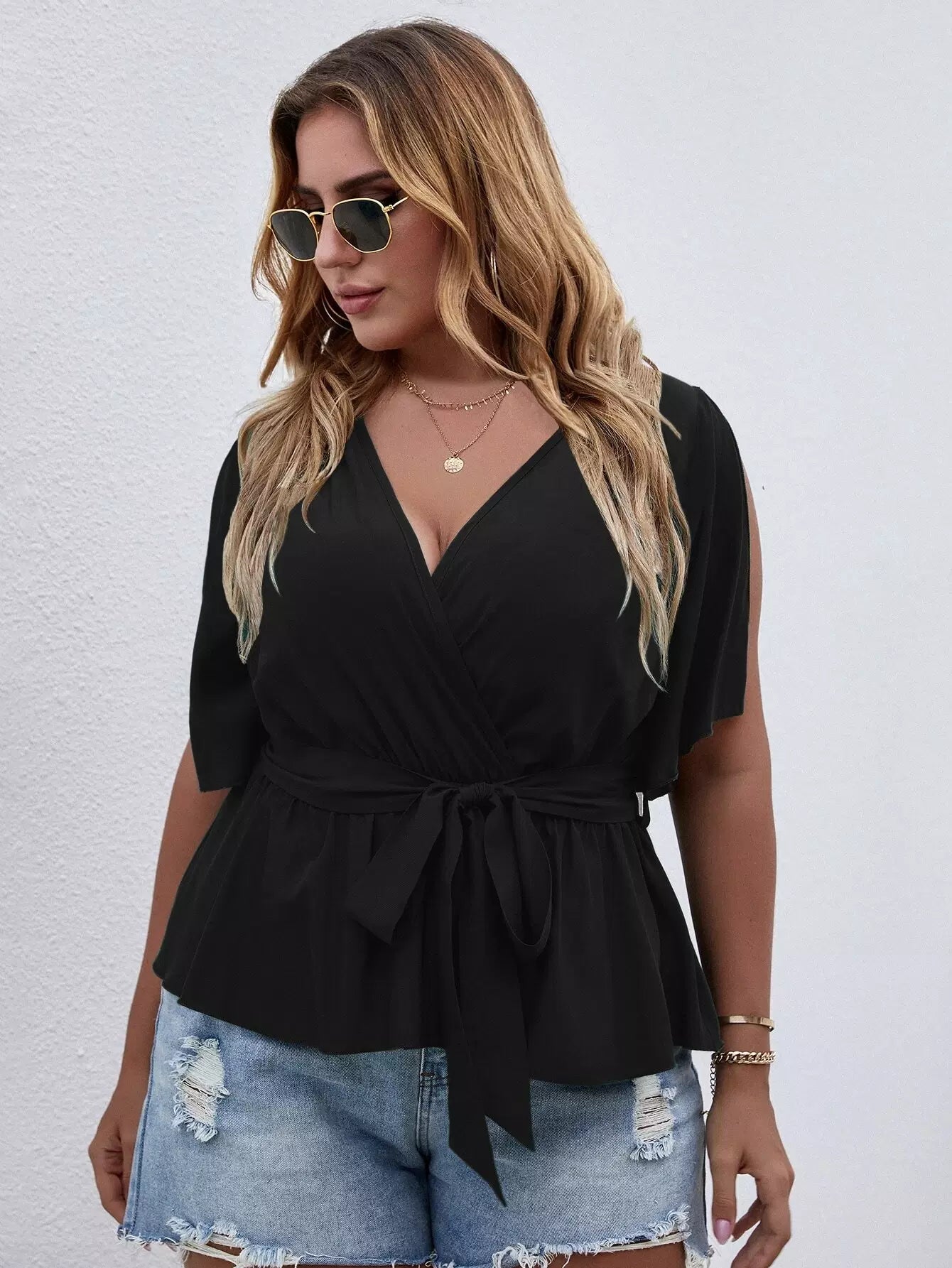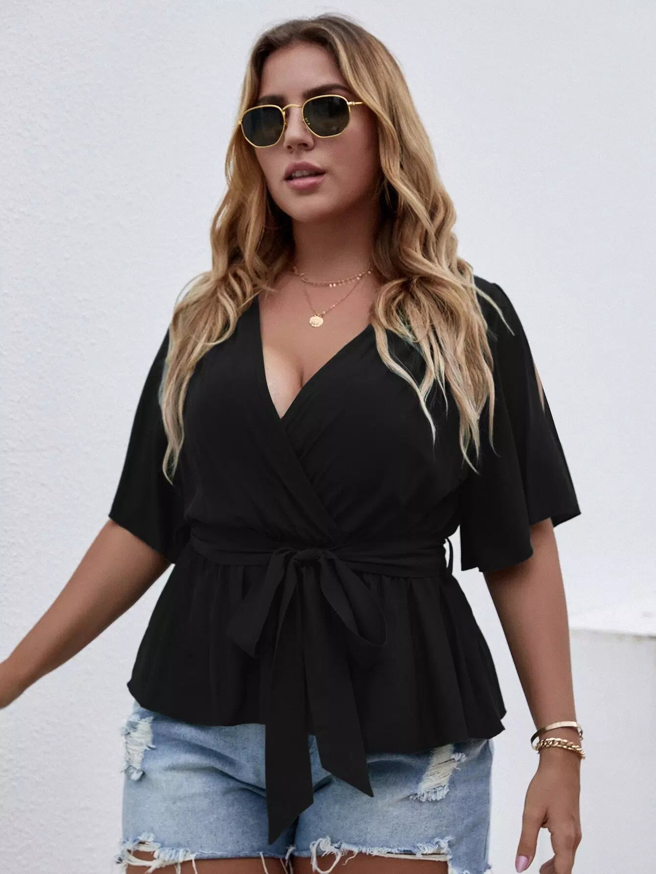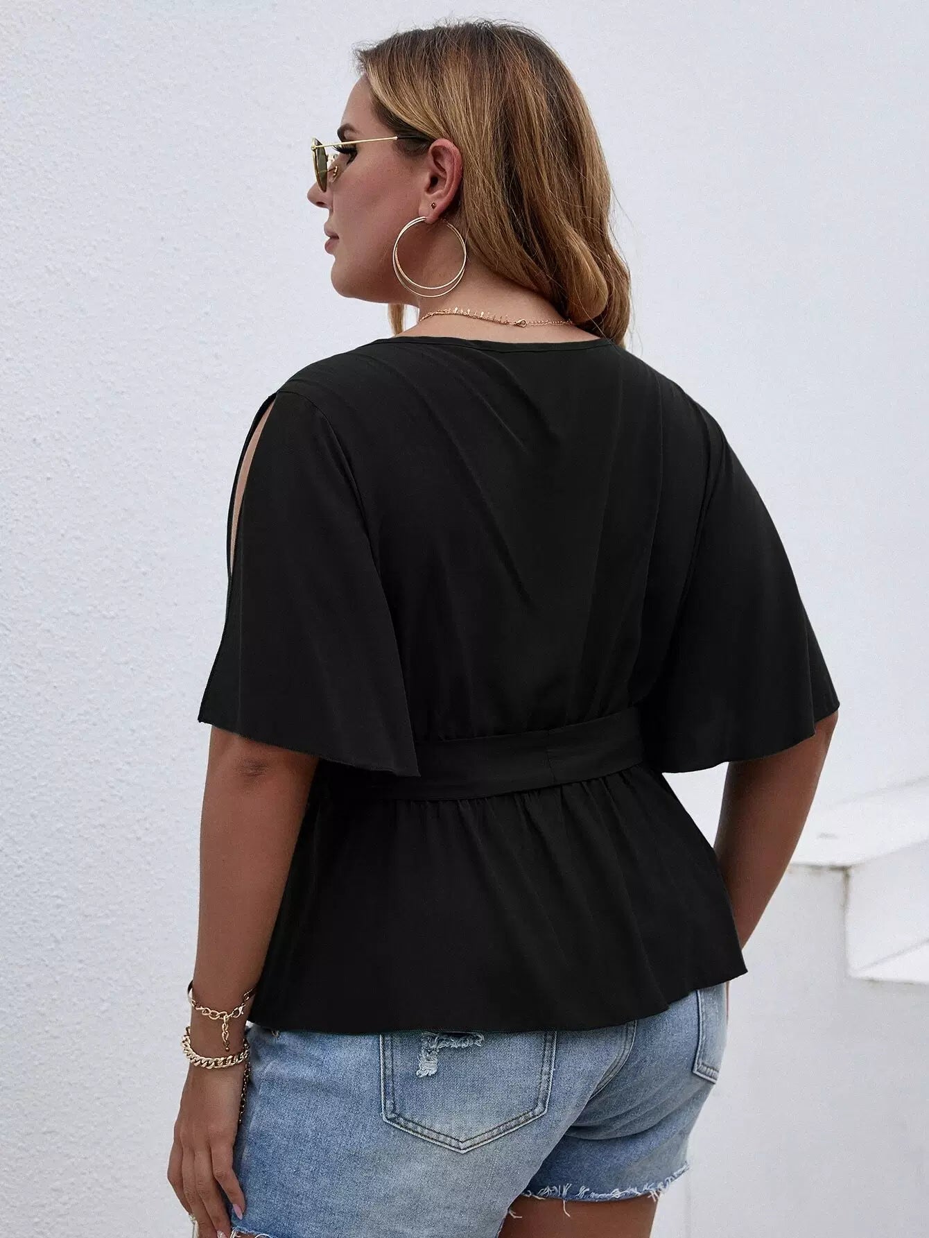بالإضافة إلى بلوزة بيبلوم ذات فتحة عنق عميقة وأكمام مقسمة بدون حزام