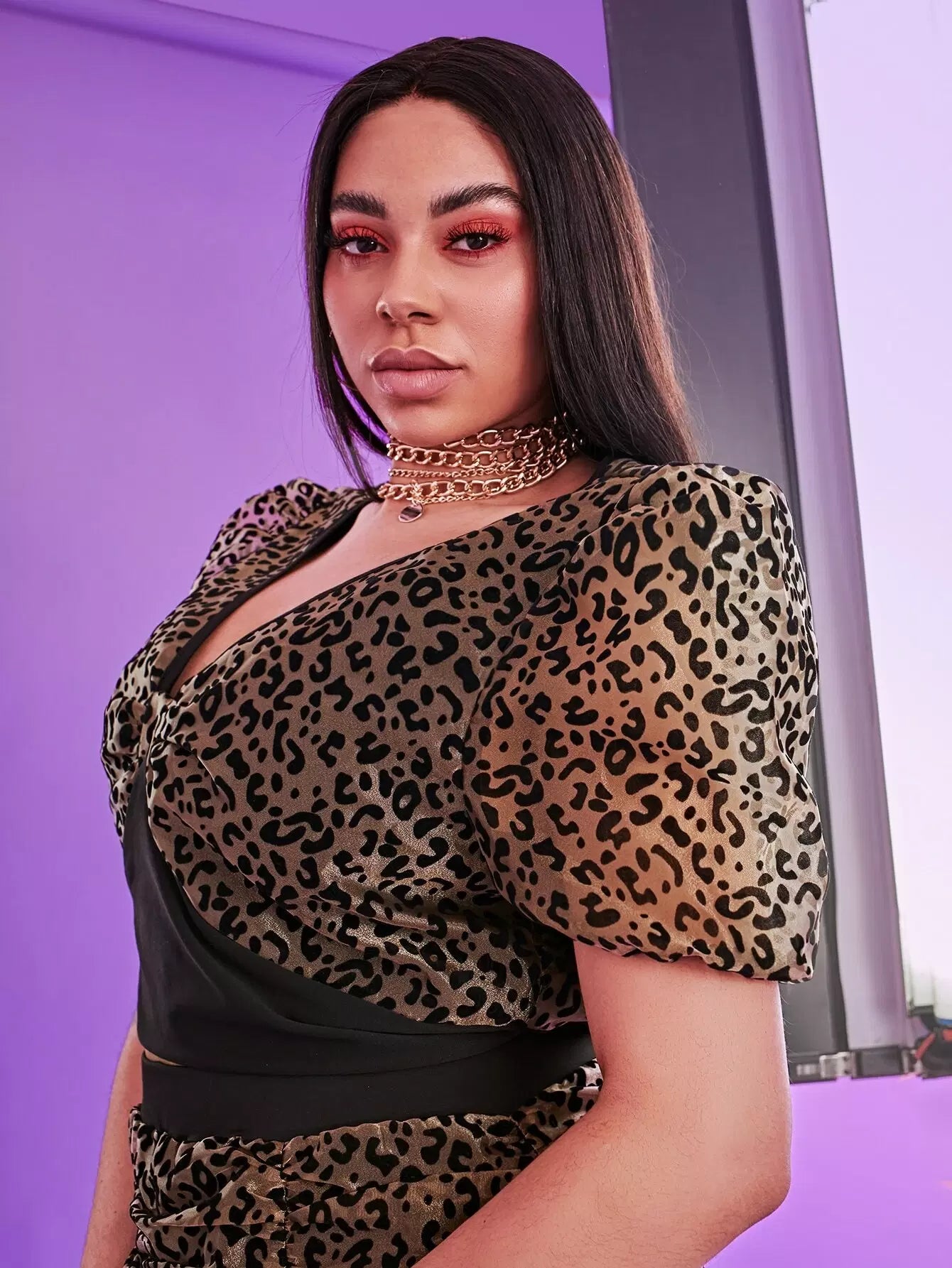 بلوزة بأكمام منفوشة بأورجانزا منفوشة بنقشة الفهد