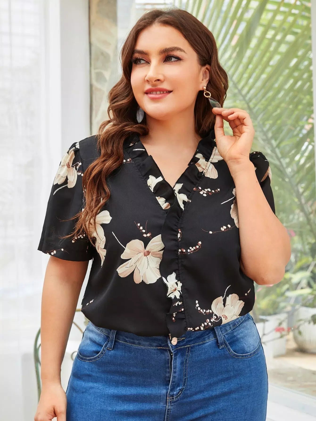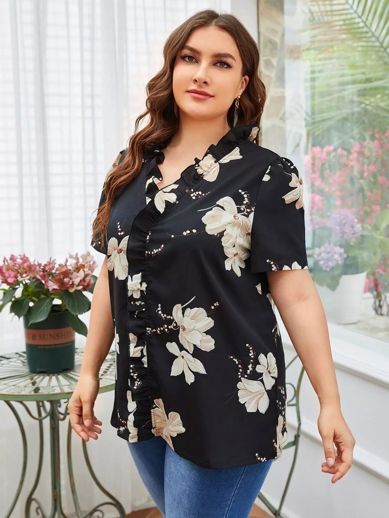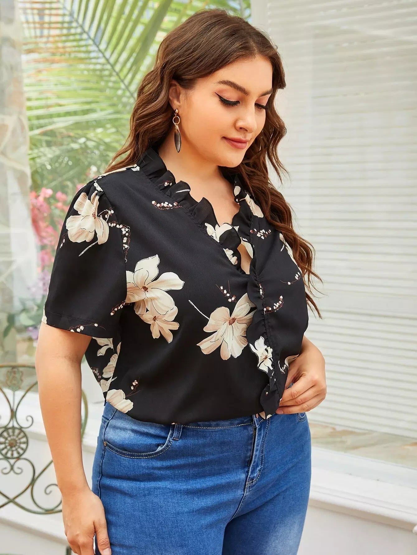 بلوزة زائد مزينة بكشكشة زهرية مزينة بكشكشة