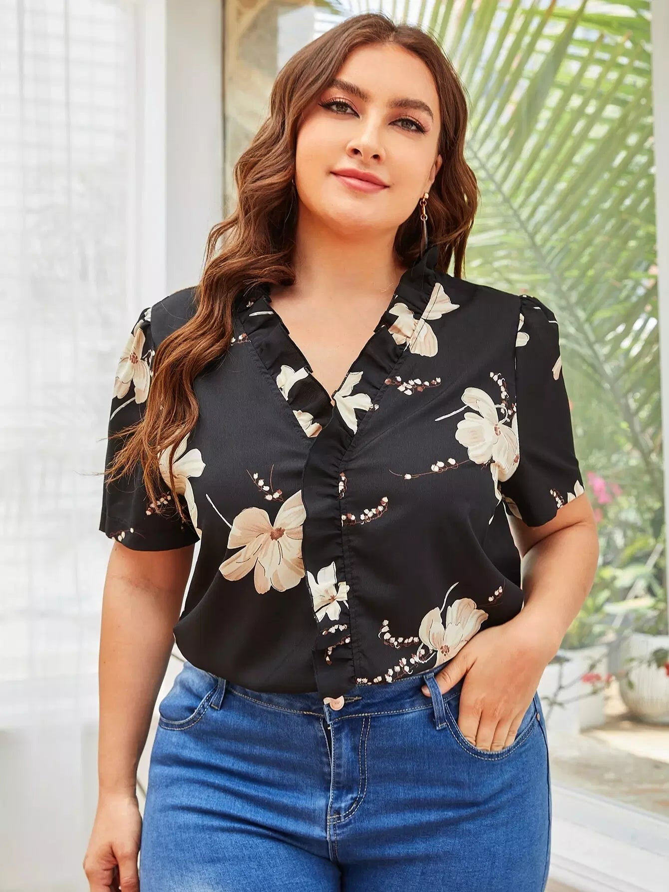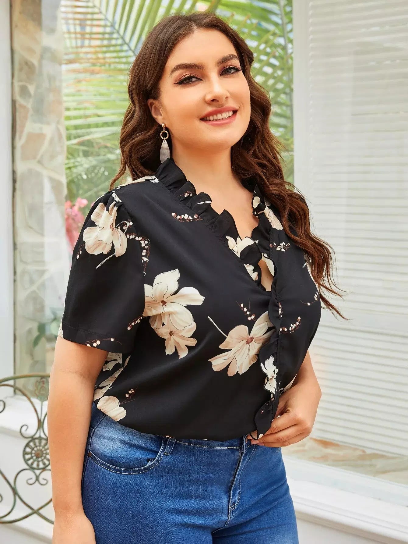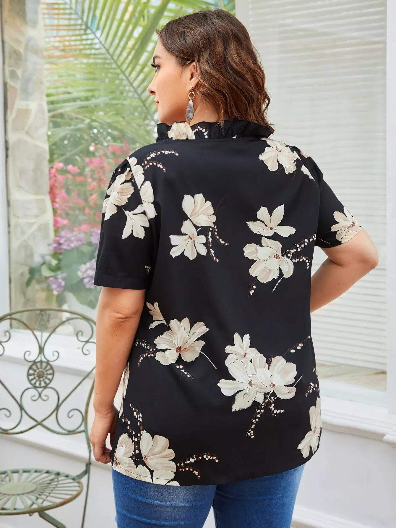 بلوزة زائد مزينة بكشكشة زهرية مزينة بكشكشة