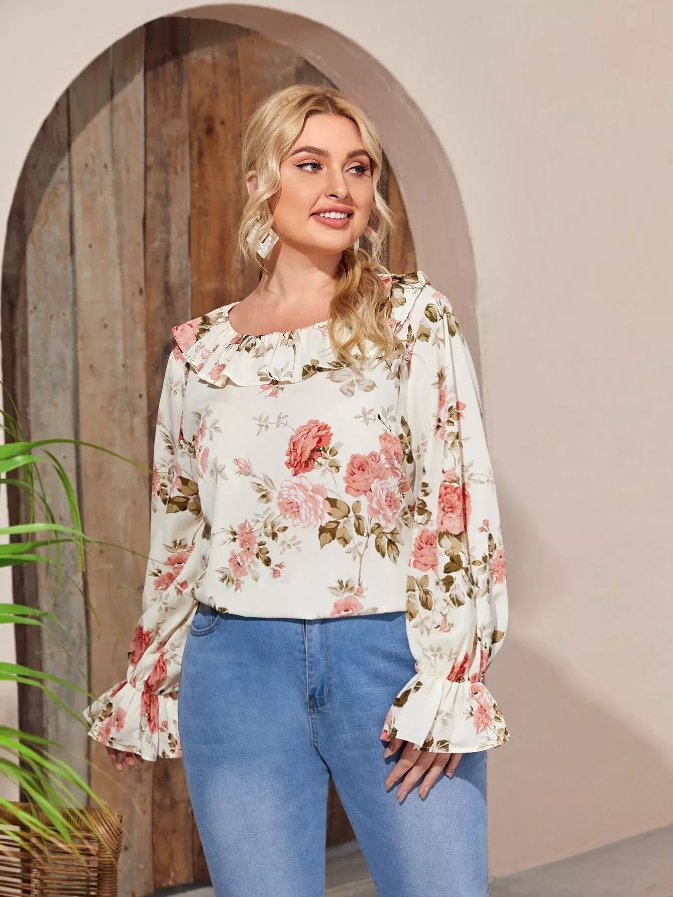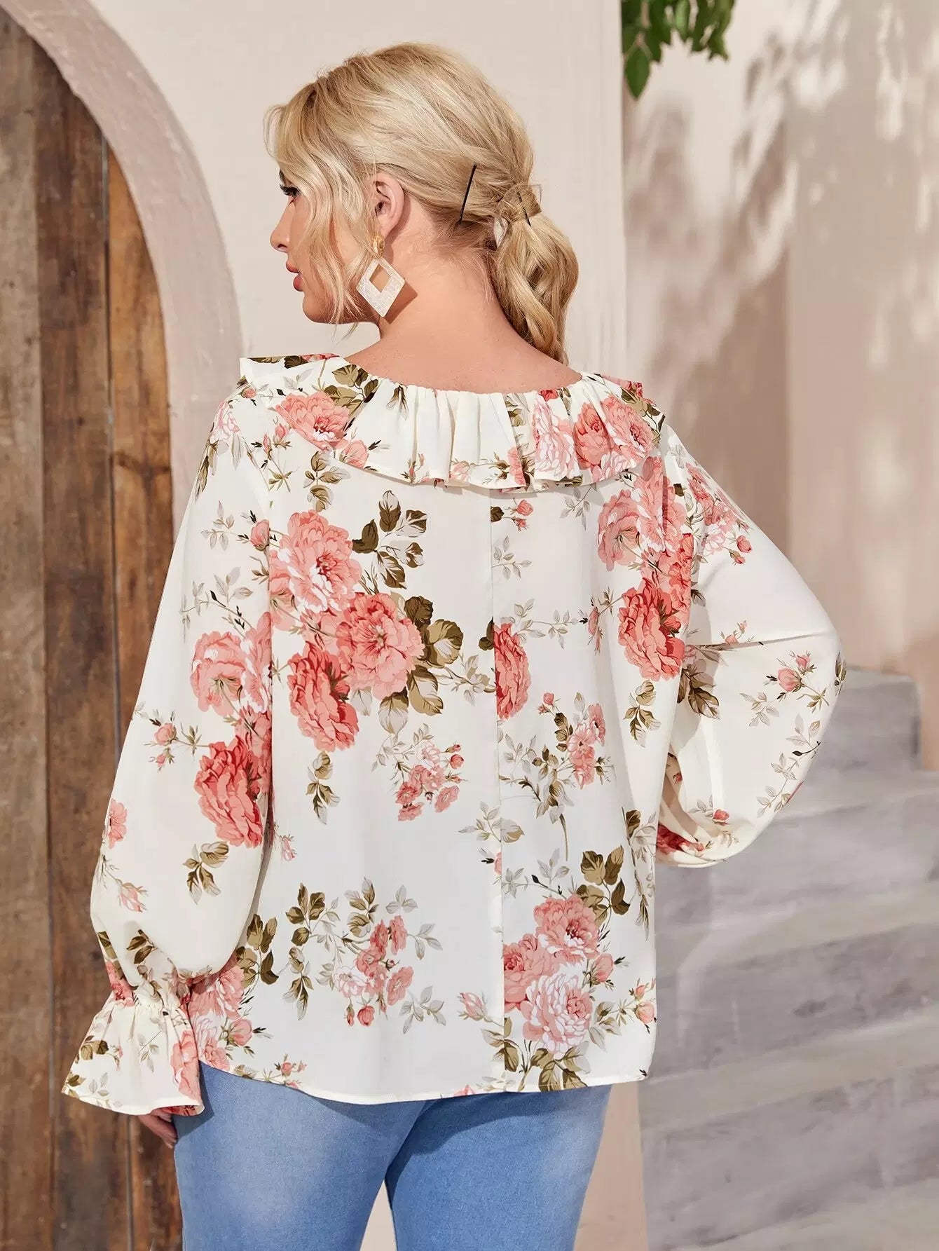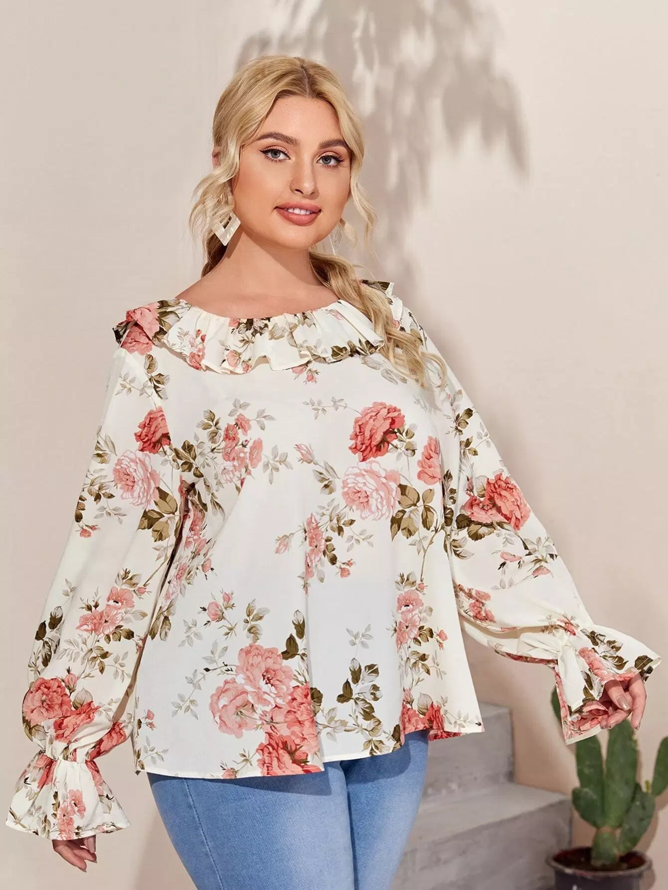 بلوزة مكشكشة بطبعة زهور مزينة بكشكش زائد