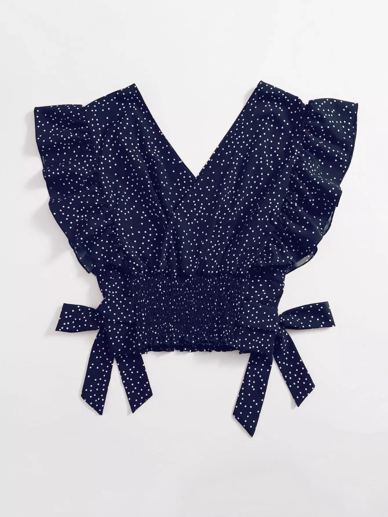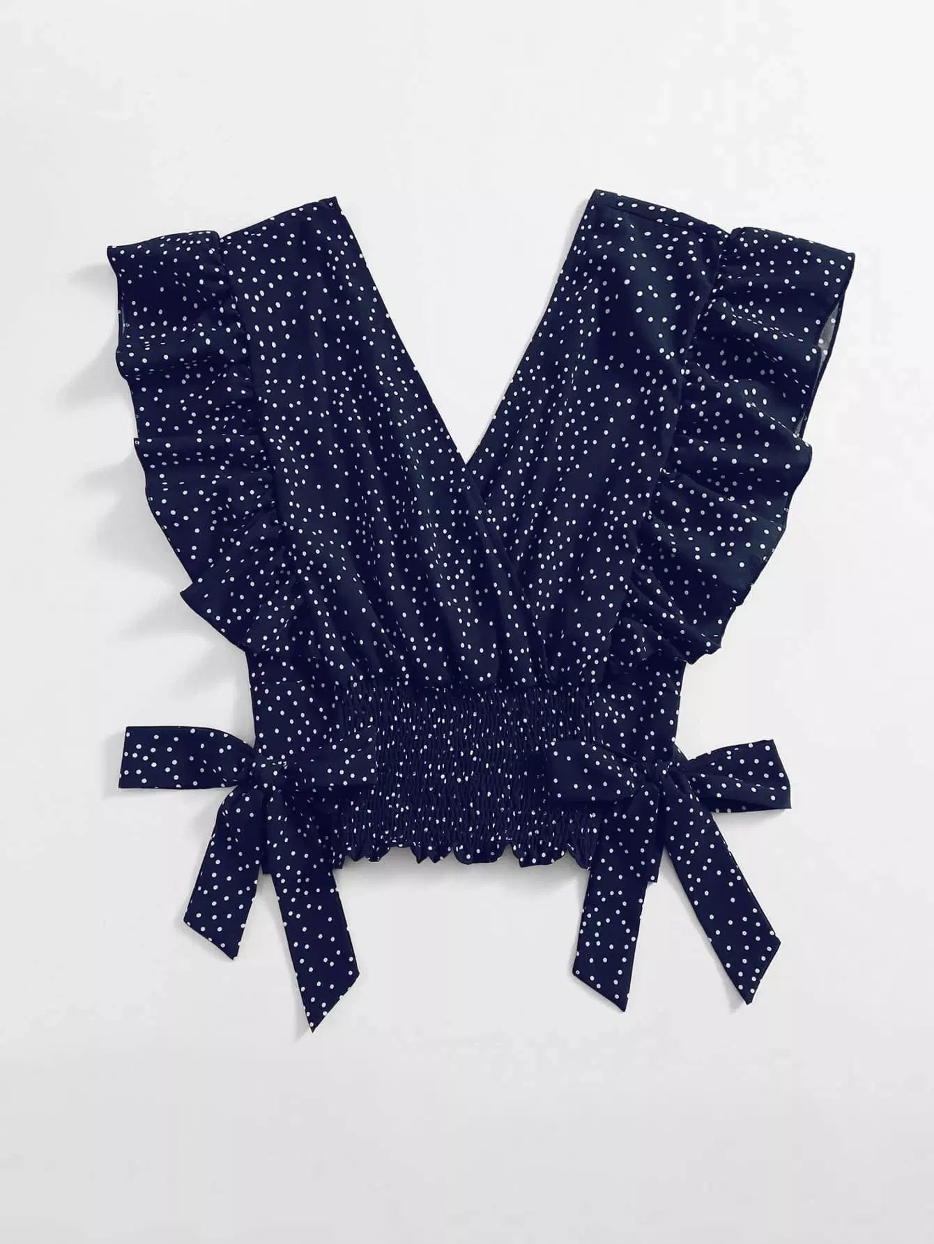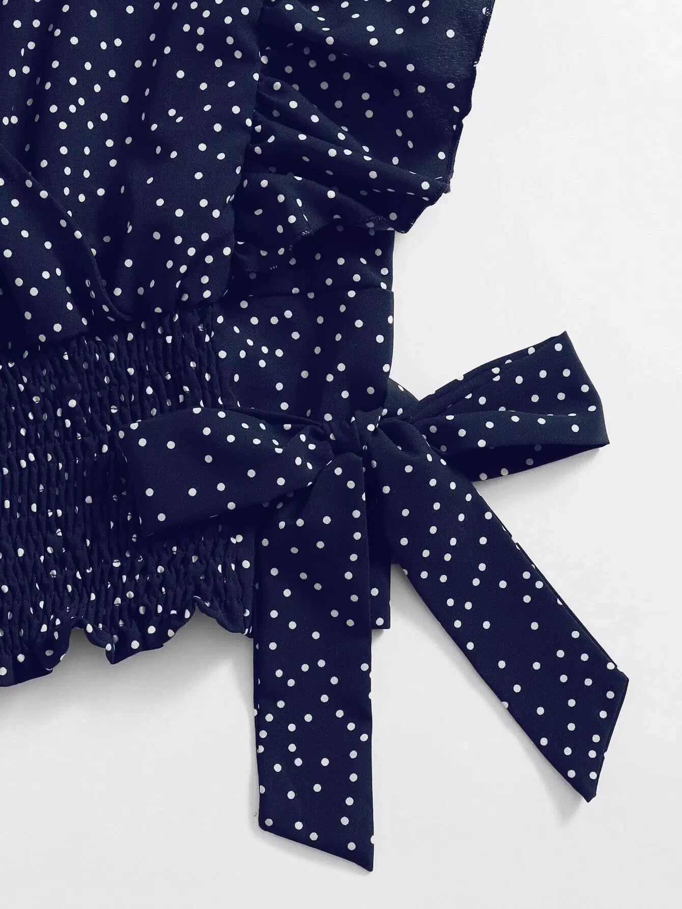 بلوزة منقّطة بحواف مكشكشة ذات عقدة جانبية منقطة