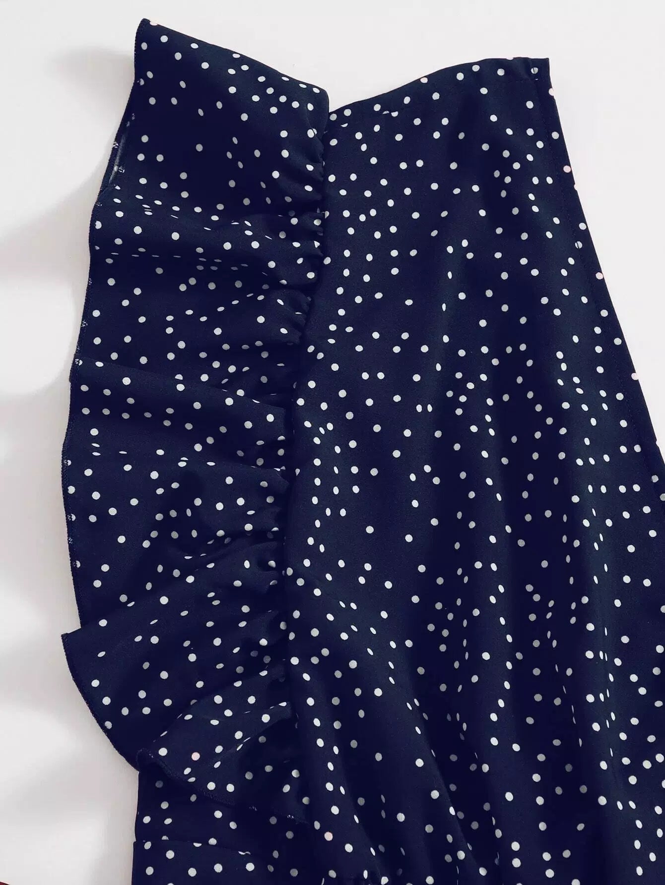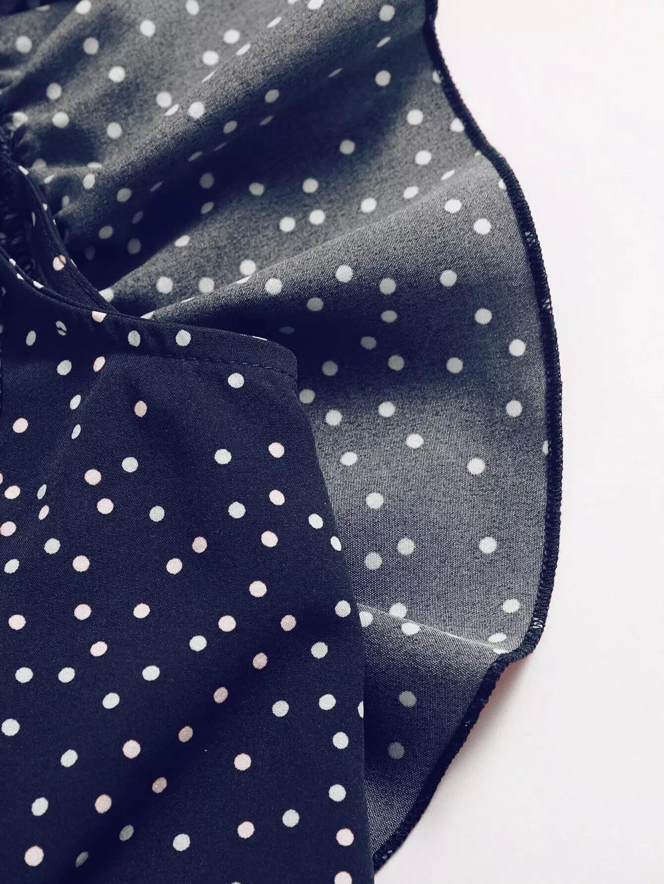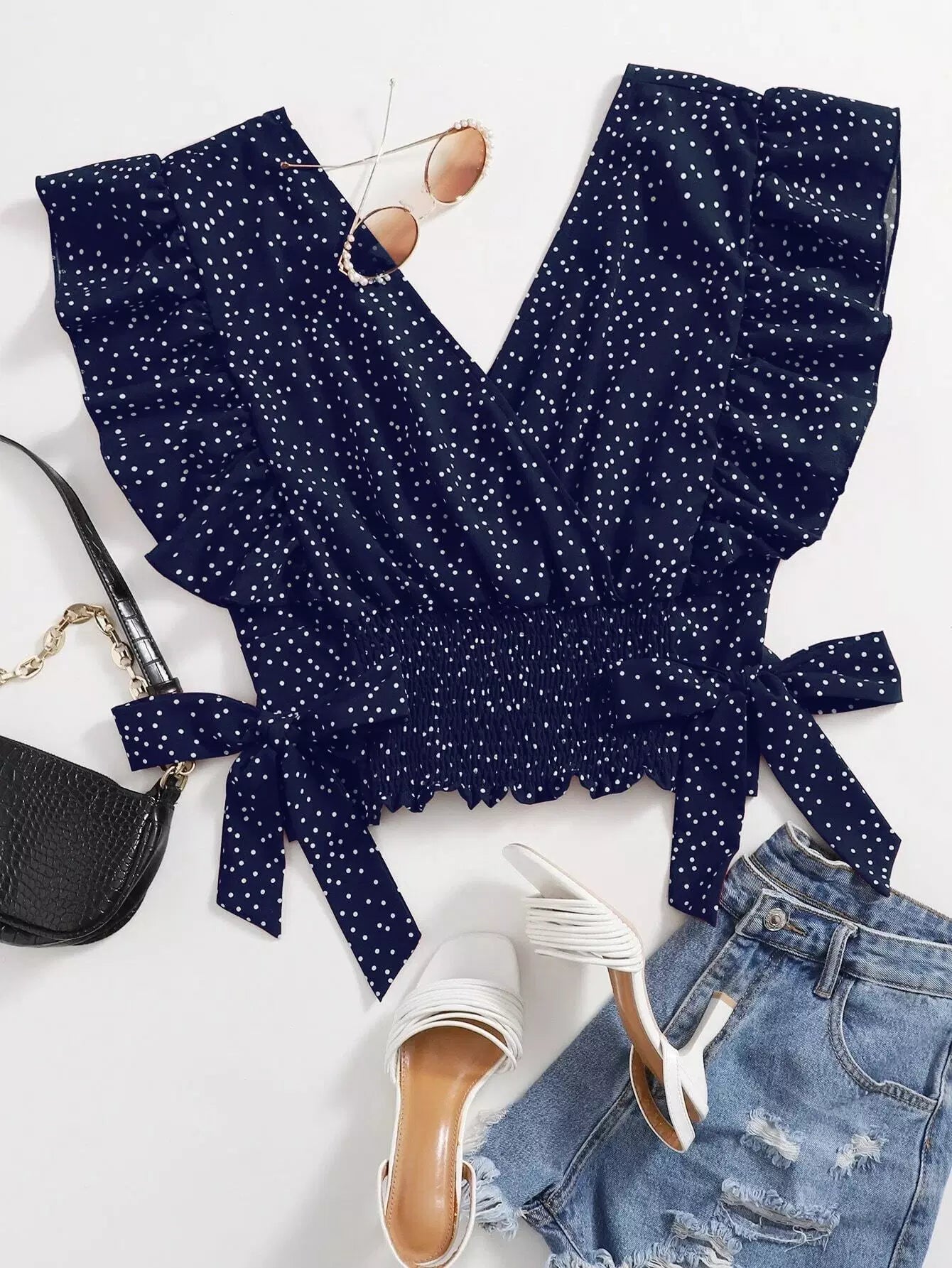 بلوزة منقّطة بحواف مكشكشة ذات عقدة جانبية منقطة