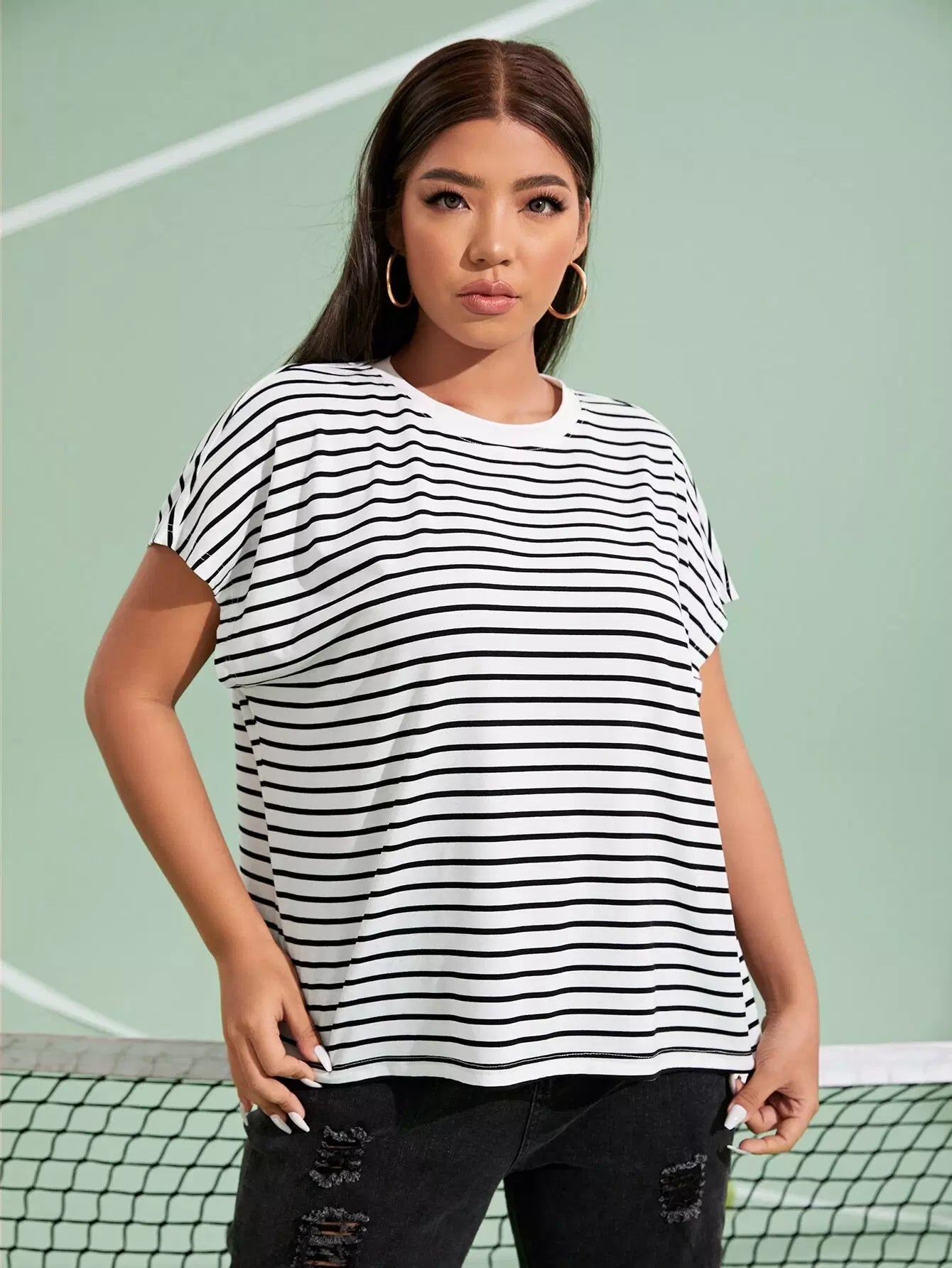 تي شيرت بأكمام دولمان مخططة بلاس