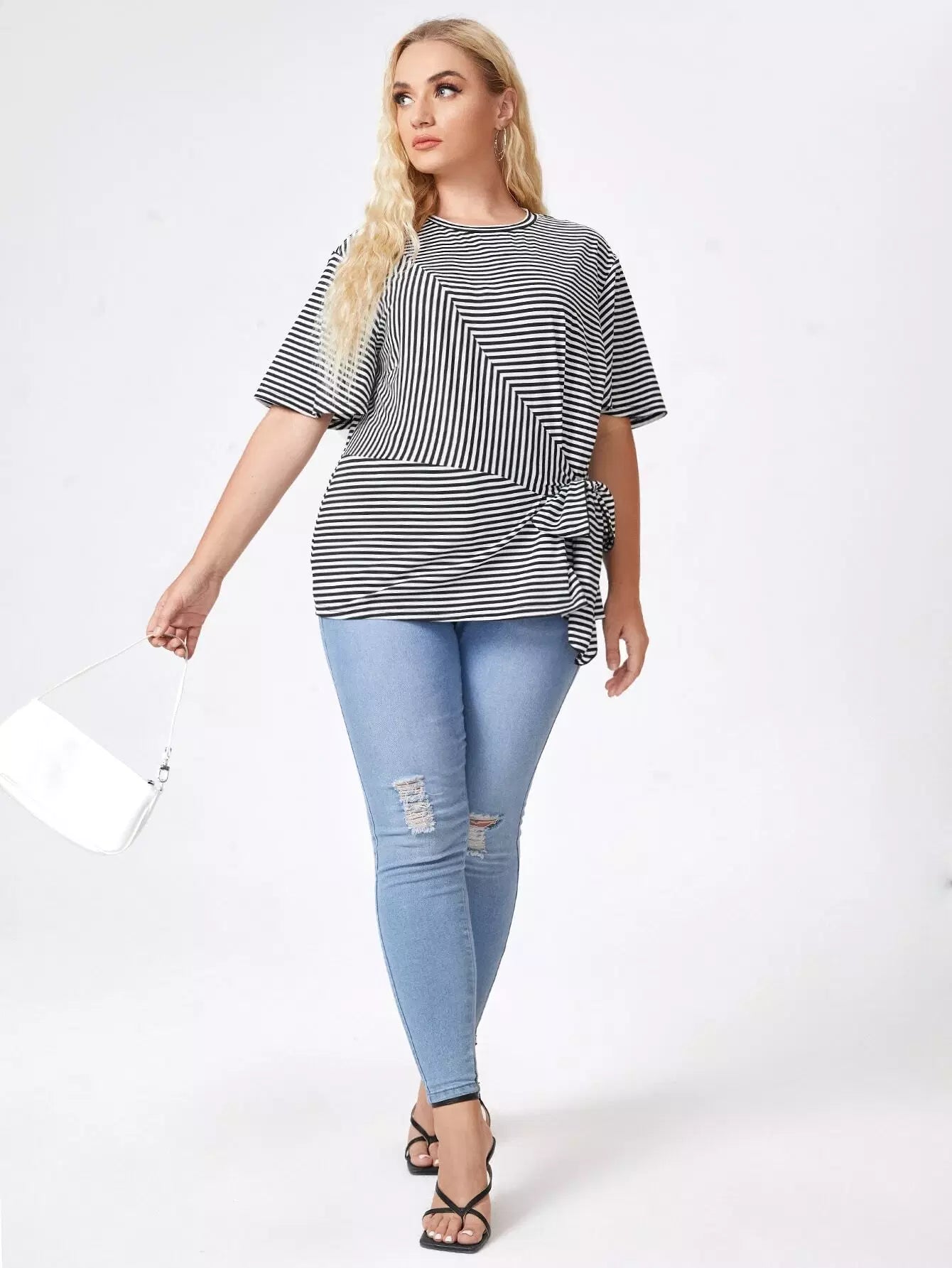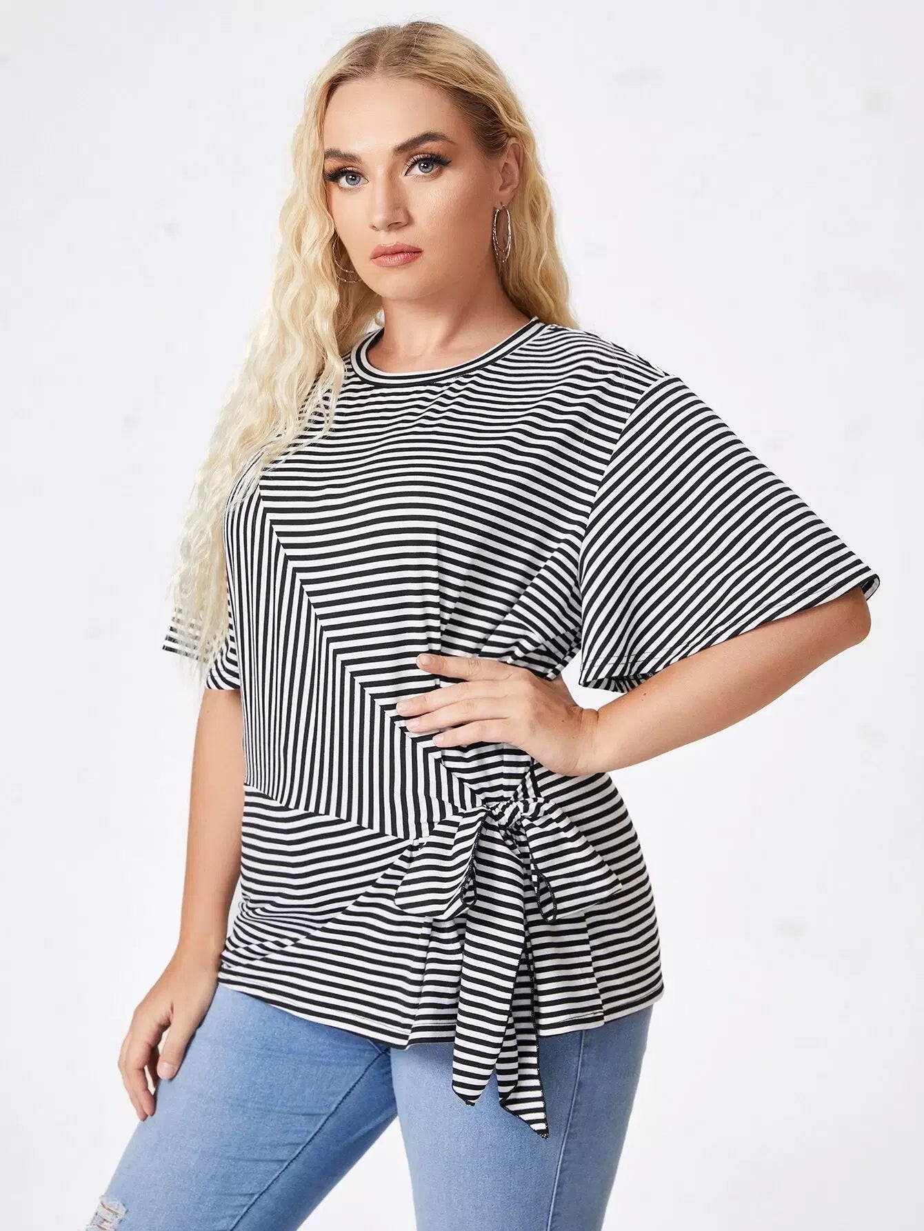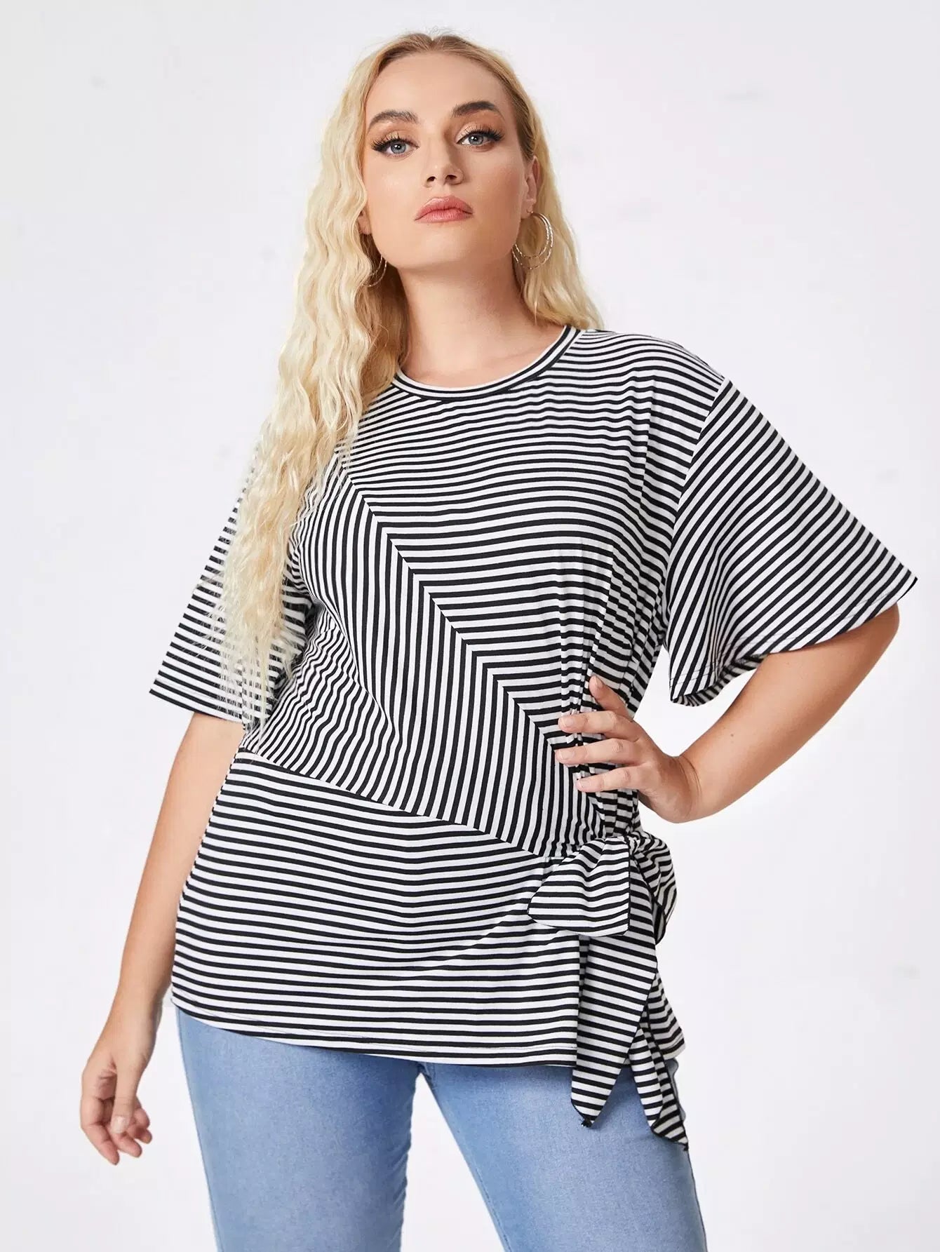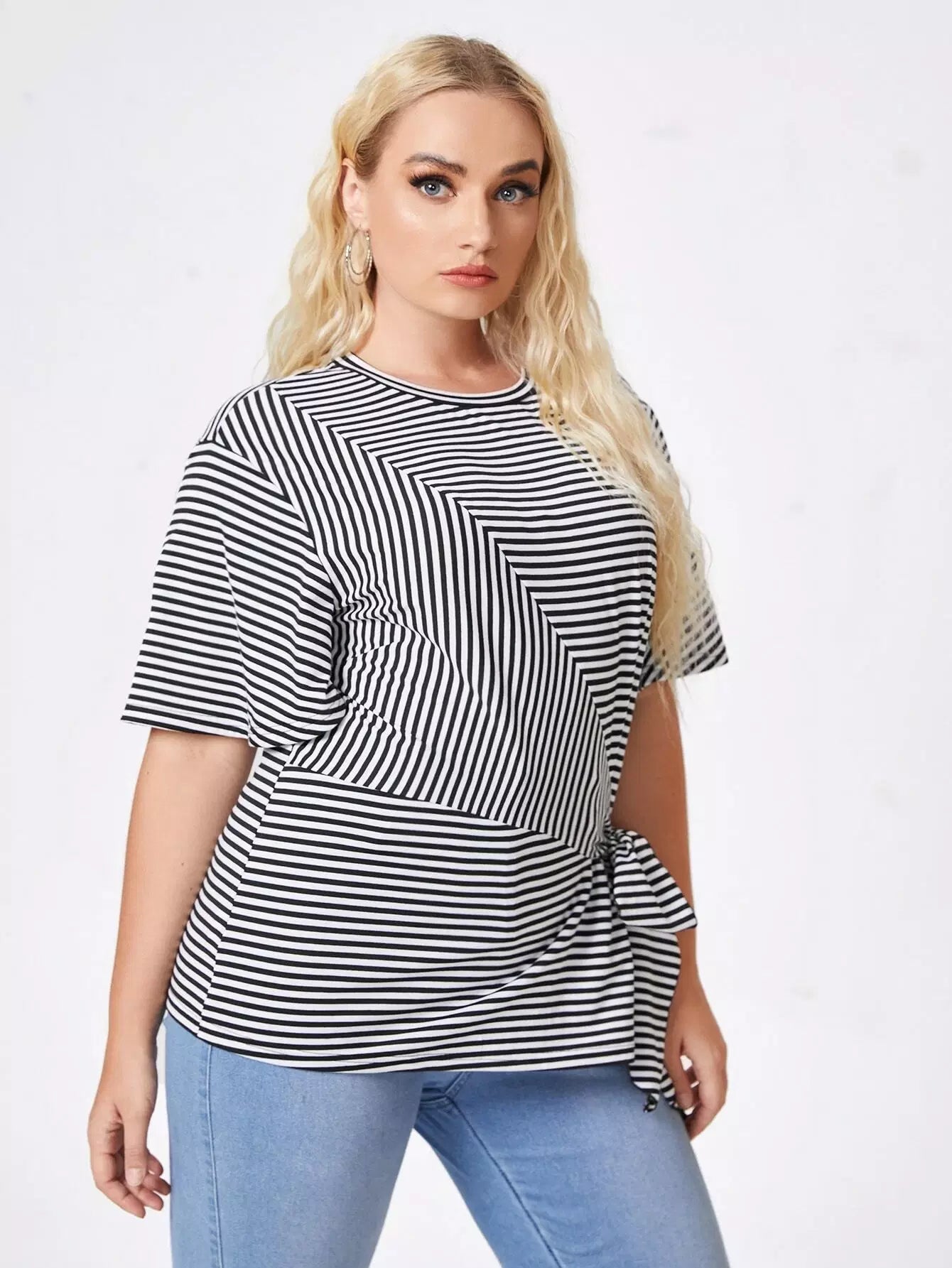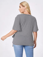 نحيف - مقاس كبير تي شيرت بطباعة مخططة وربطة أمامية