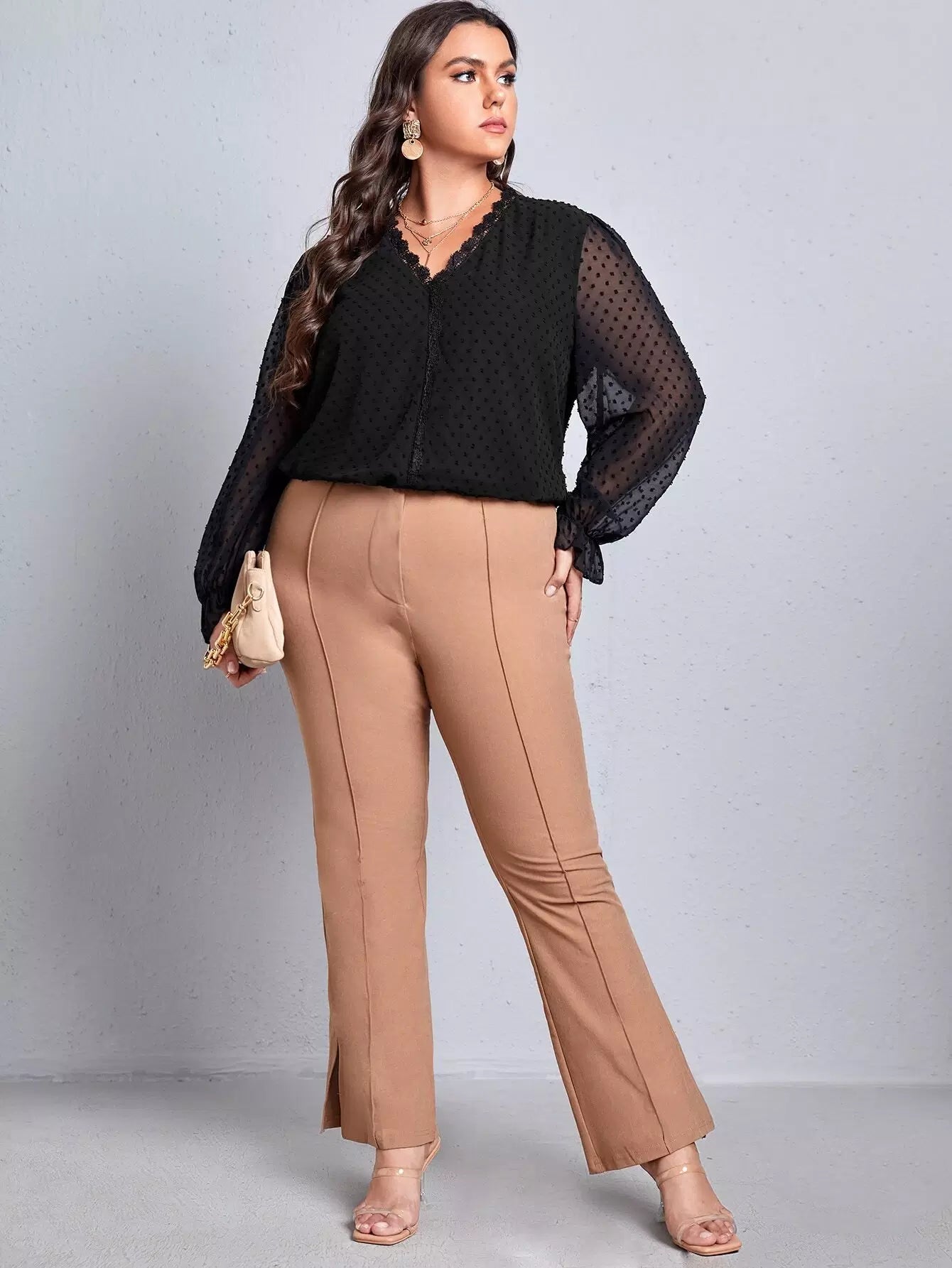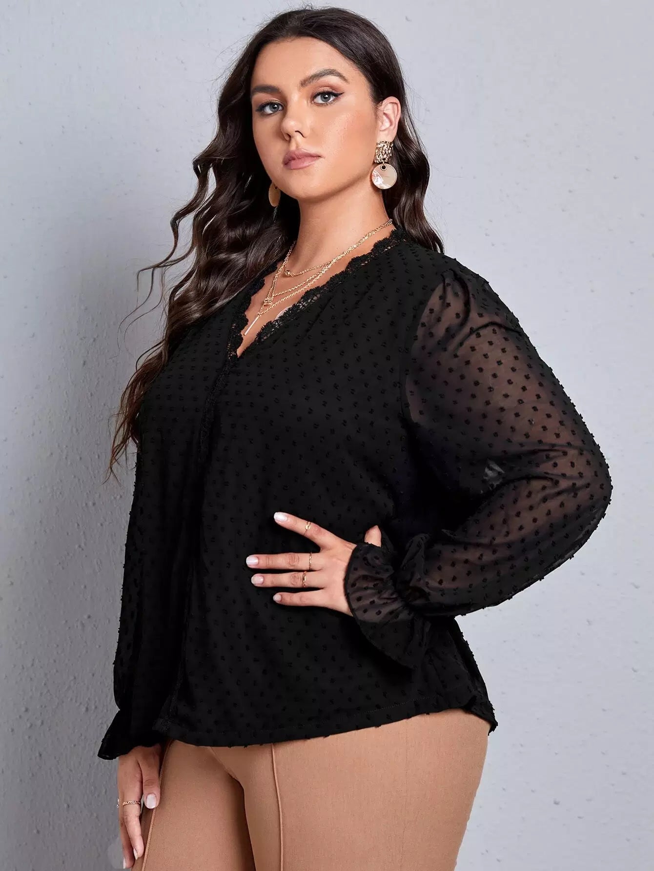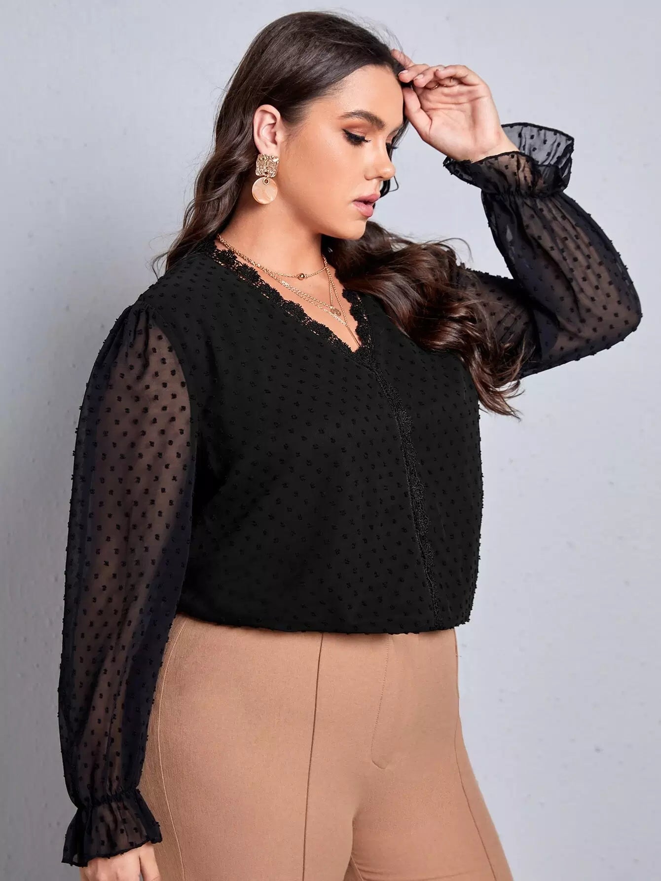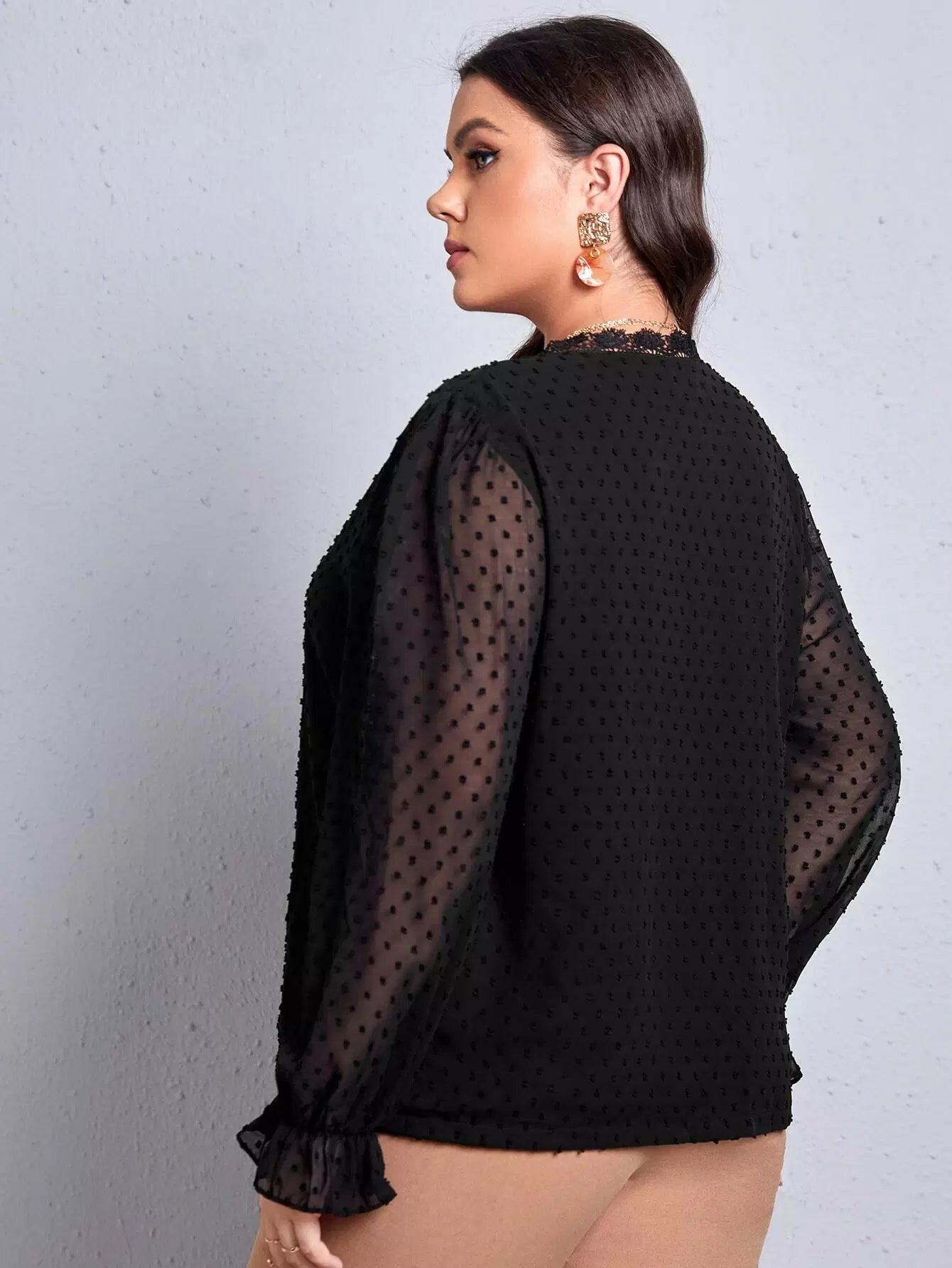 بلوزة بأكمام من الدانتيل المخرّم المنقّط المخرّم بأكمام منفوشة
