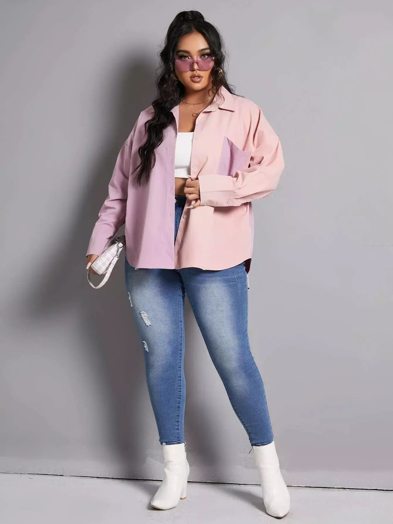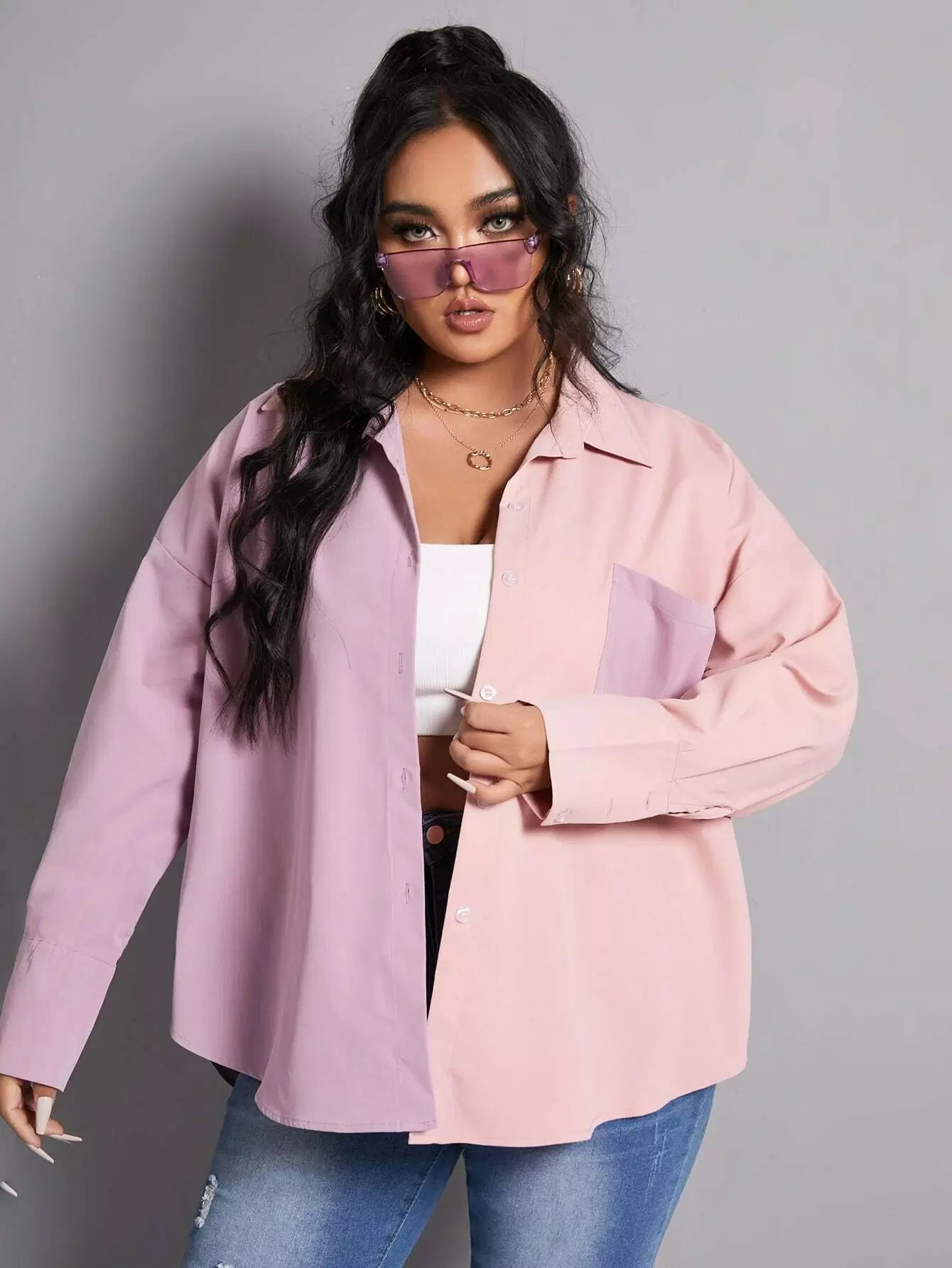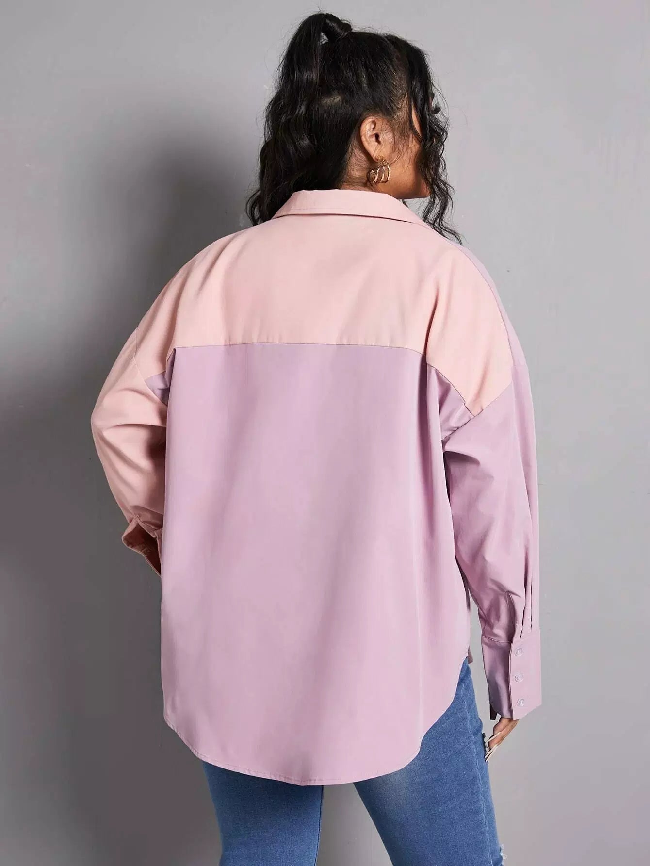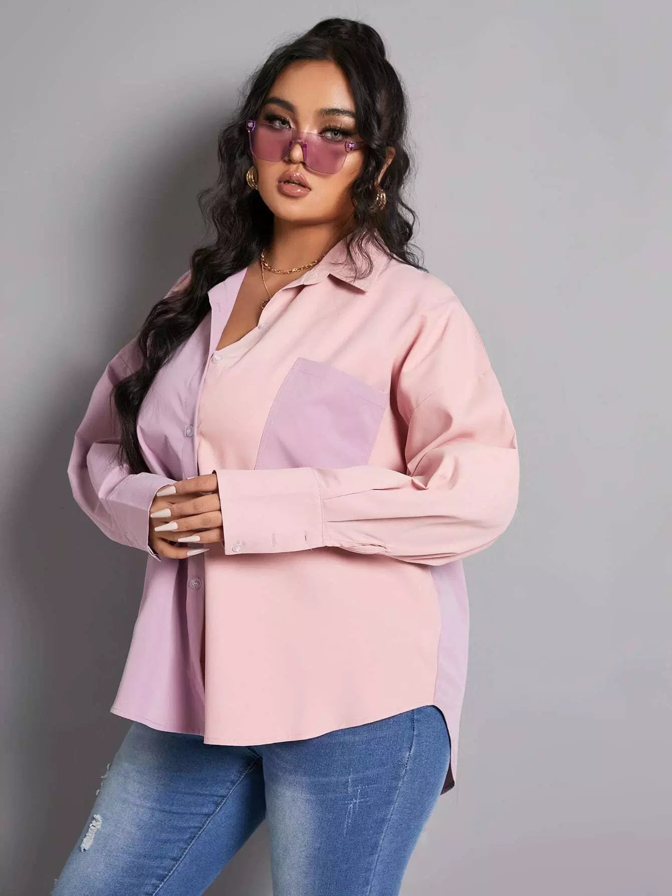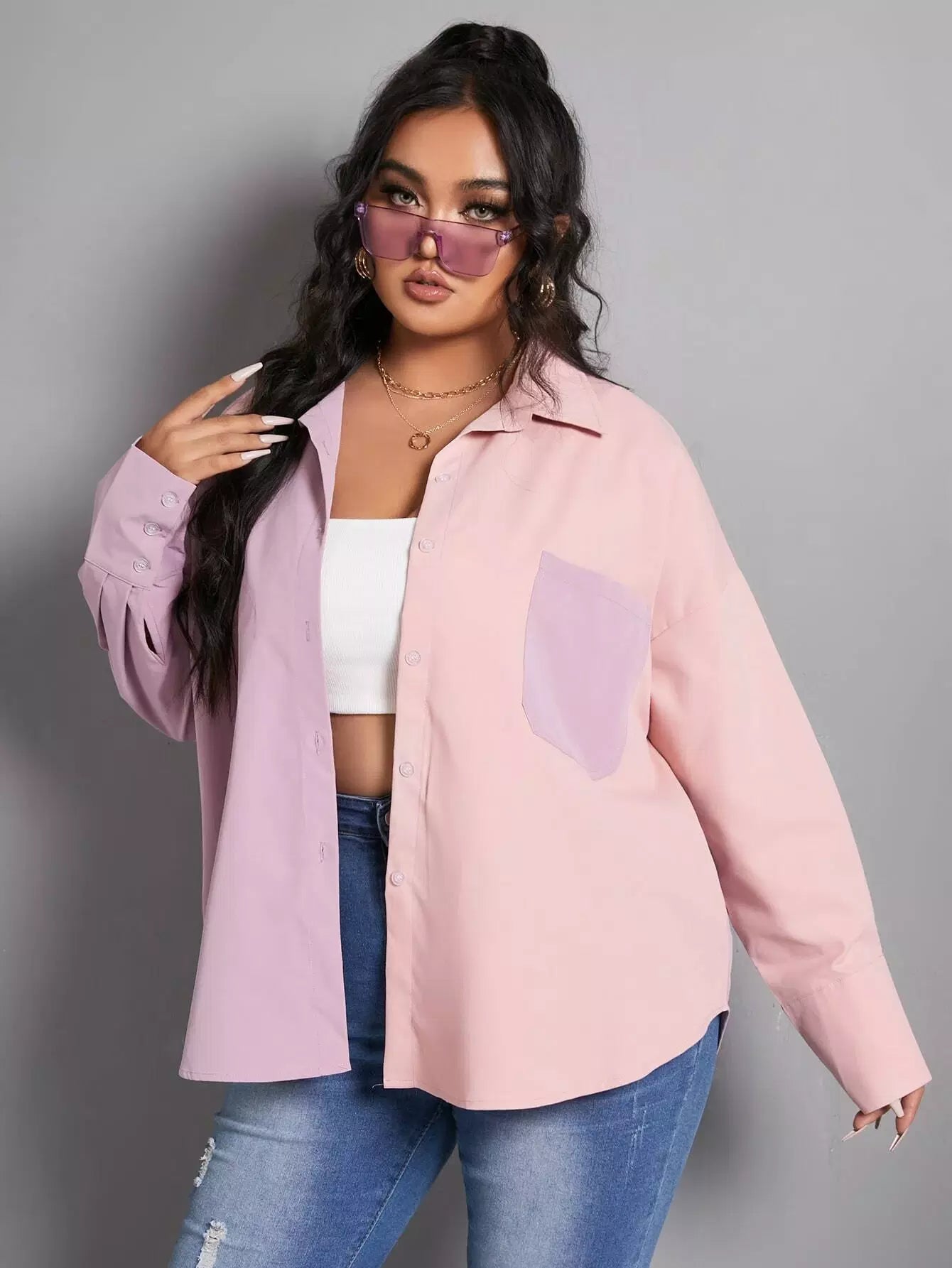 قميص بكتف منسدل منسدل بجيبين مرقع بلونين زائد
