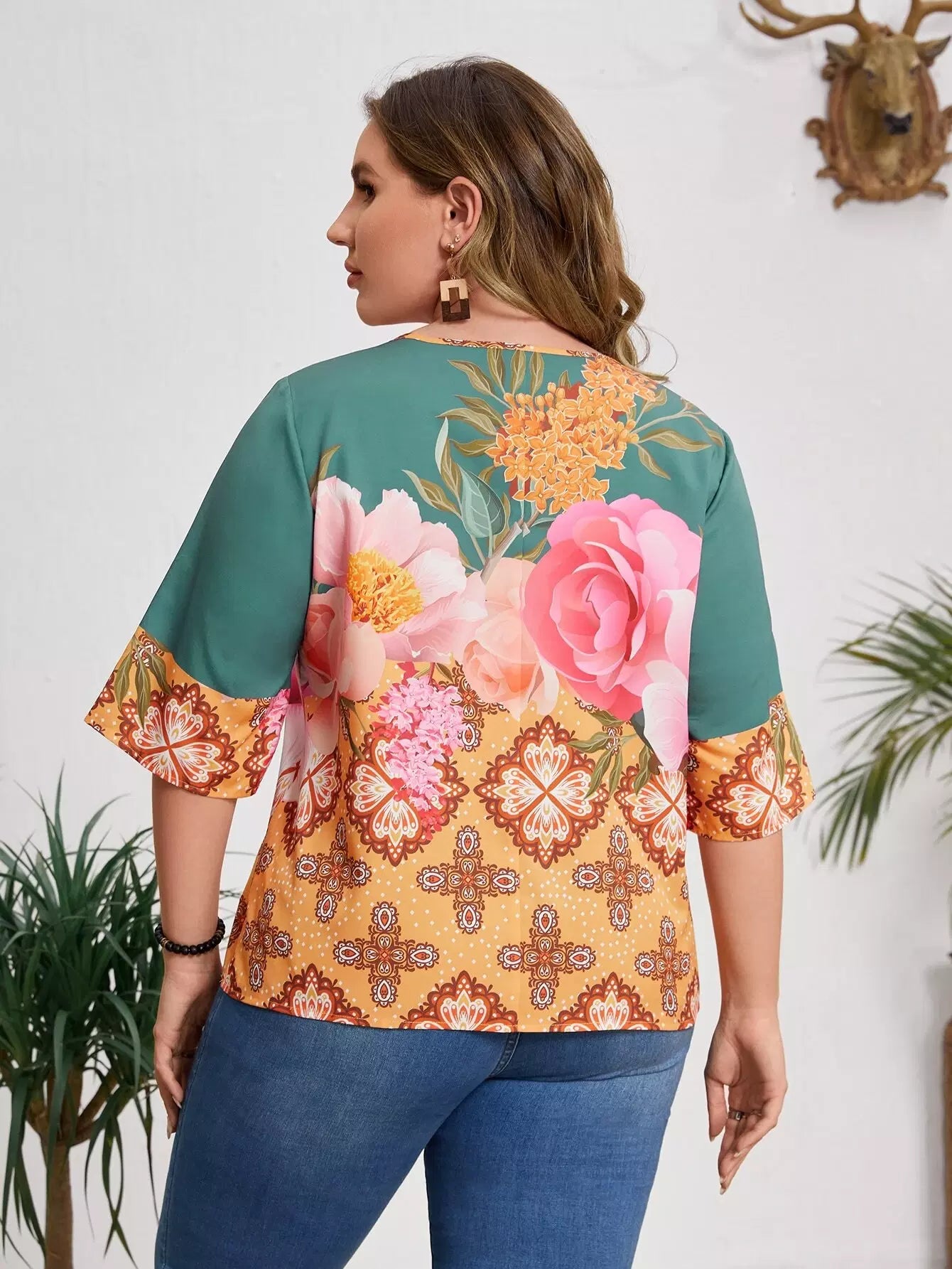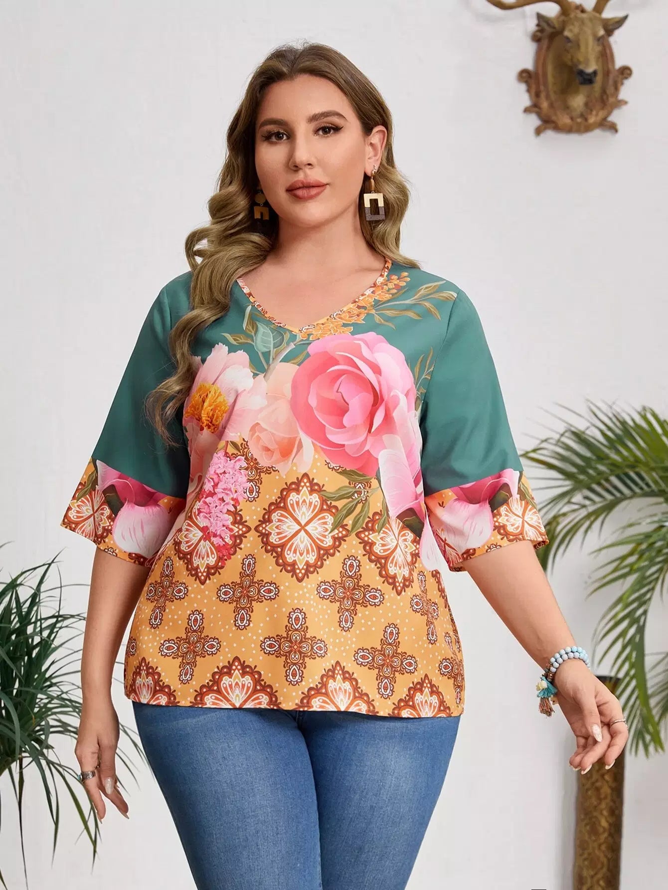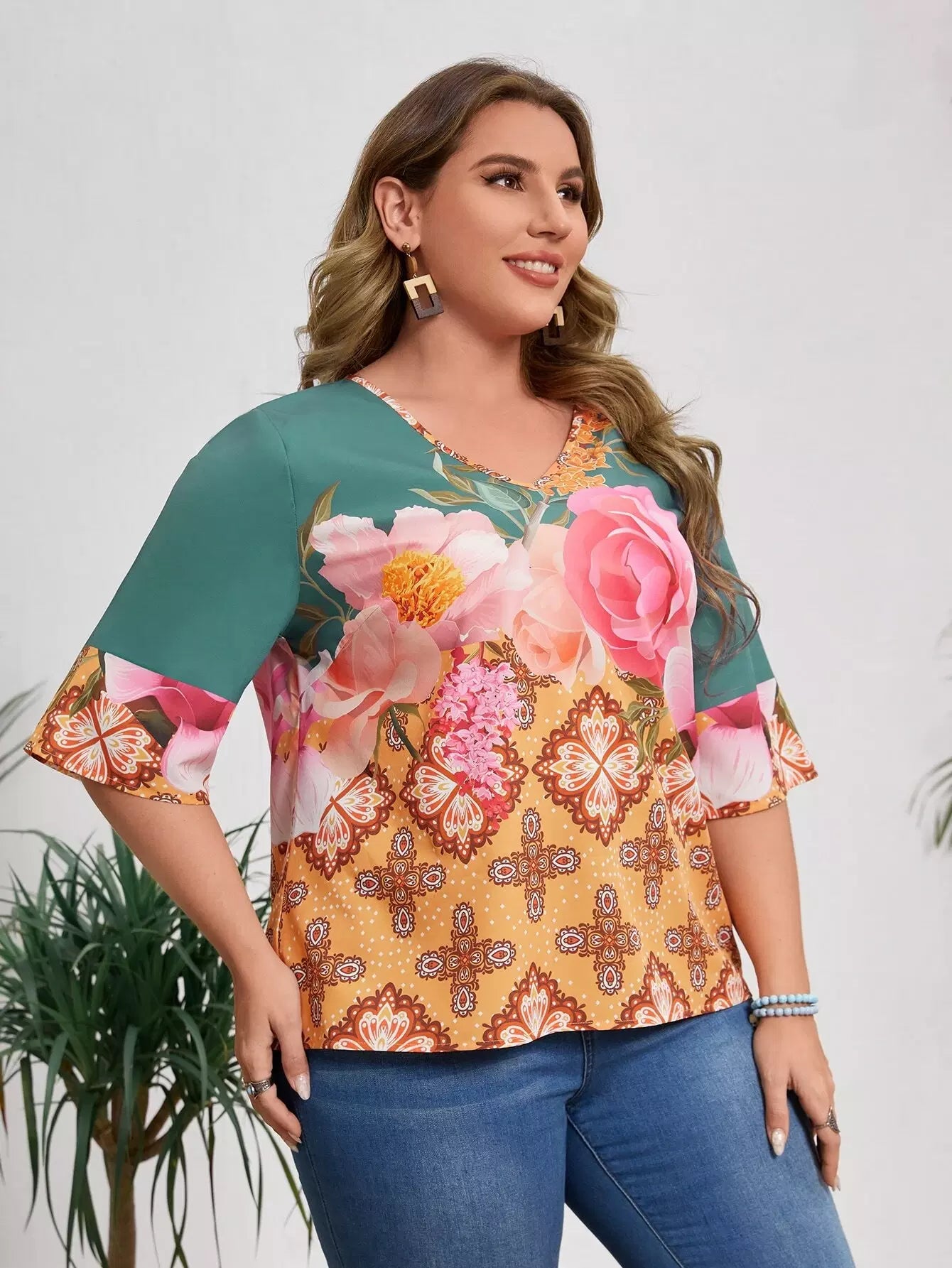 بلوزة بياقة على شكل V برقبة على شكل زهور