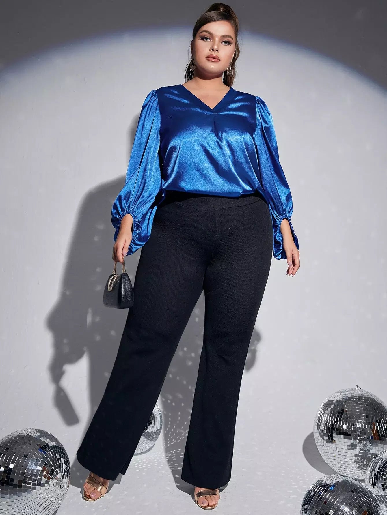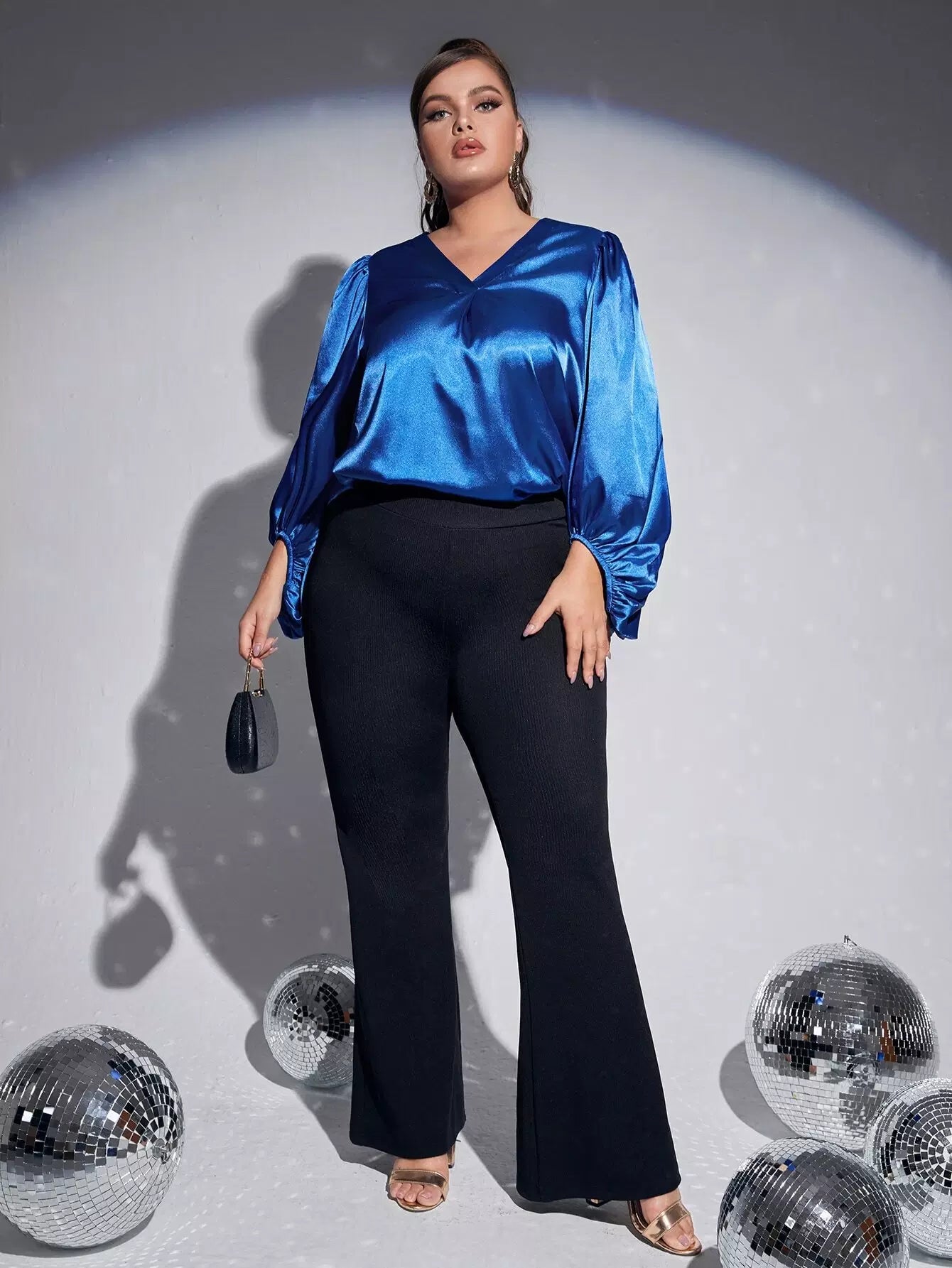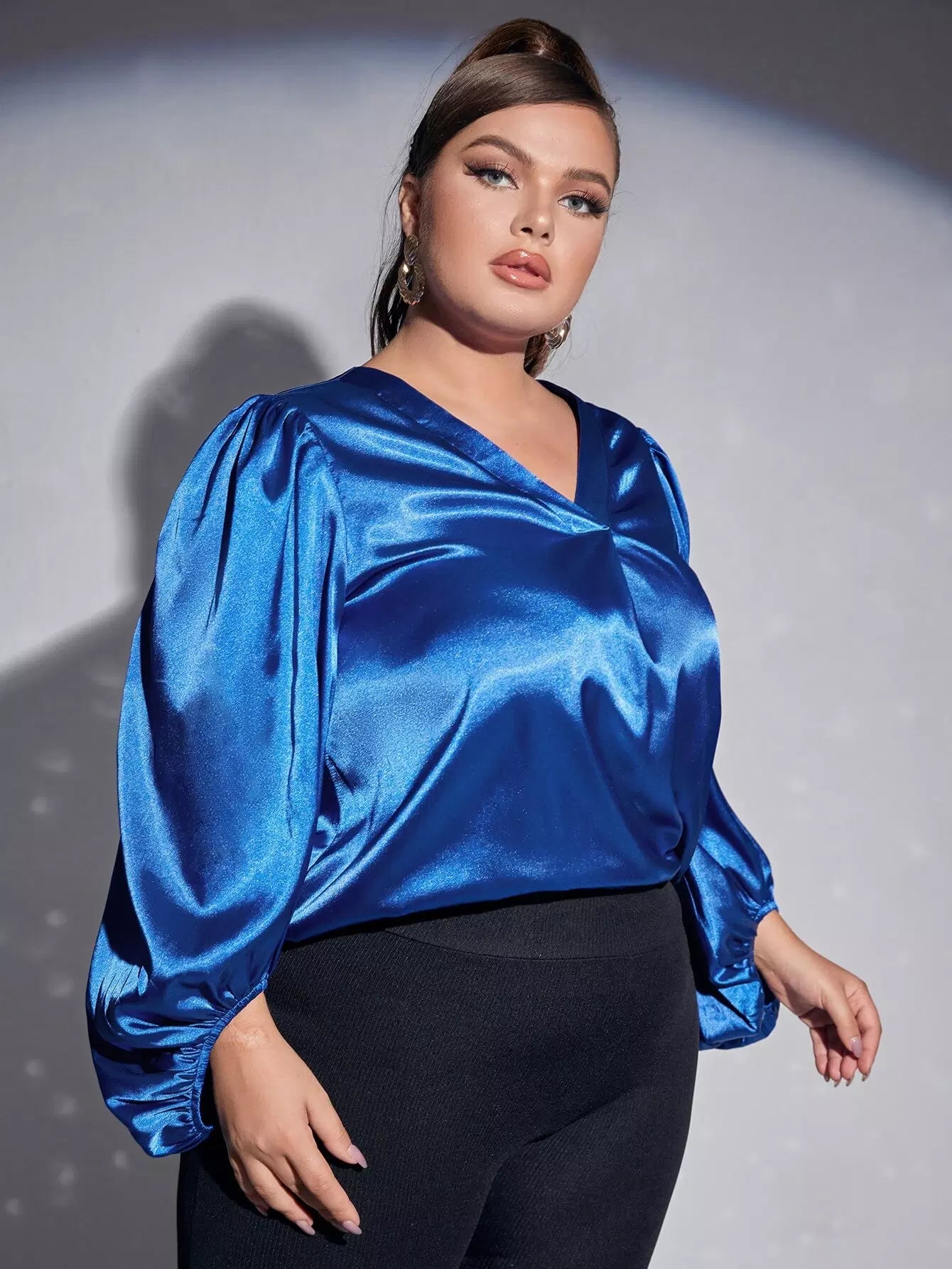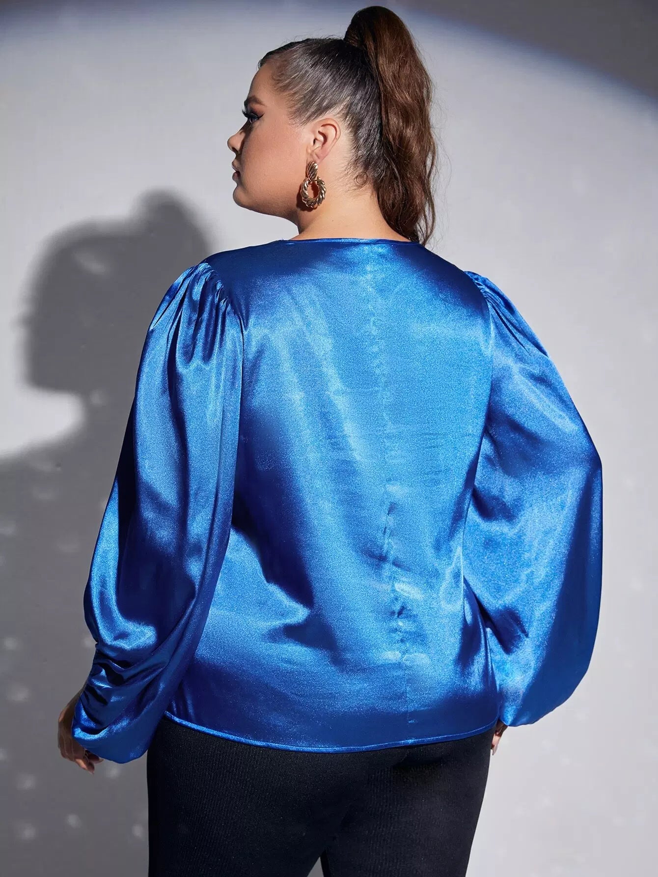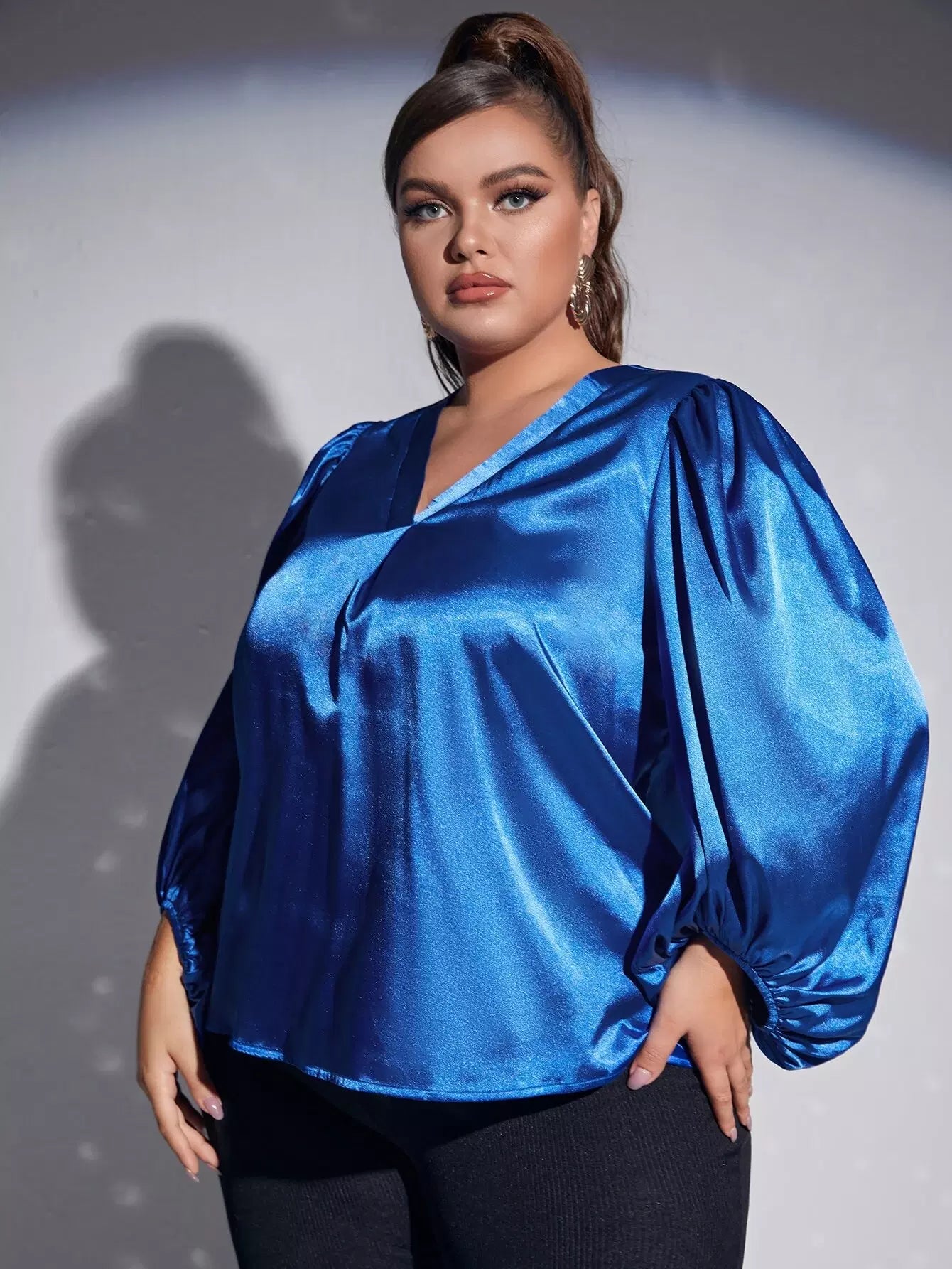 بلوزة سادة بأكمام على شكل حرف V بياقة على شكل حرف V