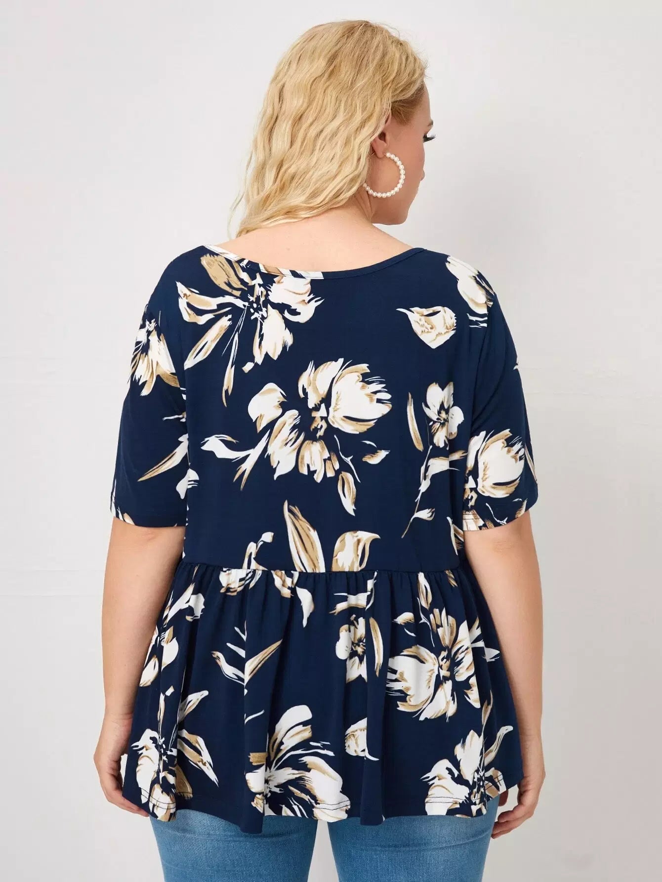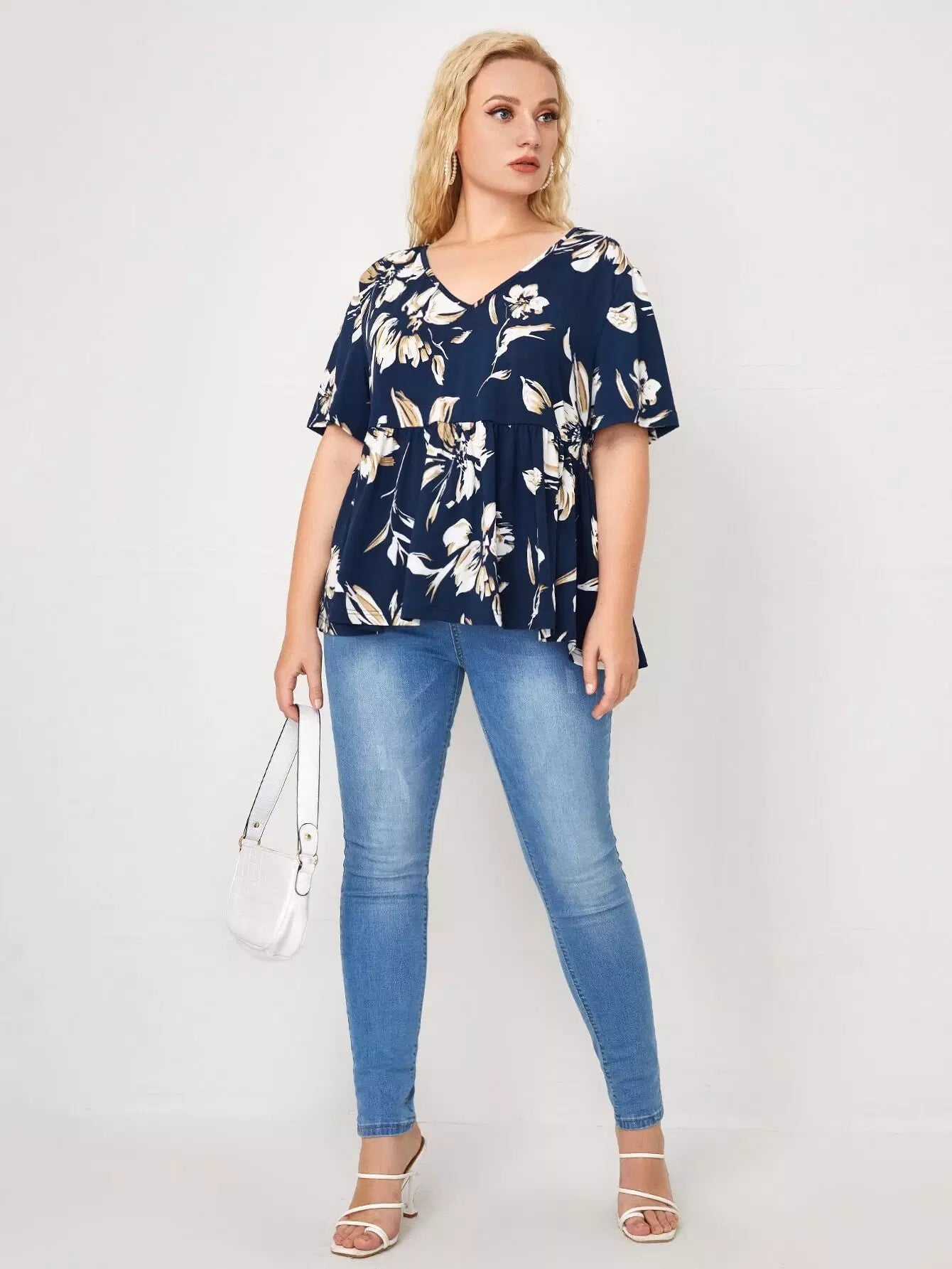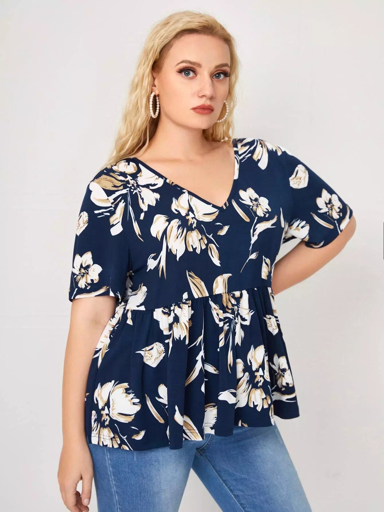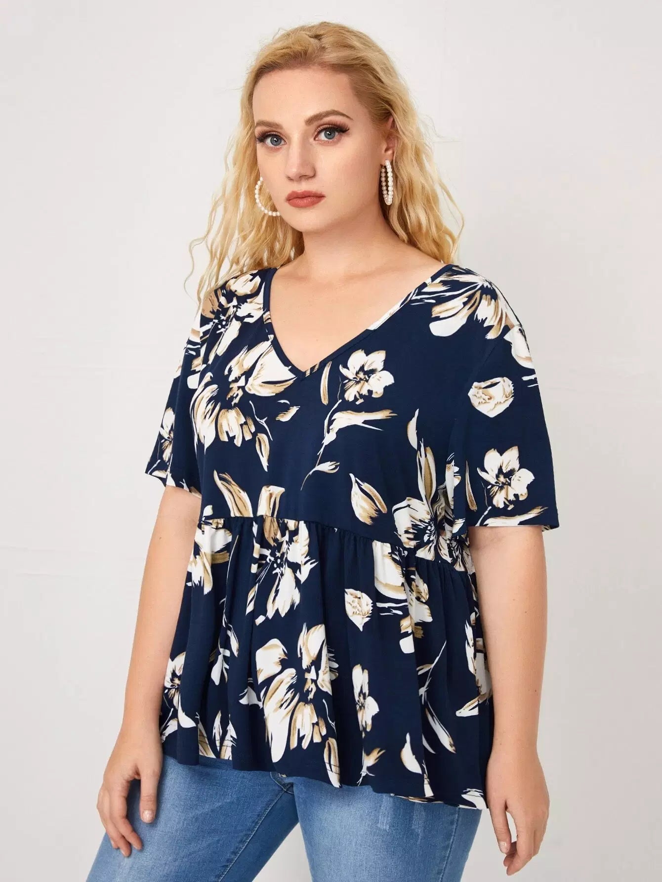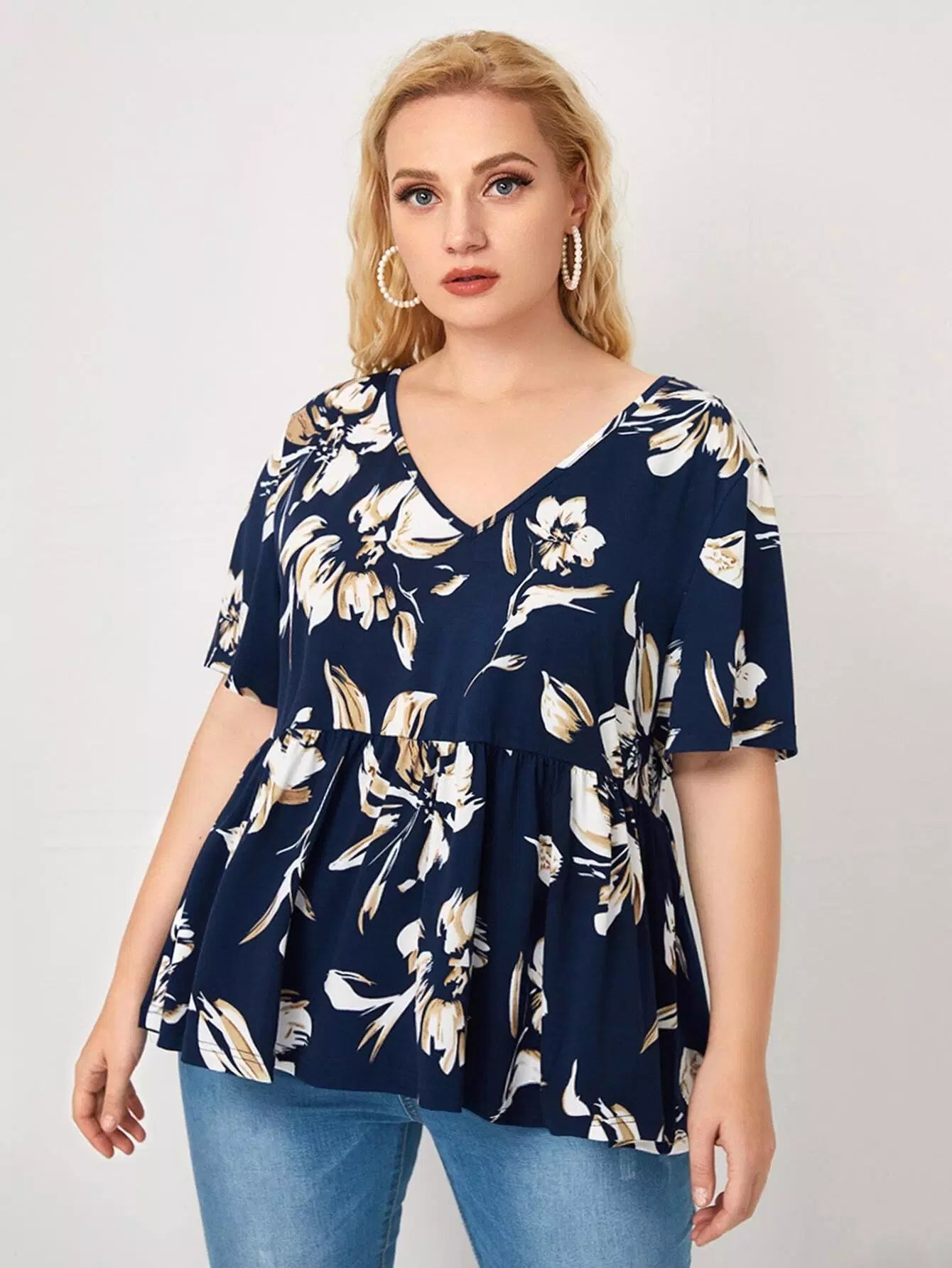 نحيف - مقاس كبير الخامس الرقبة كشكش تنحنح الأزهار طباعة المحملة