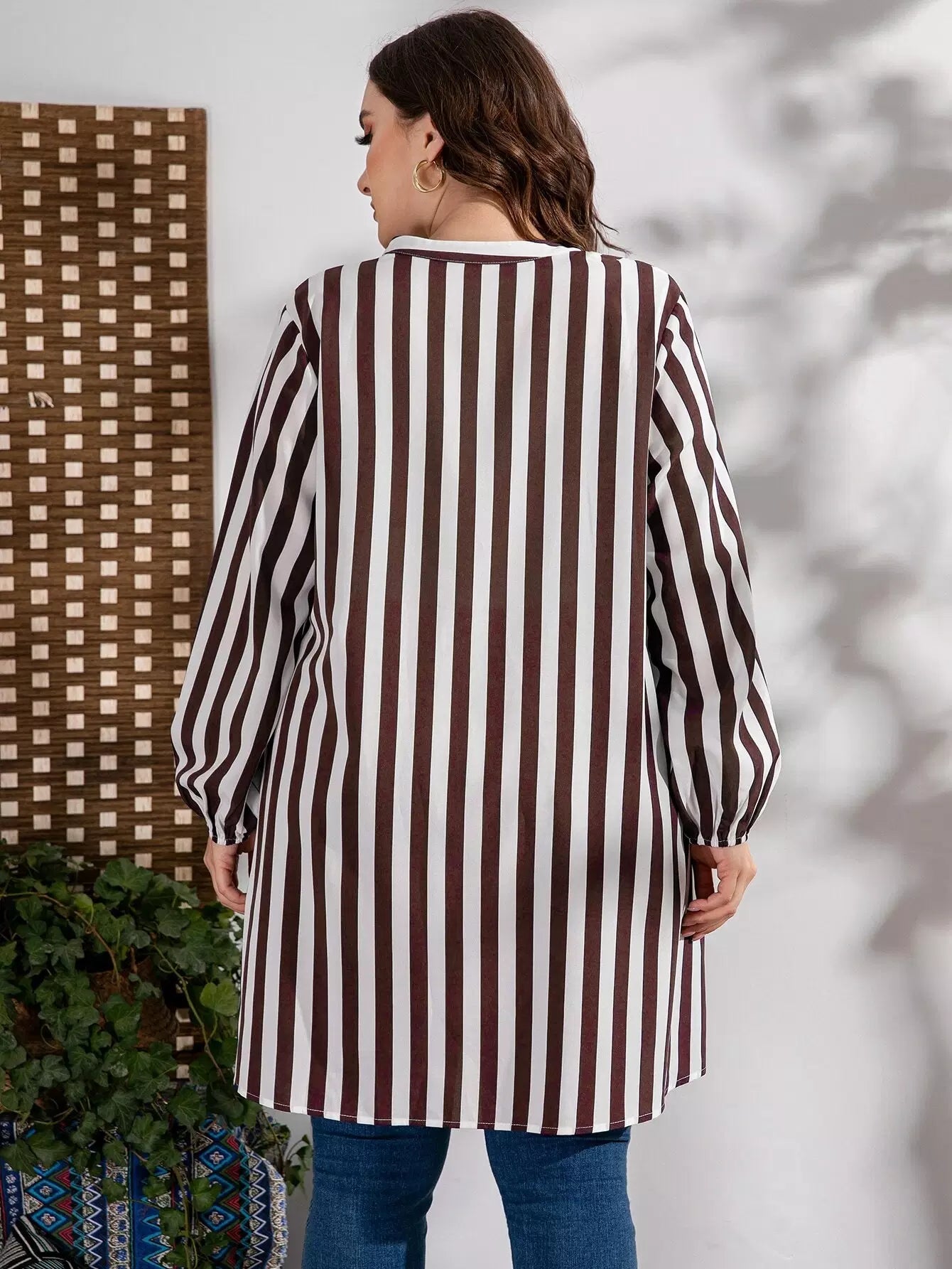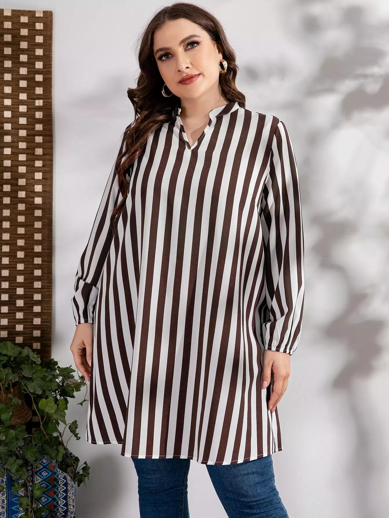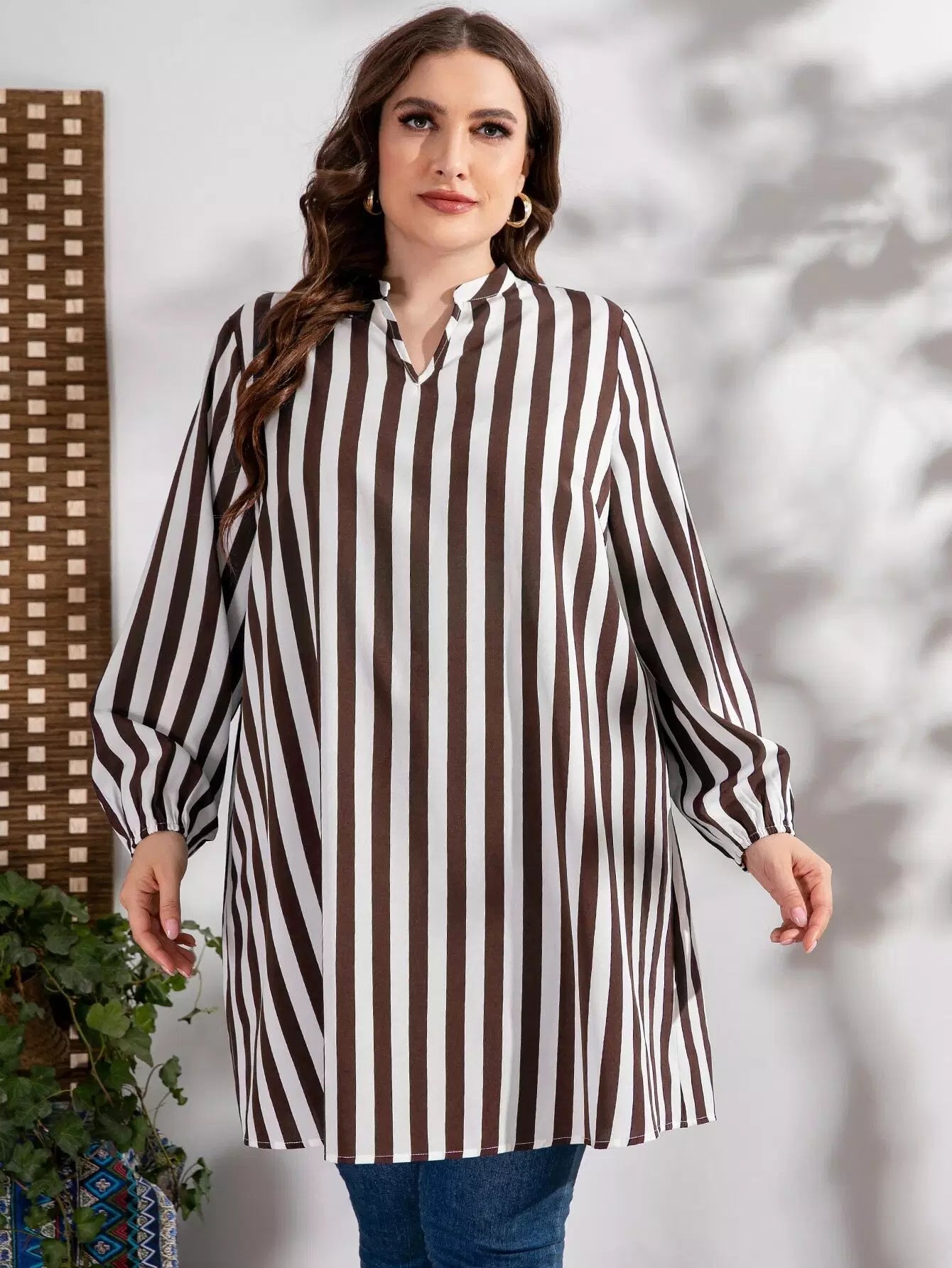 بلوزة بأكمام فانوسية بأكمام مخططة عمودياً برقبة مخططة عمودياً