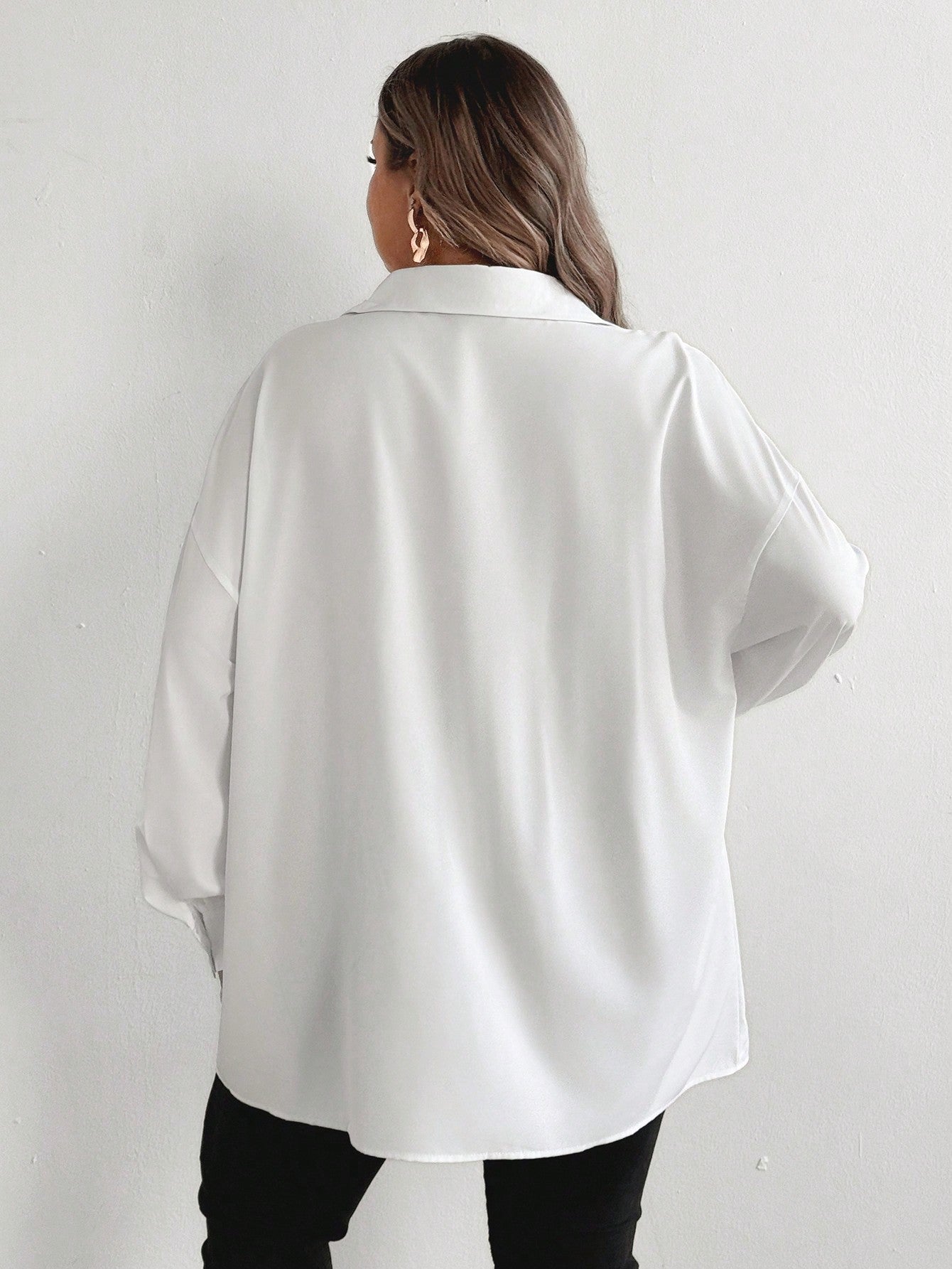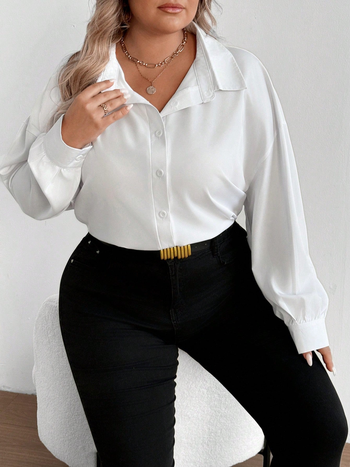 CURVE+ Plus Size Plain Front Button Down Long Sleeve Casual Shirt
