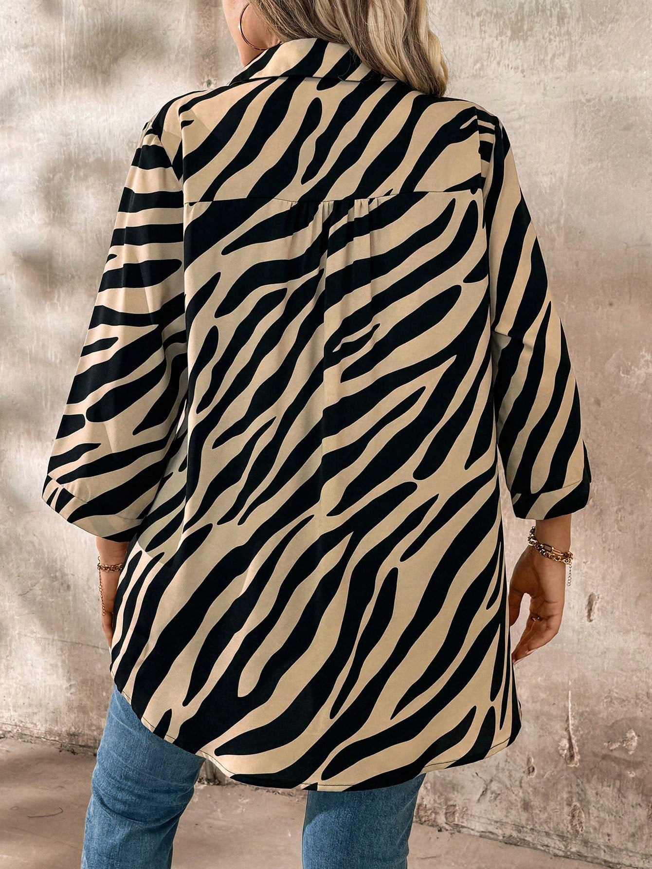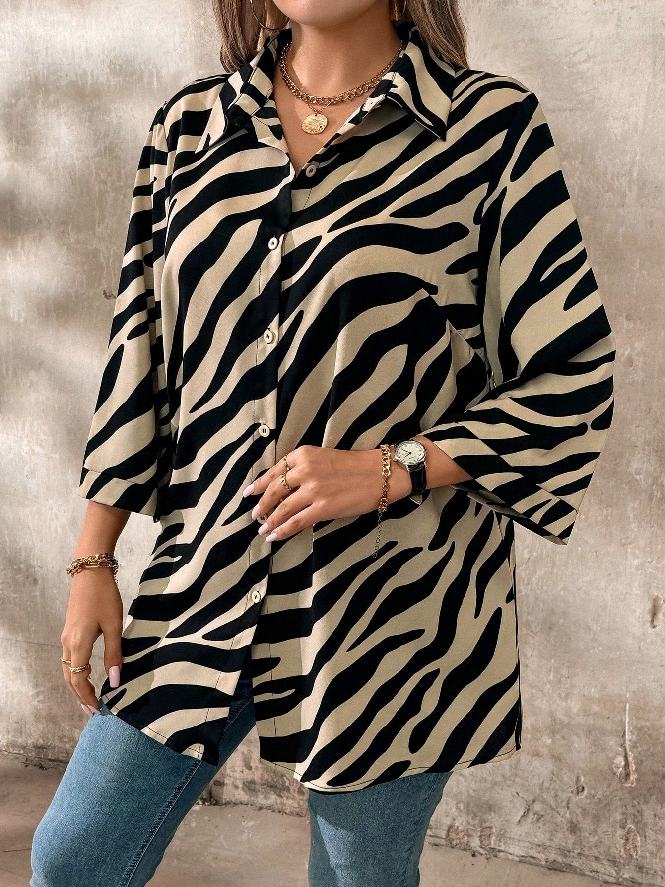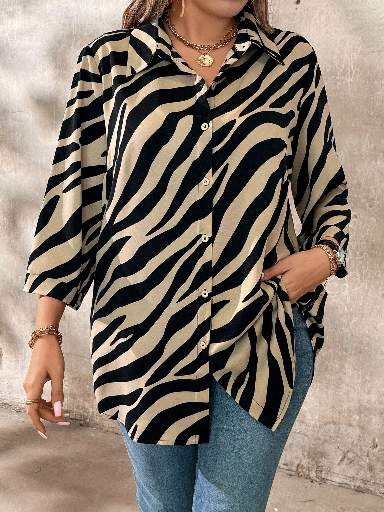 EMERY ROSE Plus Size Women's Spring And Autumn Long Sleeve Casual Zebra Print Shirt
