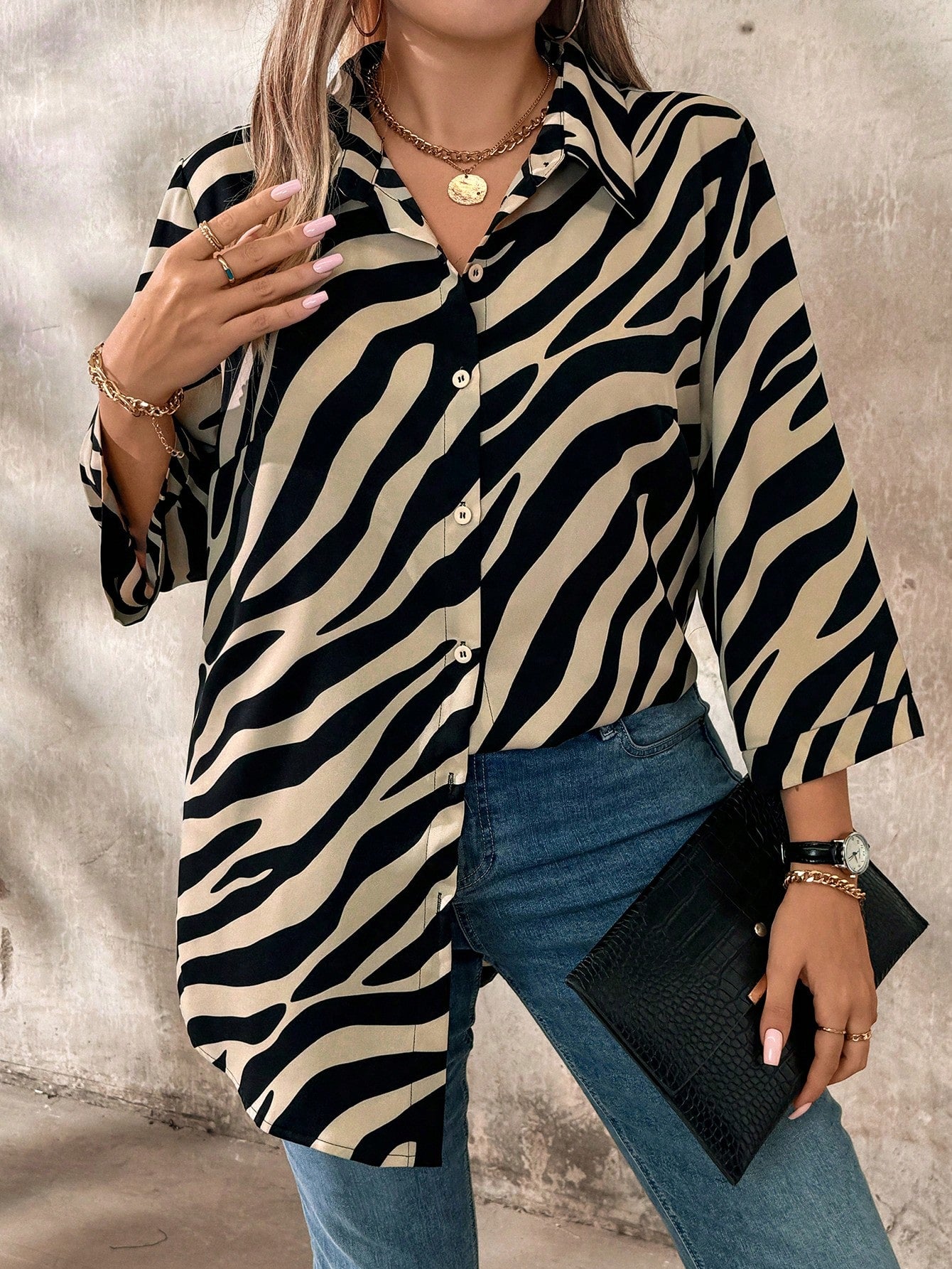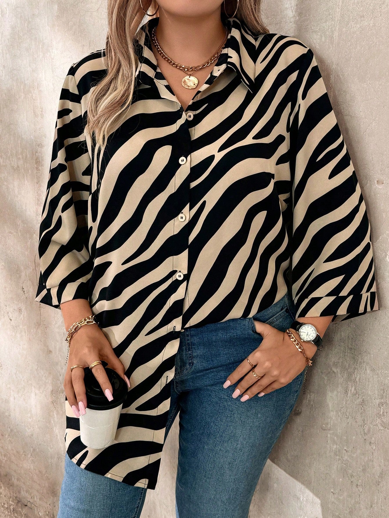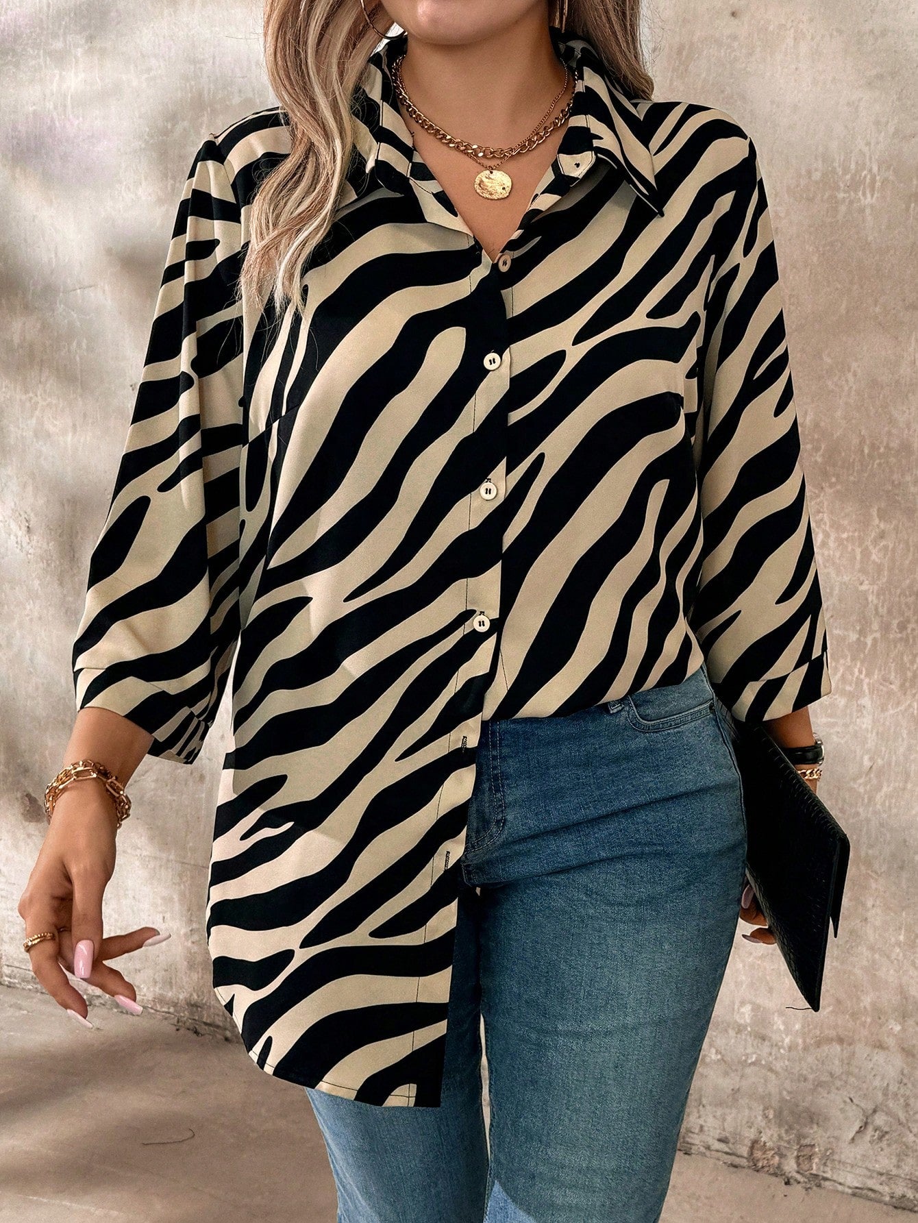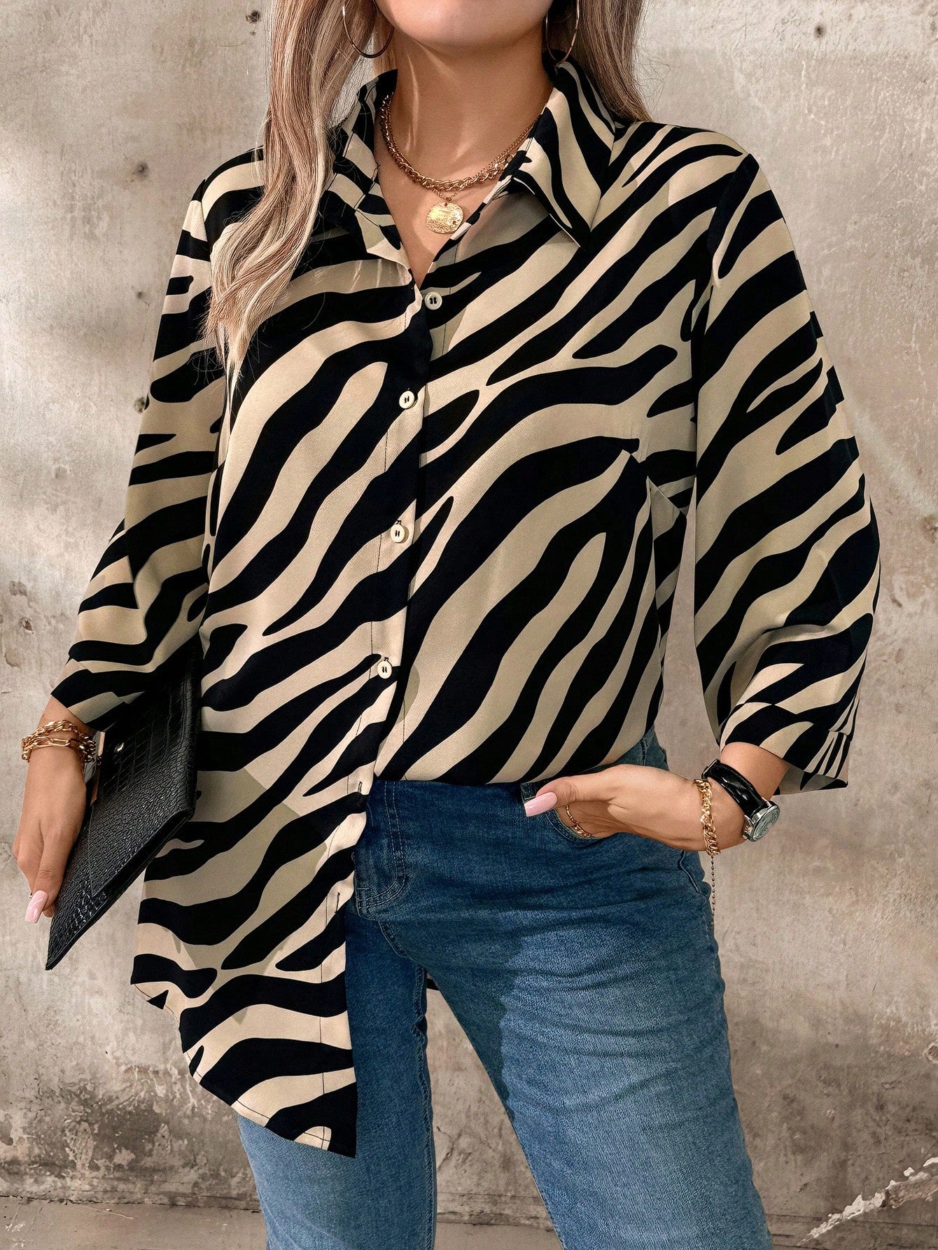 EMERY ROSE Plus Size Women's Spring And Autumn Long Sleeve Casual Zebra Print Shirt
