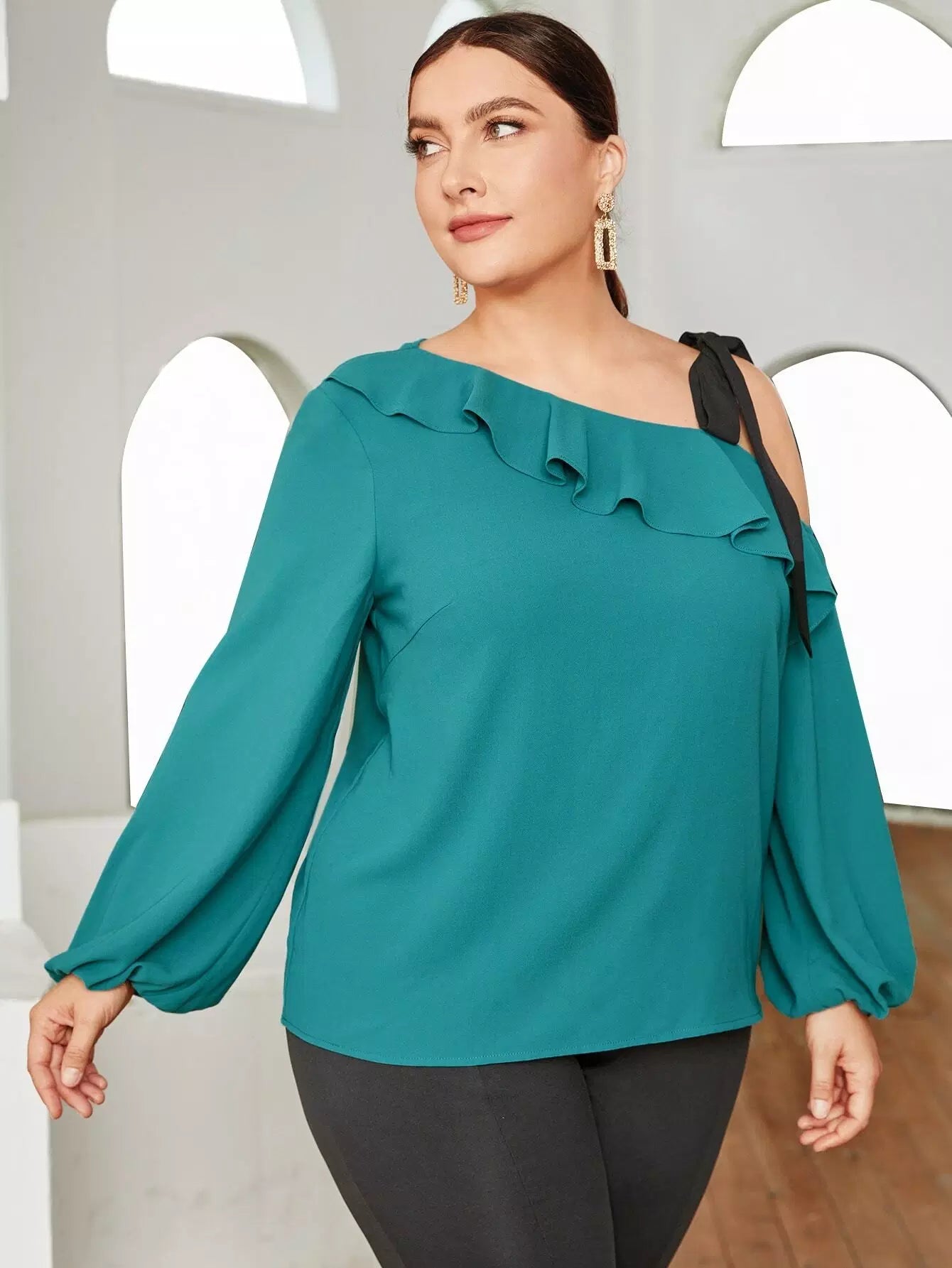 بلوزة برقبة غير متناظرة ذات حواف مكشكشة برقبة غير متناظرة