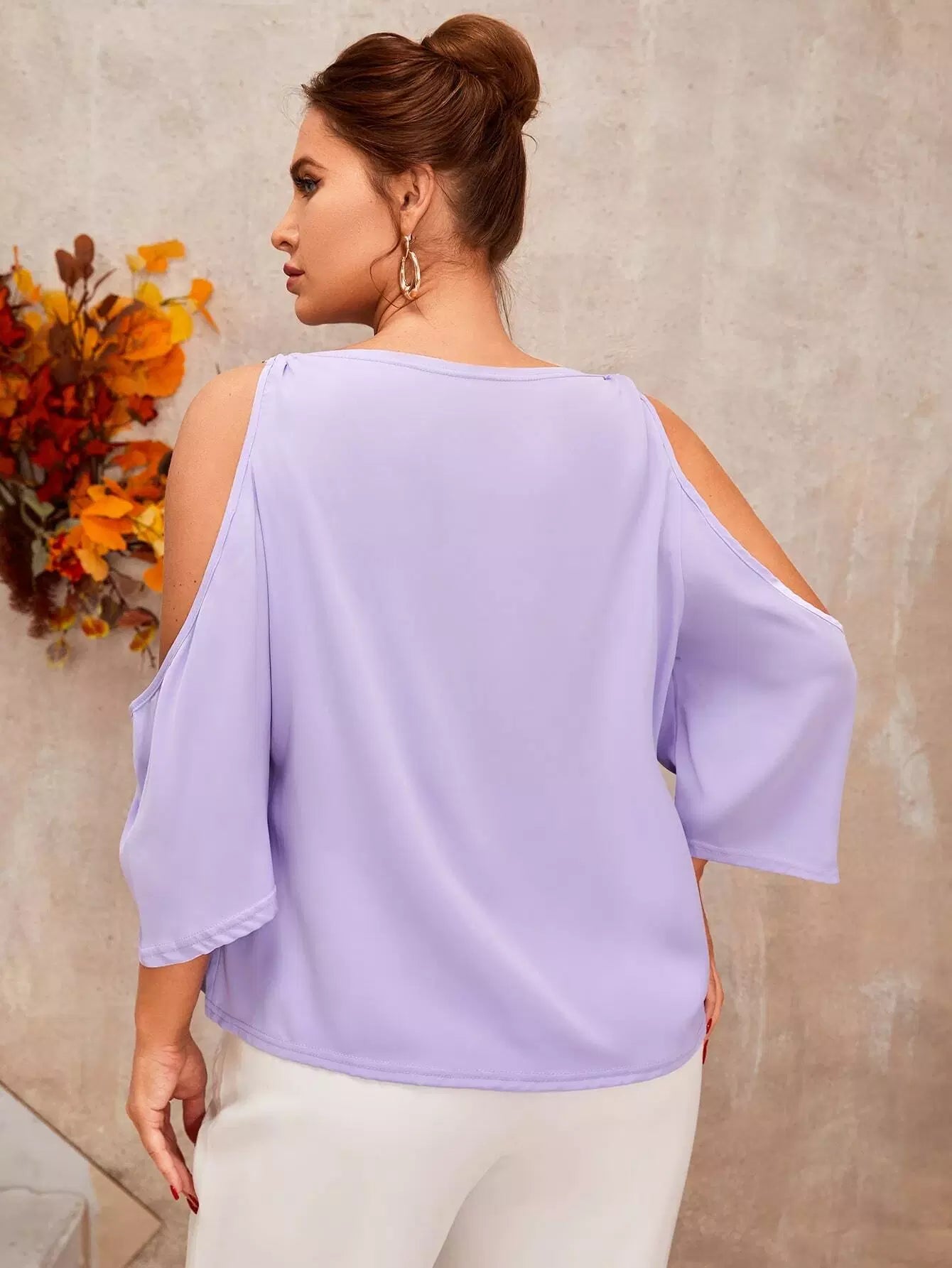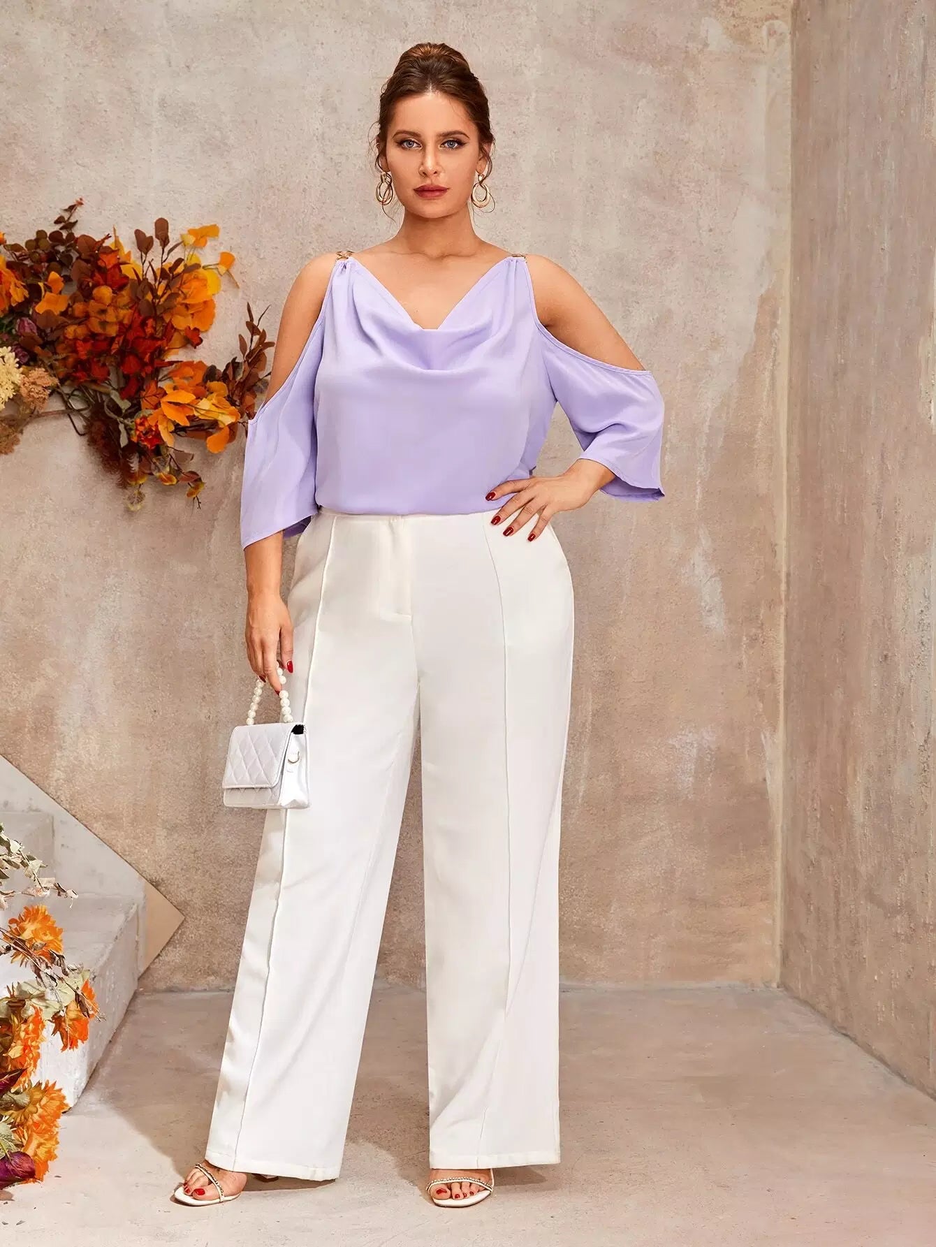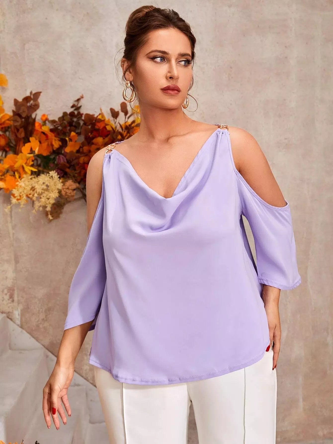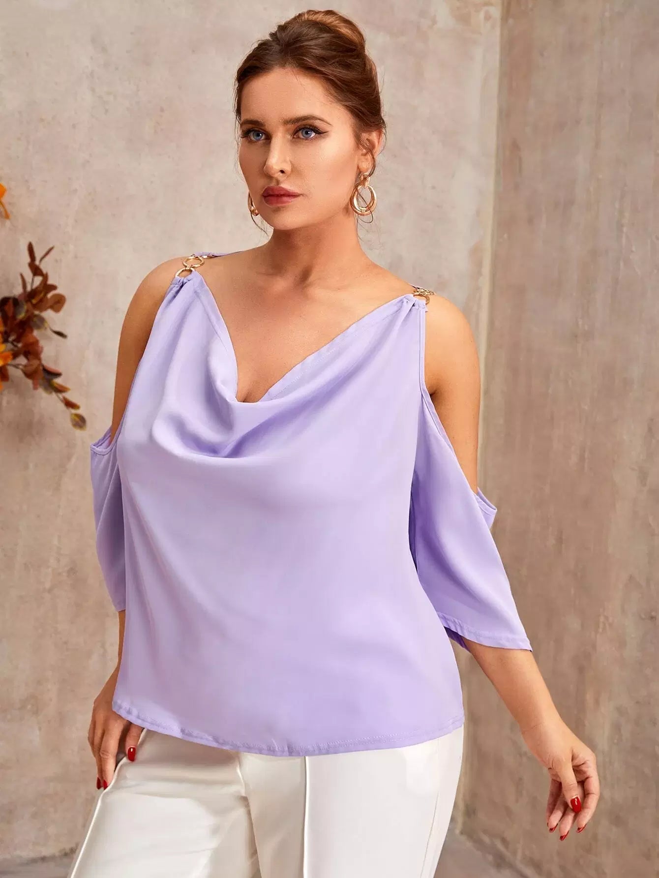 بلوزة بأكتاف باردة منسدلة من الأمام ومربوطة بسلسلة زائد