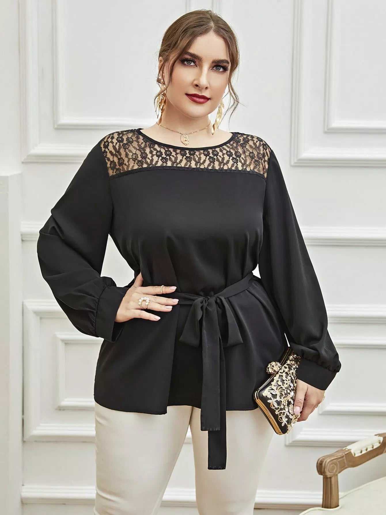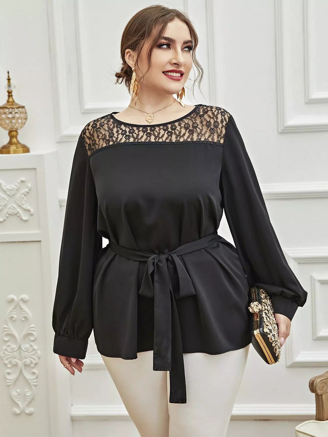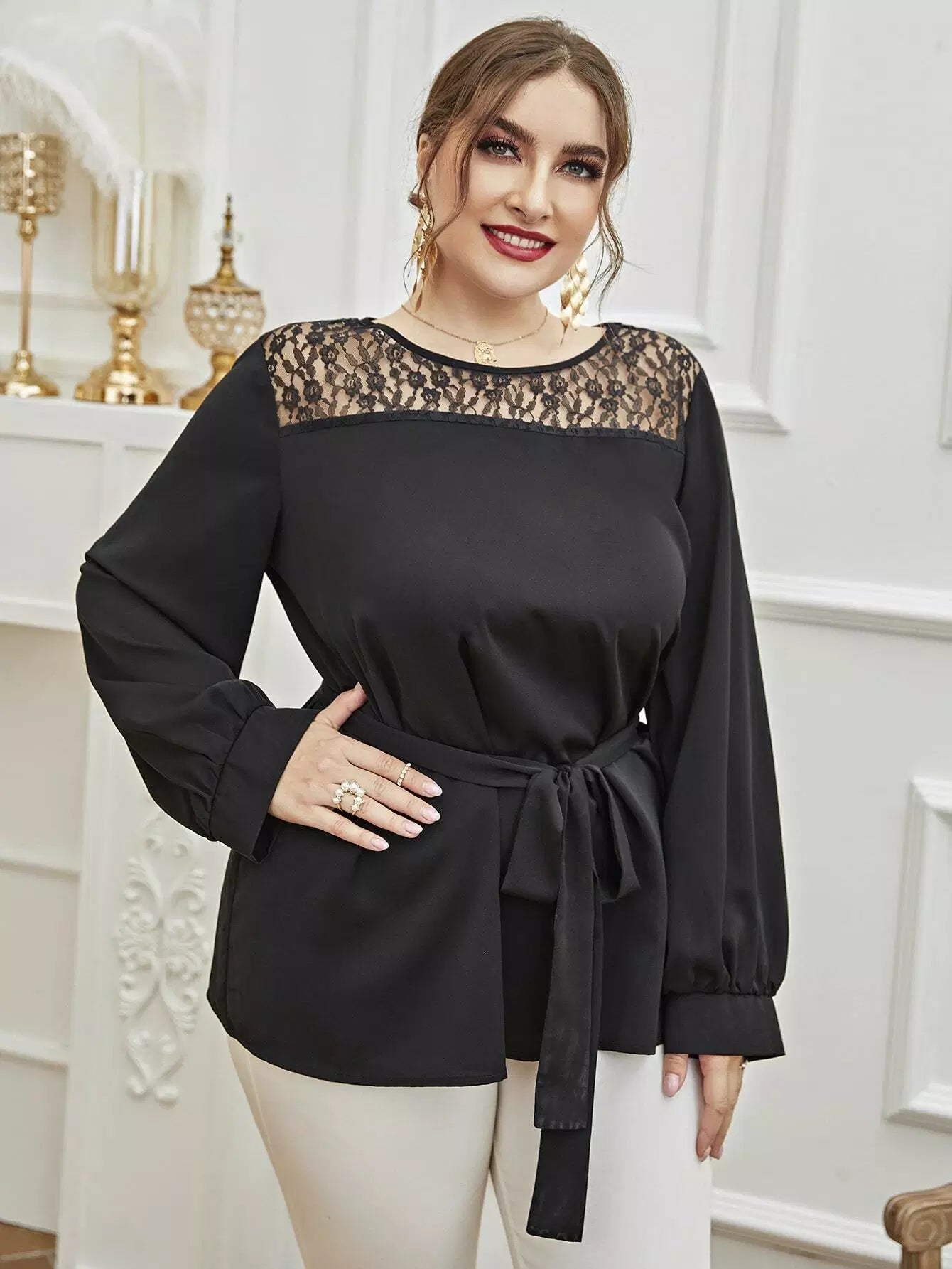 بالإضافة إلى بلوزة دانتيل متباينة بدون حزام