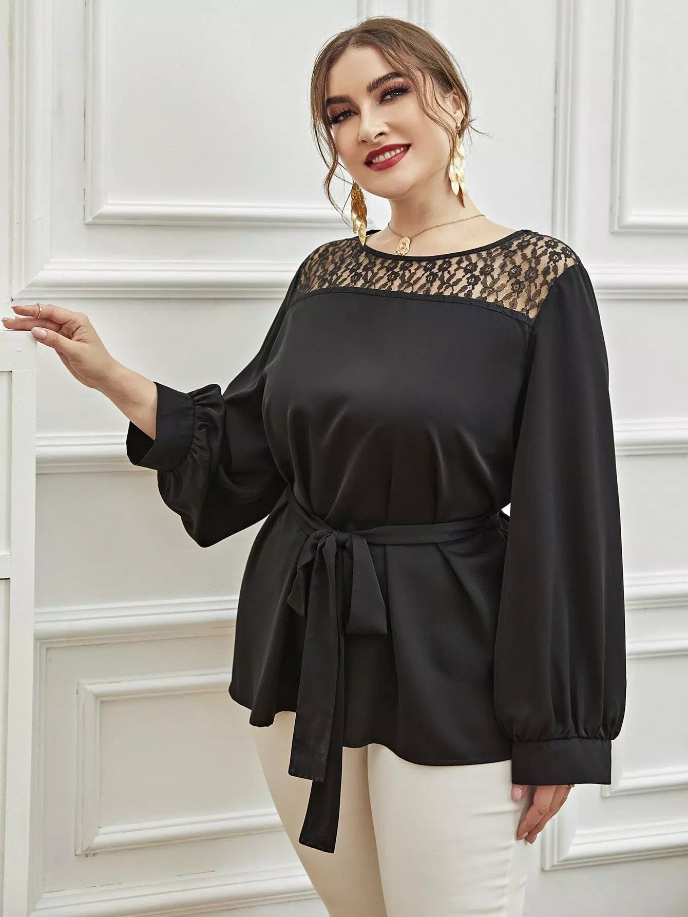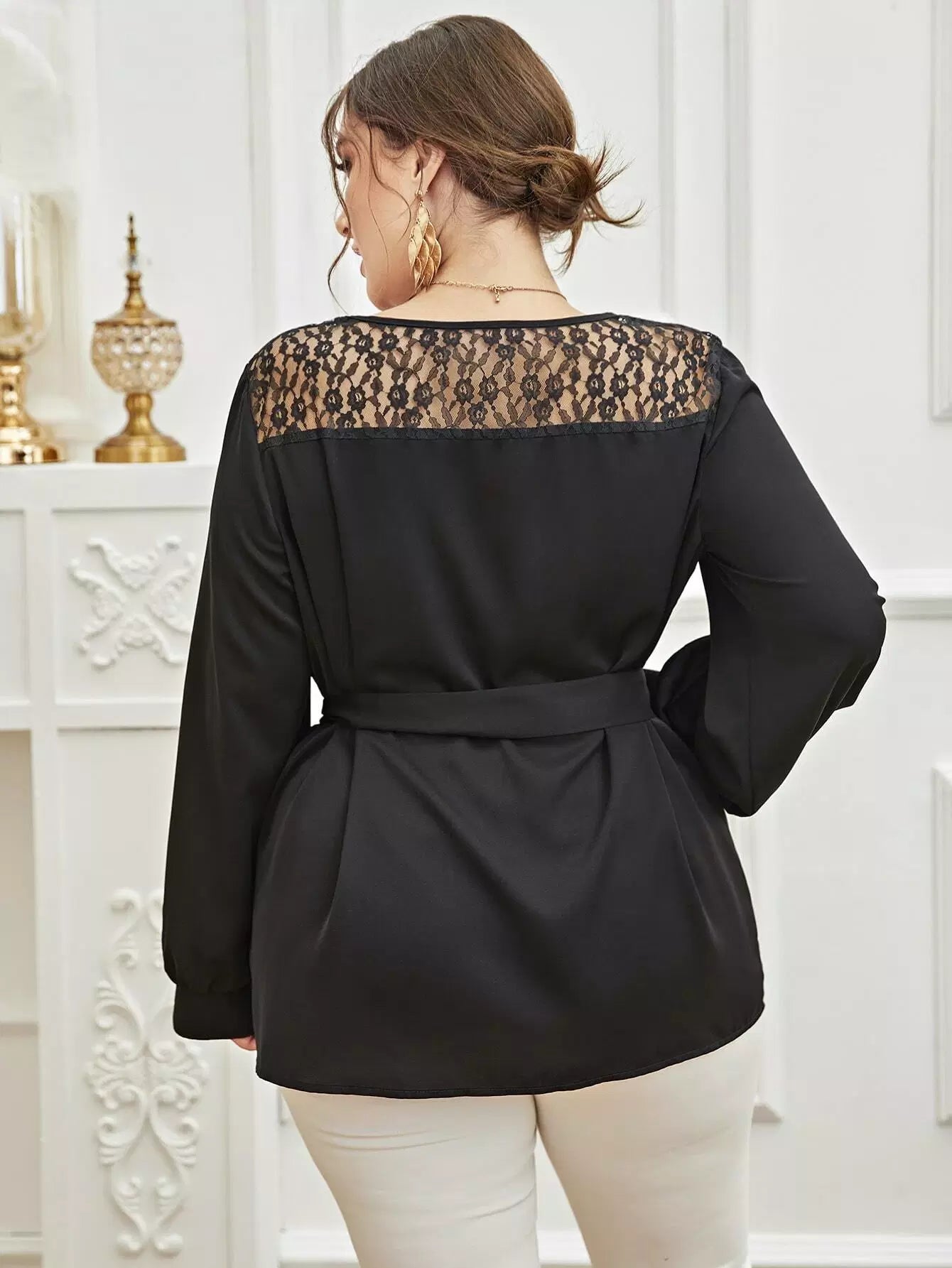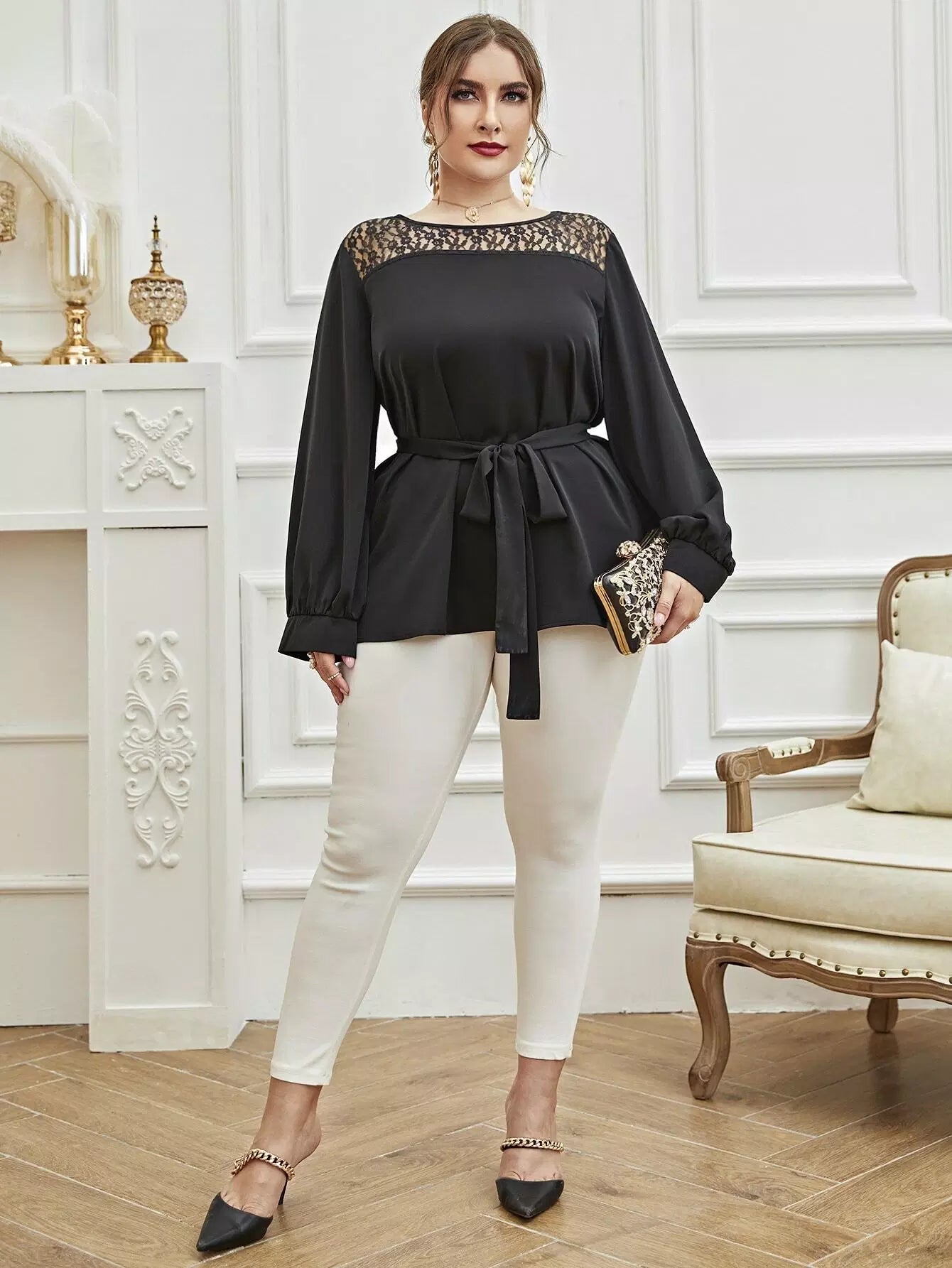 بالإضافة إلى بلوزة دانتيل متباينة بدون حزام