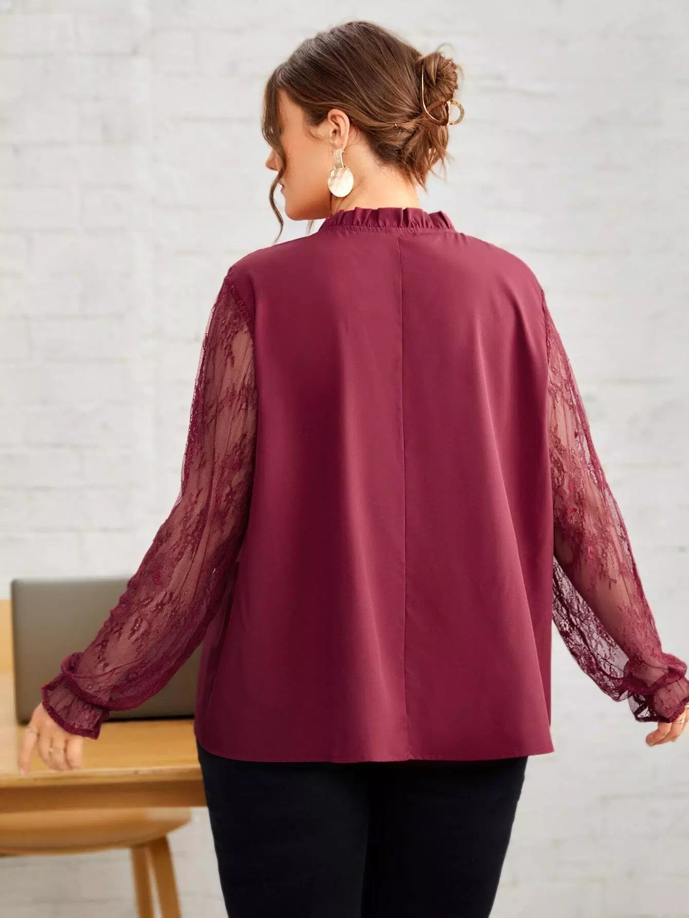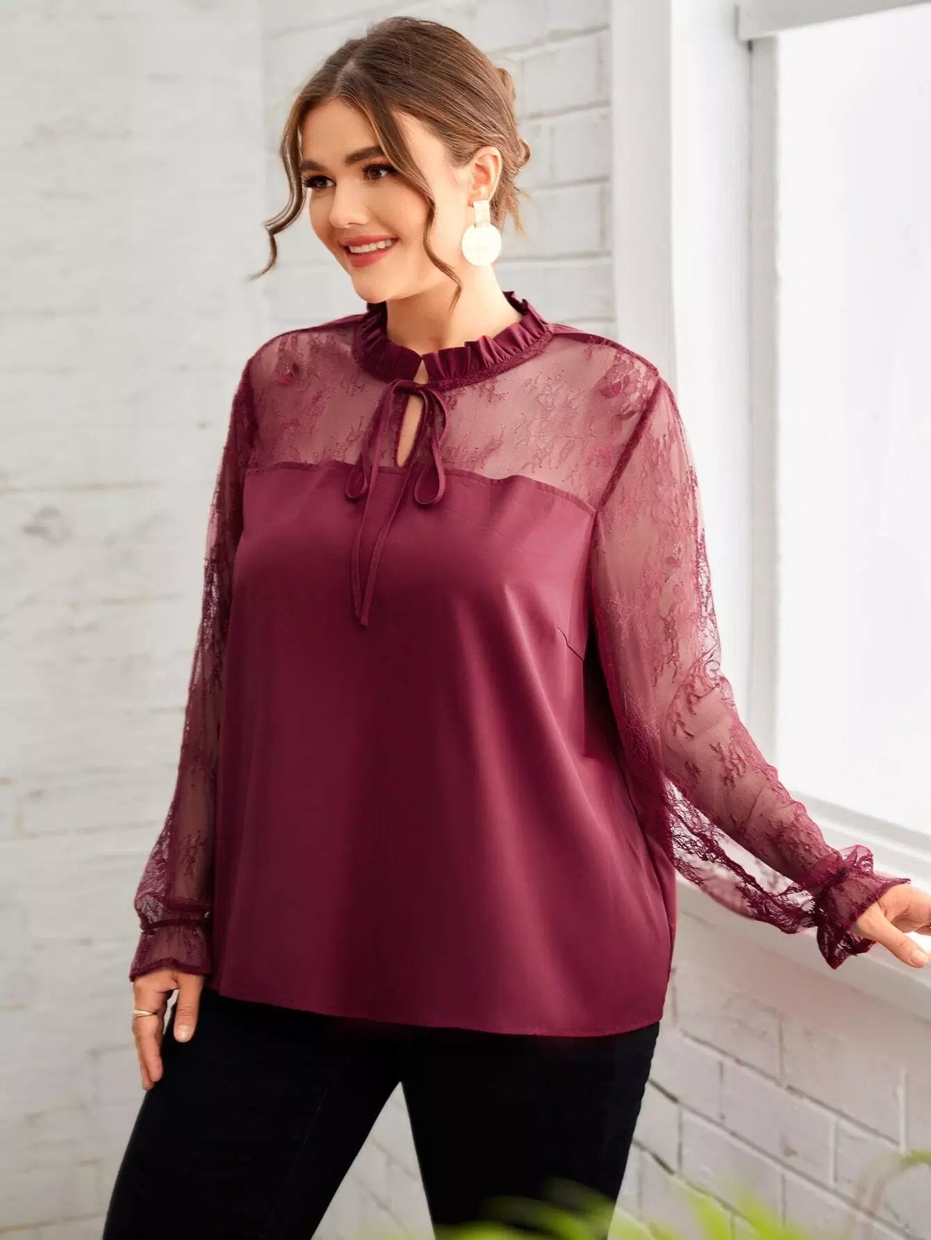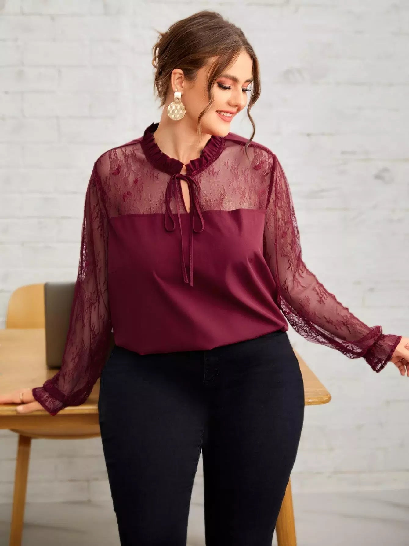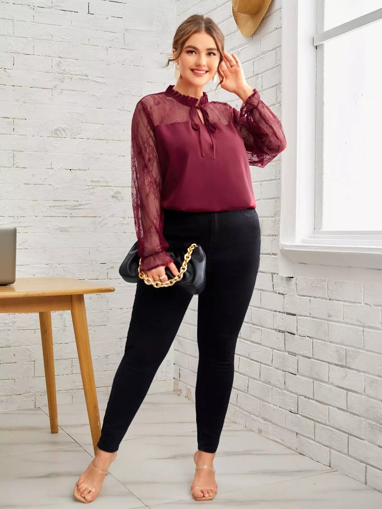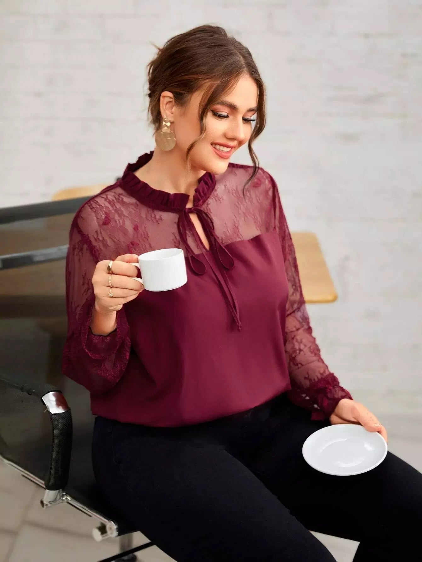 بلوزة برقبة من الدانتيل بلون بلون مغاير وربطة عنق من الدانتيل