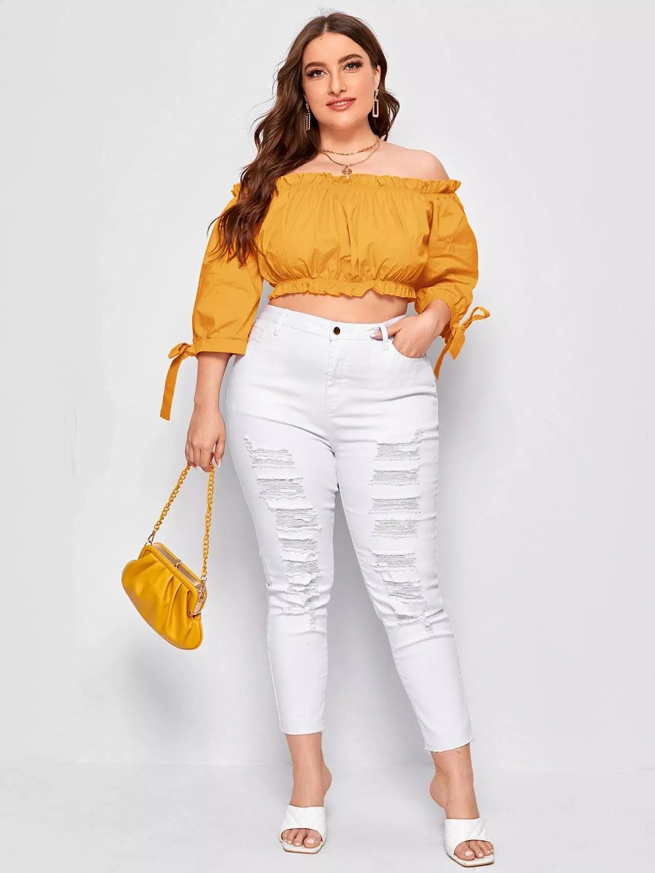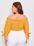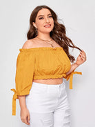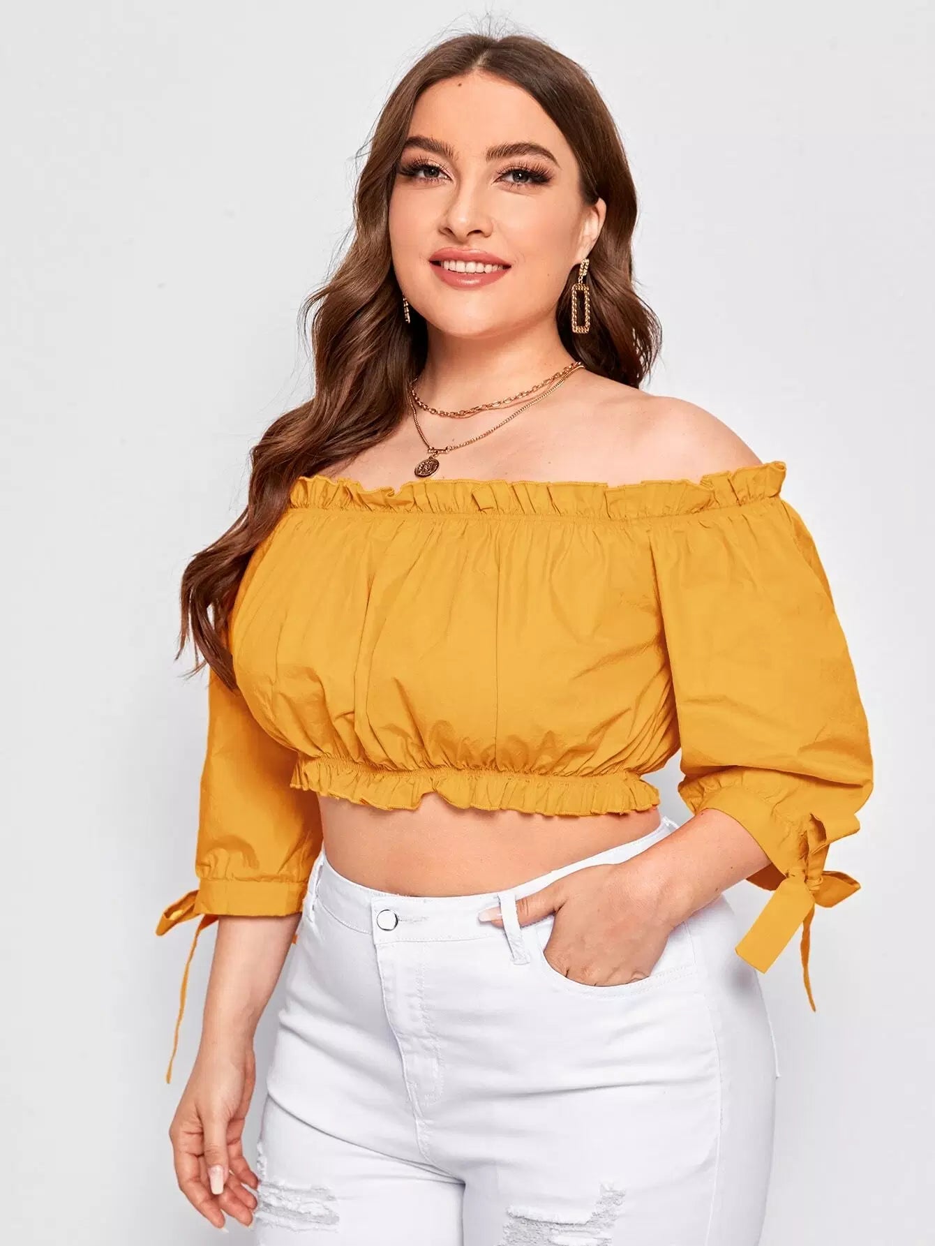 بلوزة قصيرة ذات أكمام مكشكشة مكشوفة الأكمام مكشوفة الأكتاف ذات عقدة
